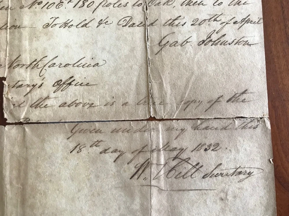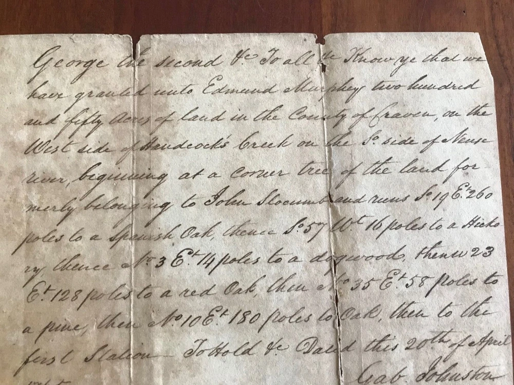 Land Grant to Edmund Murphy two hundred and fifty acres of land in the County of Craven on the West side of Handcock’s Creek on the South side of Neuse River, dated 20 April 1745 and signed by Gabriel Johnston and certification as a true copy on 18 th May 1832 by William Hill Secretary. Bottom section is detached and held together with a piece of tape on the backside (see pic).