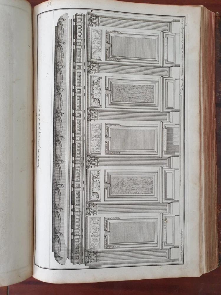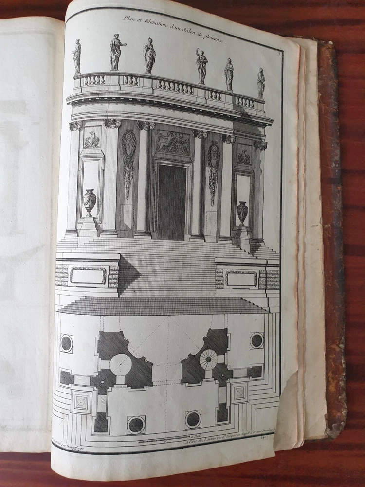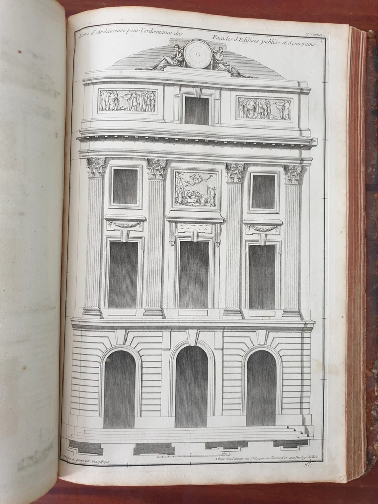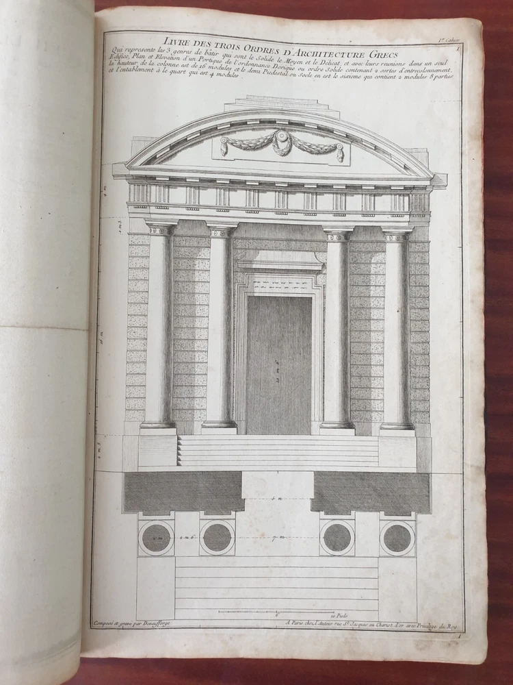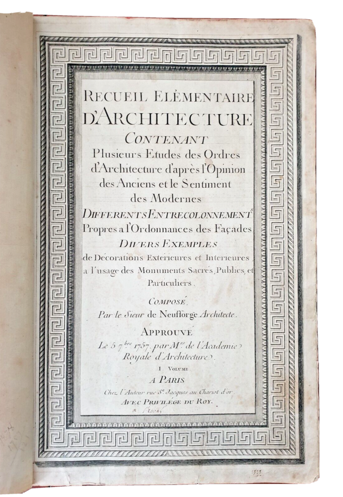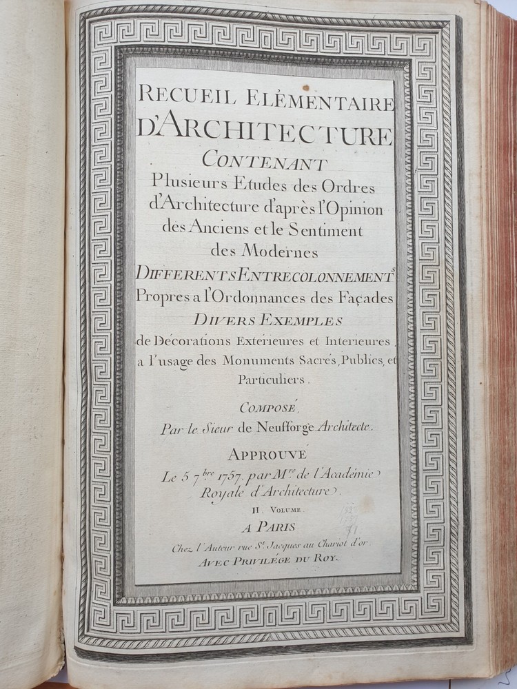 Title: Recueil Elémentaire d'Architecture contenant Plusieurs Etudes des Ordres d'Architecture d'après l'Opinion des Anciens et le Sentiment des Modernes. Author: NEUFFORGE, Jean François de (1714-1791) Publication: Paris, chez L’Auteur. Edition: 1757. Description: 390 X 290mm. 147 plates in total including titles , period leather binding. Jean-François de Neufforge (1714 - 1791) was a Belgian architect and engraver, known for his "Recueil elementaire d'architecture," a book of architectural engravings. The series of books on architecture, published in Paris between 1757 and 1780, contained 900 engravings depicting aspects of 18th century architecture, most of which Neufforge himself designed and engraved. The engravings cover the full range of buildings of his time - including facades, floor plans, doors, columns, vases, staircases, fireplaces and fences. The book was widely used by architects in the 18th century. Heavy rubbing of the binding, cracking of the leather of the binding near the spine, staining and rubbing on the pages in places (without affecting the content), rubbing of the page edges. Plate nr 141 with a tear. Please see pictures.