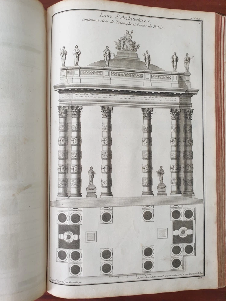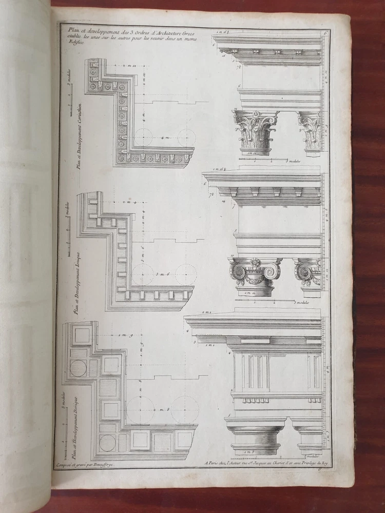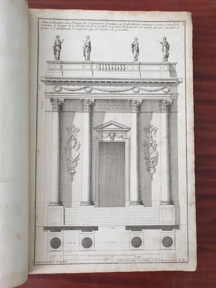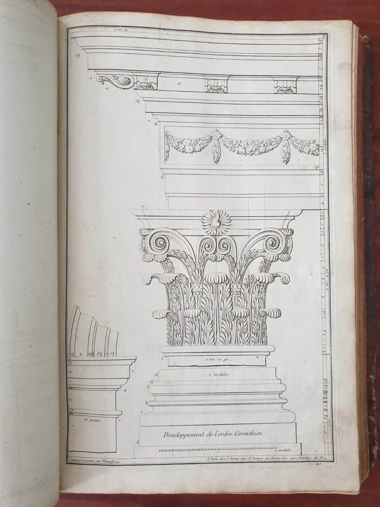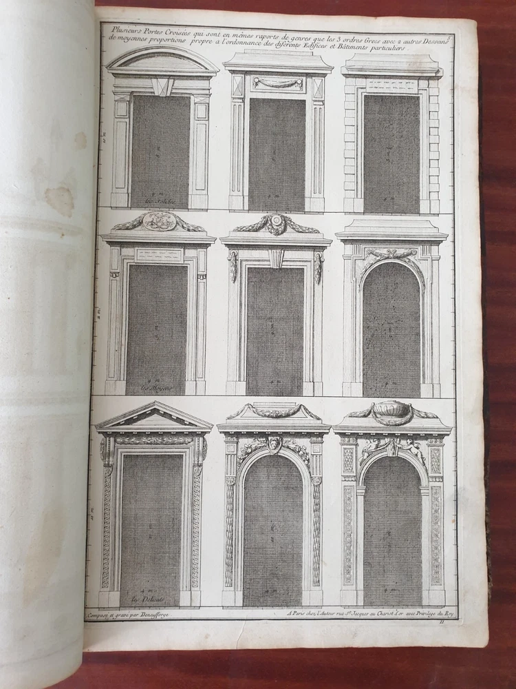 Title: Recueil Elémentaire d'Architecture contenant Plusieurs Etudes des Ordres d'Architecture d'après l'Opinion des Anciens et le Sentiment des Modernes. Author: NEUFFORGE, Jean François de (1714-1791) Publication: Paris, chez L’Auteur. Edition: 1757. Description: 390 X 290mm. 147 plates in total including titles , period leather binding. Jean-François de Neufforge (1714 - 1791) was a Belgian architect and engraver, known for his "Recueil elementaire d'architecture," a book of architectural engravings. The series of books on architecture, published in Paris between 1757 and 1780, contained 900 engravings depicting aspects of 18th century architecture, most of which Neufforge himself designed and engraved. The engravings cover the full range of buildings of his time - including facades, floor plans, doors, columns, vases, staircases, fireplaces and fences. The book was widely used by architects in the 18th century. Heavy rubbing of the binding, cracking of the leather of the binding near the spine, staining and rubbing on the pages in places (without affecting the content), rubbing of the page edges. Plate nr 141 with a tear. Please see pictures.