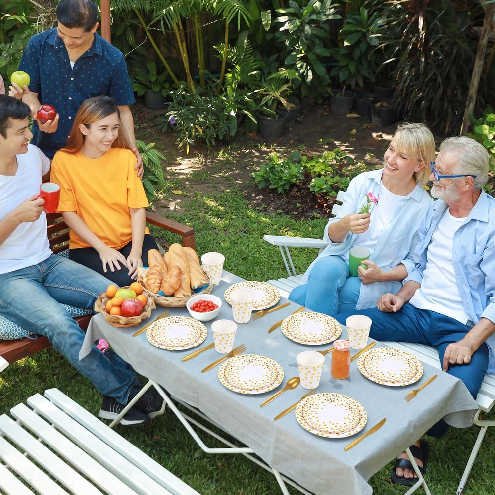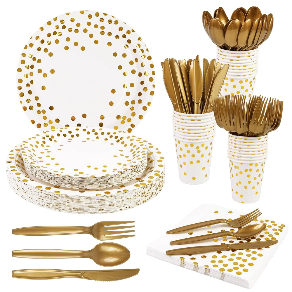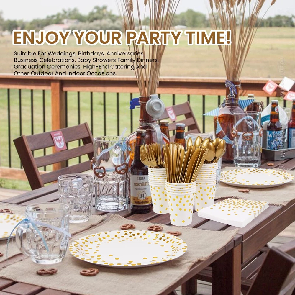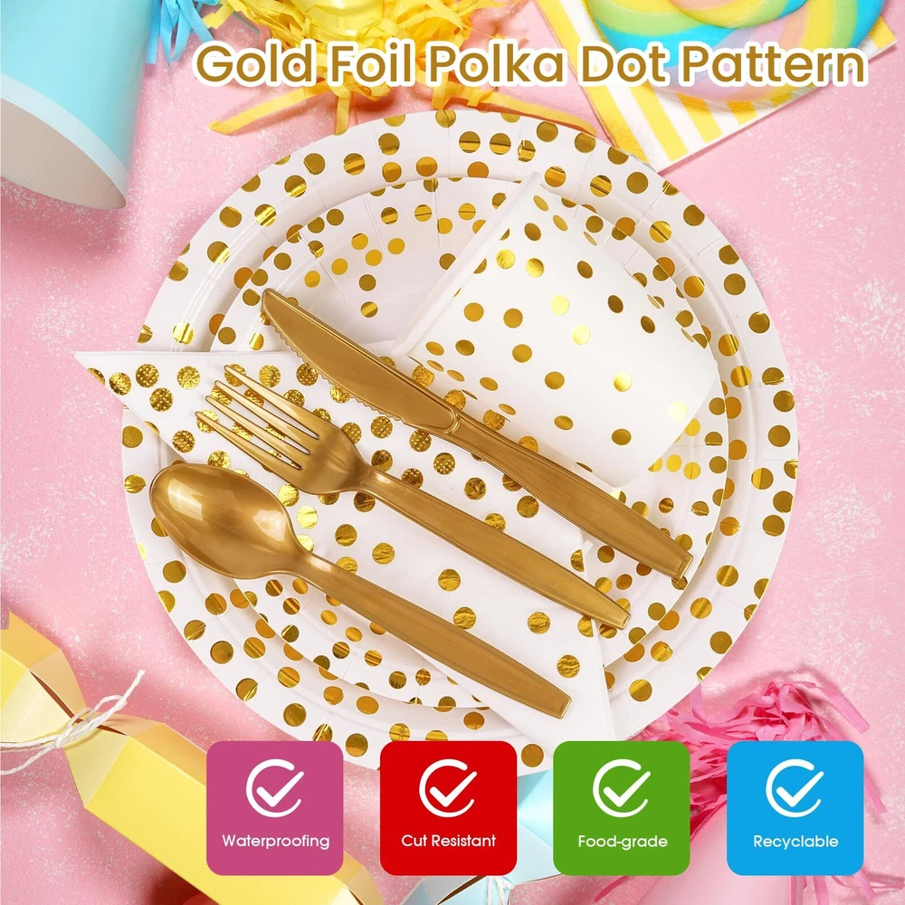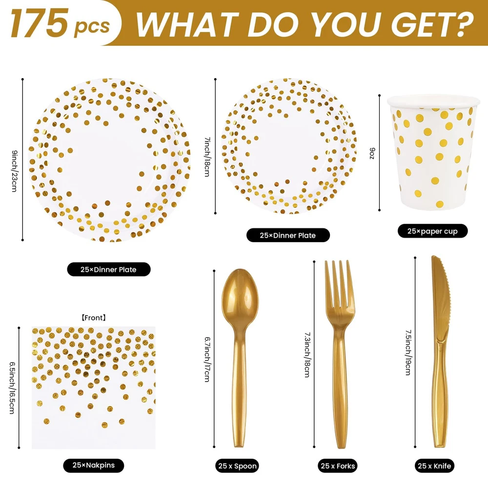 🎉EXQUISITE BIRTHDAY PARTY TABLEWARE SET:This white gold birthday party supplies set for up to 25 guests. Includes 25pcs 9 inch paper dinner plates, 25pcs 7 inch dessert plates, 25pcs Napkins, and 25 sets of utensils (knives, forks, spoons) for a total of 175 pieces.Enough to meet your party needs, it's a great choice for your party tableware! 🎉CLASSIC GOLD FOIL POLKA DOT DESIGN:Our white and gold dot party paper plates,napkins and cups are decorated with gold polka dots. Very stylish and beautiful with gorgeous and charming colors. Your guests will love this elegant and premium design. 🎉HIGH QUALITY MATERIALS:Our white and gold dot paper plates are made of 350gsm thickened eco-friendly paper, not easy to break or tear, durable, safe and non-, bpa free biodegradable, convenient and environmentally friendly, no need to worry about harming the environment. These napkins and cups are made of food water-based ink, highly absorbent and very skin-friendly.Knives, forks and spoons are made of high quality plastic, not easy to bend or break. 🎉SAVE TIME AND ENJOY THE PARTY:All party tableware is disposable.This gold dot disposable party dinnerware set can be thrown away after use for easy cleanup after the party, so you don't need to worry about cleanup and environmental issues! Gives you and your guests more time to enjoy the party! 🎉SUITABLE FOR ALL OCCASIONS:This disposable party tableware set is suitable for any occasions, including weddings, engagement parties, birthday parties, children's parties, anniversaries, baby shower, banquets, reunions, business meetings, graduation parties, family dinners, holiday gatherings and other occasions.