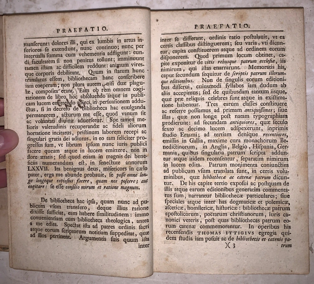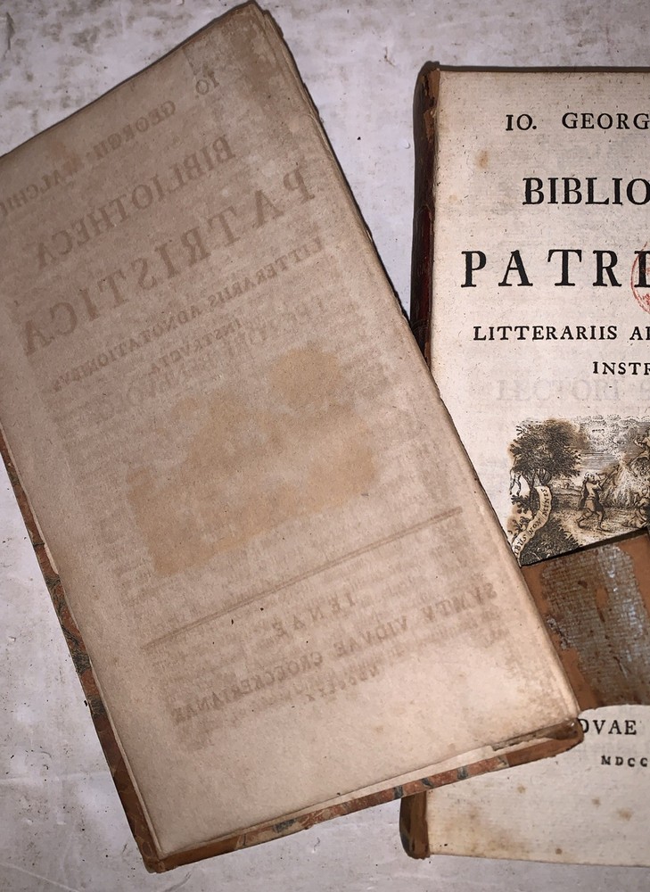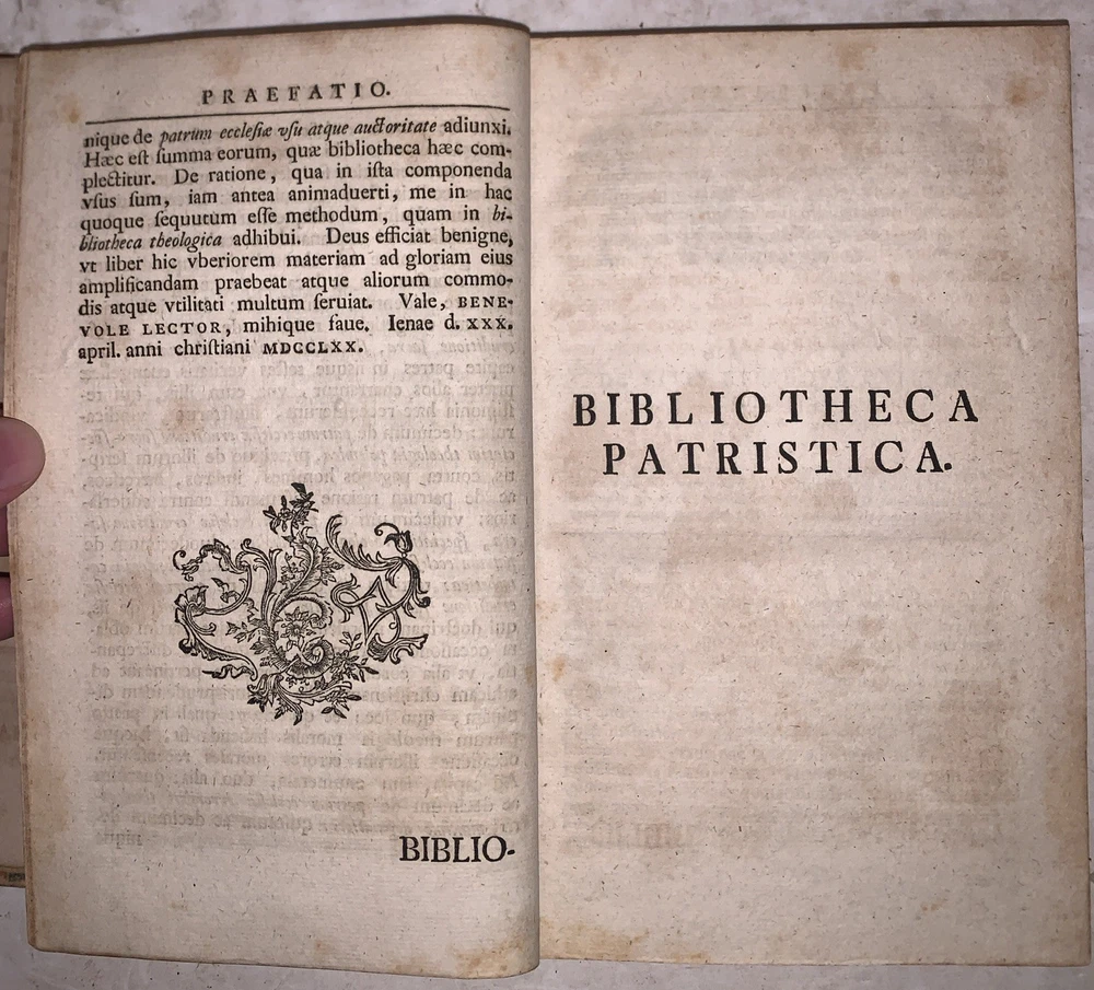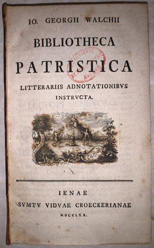 [Walch, Johann Georg] Bibliotheca Patristica Litterariis Adnotationibus Instructa Ienae [Jena, Germany]: Sumtu Viduae Croeckerianae 1770 First Edition Octavo, vi, 582, [26] pages, bound in quarter leather over marbled boards. Spine lettered in gilt. Text in Latin. Top board and front free endpapers detached with a piece of tape attempting to repair the book. Rear hinge cracked with board hanging on by a thread. Formerly in an institutional library with some of the typical markings. Some rubbing and wear, scuffs, some discoloration and foxing, else in good condition. Bibliotheca Patristica Litterariis Adnotationibus Instructa (Ienae, 1770) is a major eighteenth-century bibliographical survey of early Christian literature compiled by the Lutheran theologian Johann Georg Walch (1693–1775), professor at the University of Jena. Conceived as a comprehensive “library” of patristic writings, the work methodically catalogs the known editions, translations, and critical studies of the Church Fathers from the apostolic age through the early medieval period, accompanied by Walch’s scholarly annotations. Written in Latin and printed by Johann Michael Teubner, the Bibliotheca Patristica reflects the Enlightenment’s drive to organize and critically assess theological knowledge while preserving the authority of classical sources. Long valued by theologians and bibliographers, it remains an important landmark in the history of patristic scholarship and eighteenth-century German academic printing. If you have any questions, feel free to ask, and don't forget to check out my other listings.