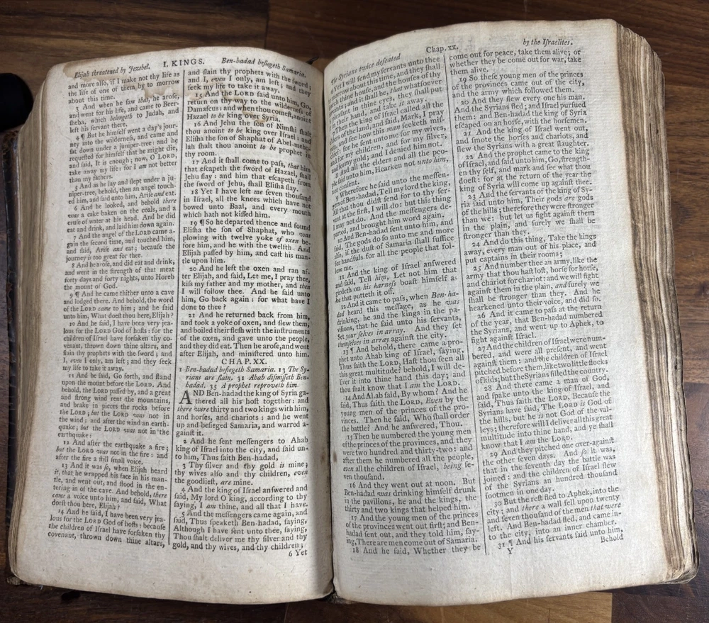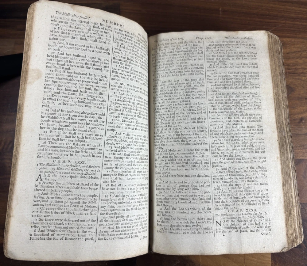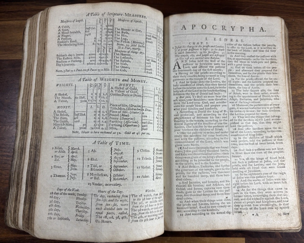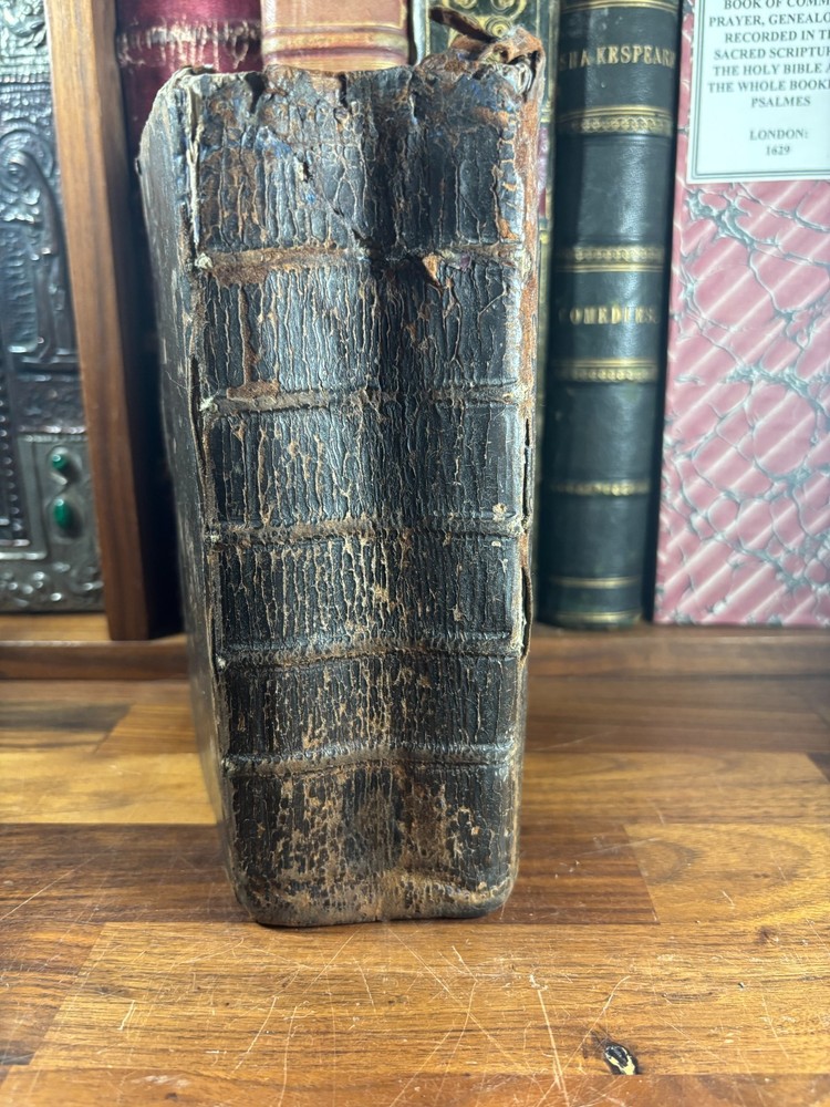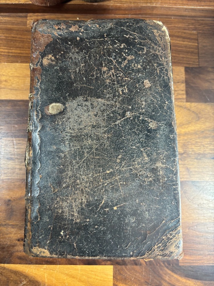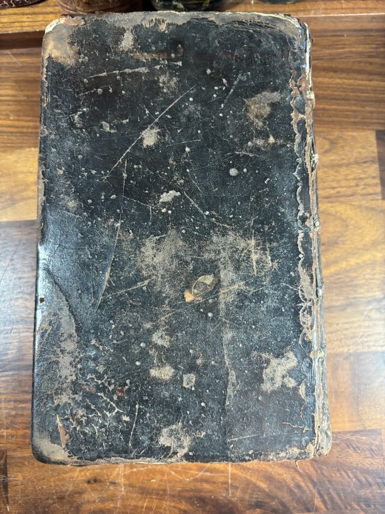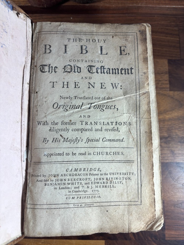 Offered here is an authentic 18th-century King James Bible printed in Cambridge in 1773, during the reign of King George III and just a few years before the American Revolution. This Bible was printed by John Archdeacon, Printer to the University of Cambridge, and represents one of the official authorized printings of the King James Version used throughout Britain and its colonies. The title page reads: “The Holy Bible, containing the Old Testament and the New: Newly Translated out of the Original Tongues, and with the former translations diligently compared and revised, by His Majesty’s special command. Appointed to be read in churches. Cambridge: Printed by John Archdeacon, Printer to the University; and sold by John Beecroft, John Rivington, Benjamin White, and Edward Dilly in London; and T. & J. Merrill in Cambridge. 1773.” This copy contains the Old Testament, Apocrypha, and New Testament, as well as additional reference tables typical of 18th-century Bibles, including tables of scripture measures, weights, money, and time. Binding The Bible retains a period calf leather binding with raised spine bands, typical of late-18th-century English bookbinding. The leather shows significant honest wear consistent with over two centuries of use and handling. Features include: Original calf leather boards Raised spine bands Remnants of clasp hardware on the covers Hand-sewn text block Herbert 1230 The binding shows expected wear including cracking, edge wear, and surface scuffing but remains structurally intact and historically appropriate. Interior Classic double-column King James Bible layout Early typography with the long “s” (ſ) used in 18th-century printing Chapter summaries and marginal references Includes the Apocrypha, often missing in later editions Additional tables of biblical measures and chronology Pages display normal age toning and occasional marks but remain highly readable. Ownership Inscription A handwritten inscription near the end of the book appears to read: “Thos. Baker Booker near Stockton on the Moor 1814” This likely records ownership by Thomas Baker in the Stockton-on-Tees region of England in 1814, about forty years after the Bible was printed. The handwriting and ink are consistent with early 19th-century quill pen writing and provide a fascinating glimpse into the book’s early history and use. Historical Context This Bible was printed in 1773, a remarkable moment in world history. During this period: King George III ruled Great Britain and its growing empire. The American colonies were on the verge of revolution, with tensions rising that would lead to the American Revolutionary War in 1775. Britain was entering the early phases of the Industrial Revolution, transforming society through advances in manufacturing, trade, and transportation. The King James Bible remained the standard English Bible, widely used in churches, homes, and schools across Britain and the colonies. Books like this were central to daily life. Families often read from them regularly, recorded important events within them, and passed them down through generations. Surviving copies with signs of long use—such as inscriptions and worn bindings—offer a direct connection to the religious and domestic life of the 18th and early 19th centuries. By the time the owner’s inscription was added in 1814, Europe had just witnessed the fall of Napoleon and the end of decades of conflict. This Bible had already been in circulation for more than forty years, demonstrating how such volumes served multiple generations. Condition notes: Heavy wear to leather binding with cracking and scuffing Corners and edges worn Interior pages generally intact and legible Age toning and occasional stains Handwritten ownership inscription dated 1814 Please review photographs carefully as they form part of the description. Significance This Bible represents a genuine artefact from the late 18th century, produced by one of the most important printing centres in England. Cambridge Bibles from this period were printed under royal authorization and distributed widely throughout Britain and the English-speaking world. With its 1773 printing date, early ownership inscription, and well-preserved interior, this volume offers collectors and historians a tangible connection to the religious and cultural life of the 18th and early 19th centuries. Dimensions: Weight - 1.29KG Height - 21.5cm Width - 14.5cm Thickness - 7.5cm