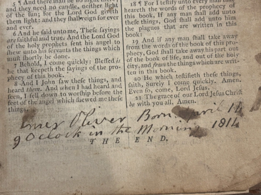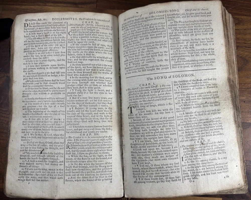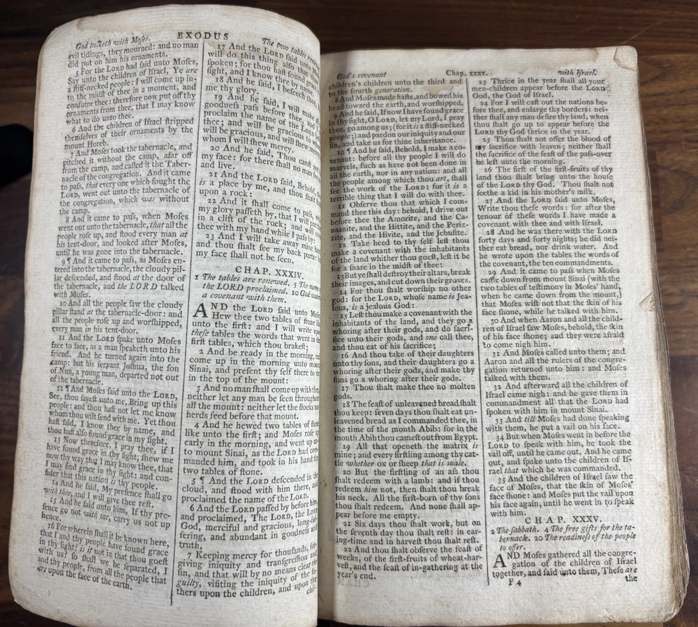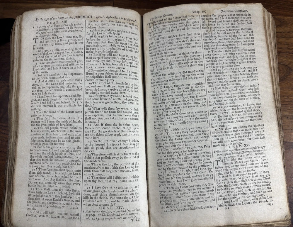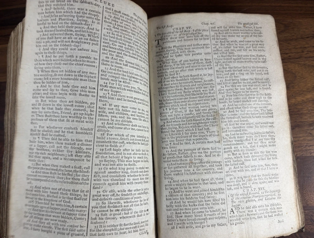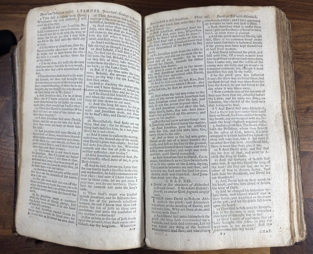 Offered here is an authentic 18th-century King James Bible printed in Cambridge in 1773, during the reign of King George III and just a few years before the American Revolution. This Bible was printed by John Archdeacon, Printer to the University of Cambridge, and represents one of the official authorized printings of the King James Version used throughout Britain and its colonies. The title page reads: “The Holy Bible, containing the Old Testament and the New: Newly Translated out of the Original Tongues, and with the former translations diligently compared and revised, by His Majesty’s special command. Appointed to be read in churches. Cambridge: Printed by John Archdeacon, Printer to the University; and sold by John Beecroft, John Rivington, Benjamin White, and Edward Dilly in London; and T. & J. Merrill in Cambridge. 1773.” This copy contains the Old Testament, Apocrypha, and New Testament, as well as additional reference tables typical of 18th-century Bibles, including tables of scripture measures, weights, money, and time. Binding The Bible retains a period calf leather binding with raised spine bands, typical of late-18th-century English bookbinding. The leather shows significant honest wear consistent with over two centuries of use and handling. Features include: Original calf leather boards Raised spine bands Remnants of clasp hardware on the covers Hand-sewn text block Herbert 1230 The binding shows expected wear including cracking, edge wear, and surface scuffing but remains structurally intact and historically appropriate. Interior Classic double-column King James Bible layout Early typography with the long “s” (ſ) used in 18th-century printing Chapter summaries and marginal references Includes the Apocrypha, often missing in later editions Additional tables of biblical measures and chronology Pages display normal age toning and occasional marks but remain highly readable. Ownership Inscription A handwritten inscription near the end of the book appears to read: “Thos. Baker Booker near Stockton on the Moor 1814” This likely records ownership by Thomas Baker in the Stockton-on-Tees region of England in 1814, about forty years after the Bible was printed. The handwriting and ink are consistent with early 19th-century quill pen writing and provide a fascinating glimpse into the book’s early history and use. Historical Context This Bible was printed in 1773, a remarkable moment in world history. During this period: King George III ruled Great Britain and its growing empire. The American colonies were on the verge of revolution, with tensions rising that would lead to the American Revolutionary War in 1775. Britain was entering the early phases of the Industrial Revolution, transforming society through advances in manufacturing, trade, and transportation. The King James Bible remained the standard English Bible, widely used in churches, homes, and schools across Britain and the colonies. Books like this were central to daily life. Families often read from them regularly, recorded important events within them, and passed them down through generations. Surviving copies with signs of long use—such as inscriptions and worn bindings—offer a direct connection to the religious and domestic life of the 18th and early 19th centuries. By the time the owner’s inscription was added in 1814, Europe had just witnessed the fall of Napoleon and the end of decades of conflict. This Bible had already been in circulation for more than forty years, demonstrating how such volumes served multiple generations. Condition notes: Heavy wear to leather binding with cracking and scuffing Corners and edges worn Interior pages generally intact and legible Age toning and occasional stains Handwritten ownership inscription dated 1814 Please review photographs carefully as they form part of the description. Significance This Bible represents a genuine artefact from the late 18th century, produced by one of the most important printing centres in England. Cambridge Bibles from this period were printed under royal authorization and distributed widely throughout Britain and the English-speaking world. With its 1773 printing date, early ownership inscription, and well-preserved interior, this volume offers collectors and historians a tangible connection to the religious and cultural life of the 18th and early 19th centuries. Dimensions: Weight - 1.29KG Height - 21.5cm Width - 14.5cm Thickness - 7.5cm