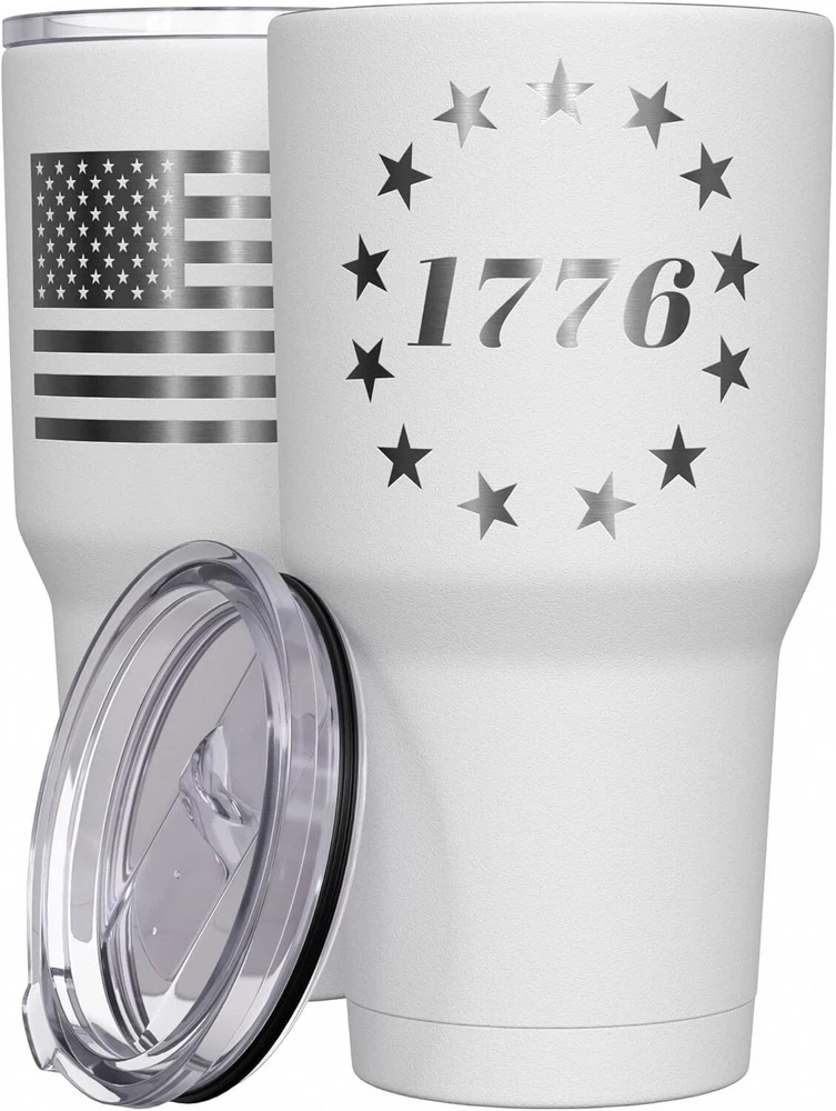 Tea and coffee travel mug - This printed American flag tumbler is available in a capacity of 30 fl oz and is the perfect vacuum-insulated stainless steel tumbler for drinking your favorite beverage on the go. The vacuum construction keeps the American flag coffee mug well insulated and your drink hotter for longer. Patriotic design - Each patriotic tumbler is emblazoned with our 1776 Betsy Ross Flag design on one side and a proud USA flag on the other. Show your pride in your country every time you sip your morning coffee from your favorite American flag mug. High quality insulation - Keep your cold drinks chilled for up to 24 hours and hot drinks steaming for up to 6 hours with our double vacuum insulated tumbler. This 1776 coffee mug features double-walled insulation, so you can enjoy your favorite beverage at the perfect temperature anytime, anywhere. Made in the USA - Crafted to last a lifetime, our exclusive American flag tumbler for men has been proudly laser engraved right here in the USA in Las Vegas, Nevada. This robust double insulated tumbler can easily handle daily use on long car rides, business trips, or to and from the office. Maximum spill protection - Our stainless steel tumbler with lid is lined with copper. The clear lid included with our 1776 tumbler prevents spills or leaks, so you never need to worry about drink stains on shirts or tables ever again.