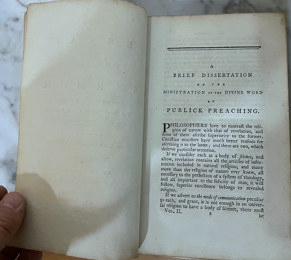 1779 - CLAUDE'S ESSAY ON A COMPOSITION OF A SERMON - REV JOHN CLAUDE - ENGLISH Volume II Author: Reverend John Claude, Minister of the French Reformed Church at Charenton Translated by Robert Robinson Printed by Francis Hotson , 1779, leather cover Condition: Book is complete, some surface wear on the cover and toning on pages, some old pen markings I hope to make this a very happy and smooth transaction. Feel free to contact me with any questions