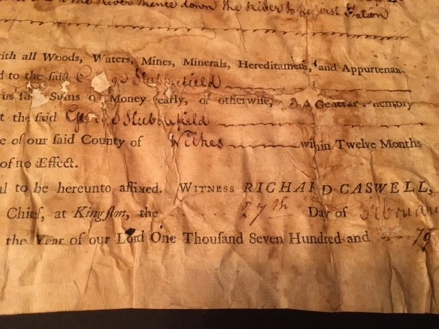 Land grant to George Stubblefield for a tract of land containing “One [torn and unreadable]” acres in Wilkes County, at Kingston 27 February 1779, recorded December Term 1779; SIGNED by Richard Caswell, 1st Governor of North Carolina. Also signed by William Lenoir. Tape repairs to verso. SCARCE.