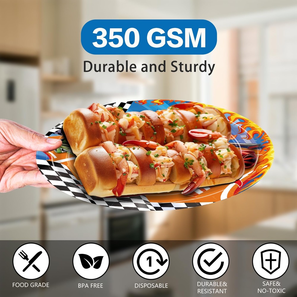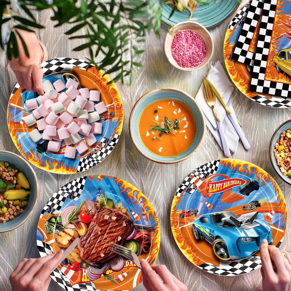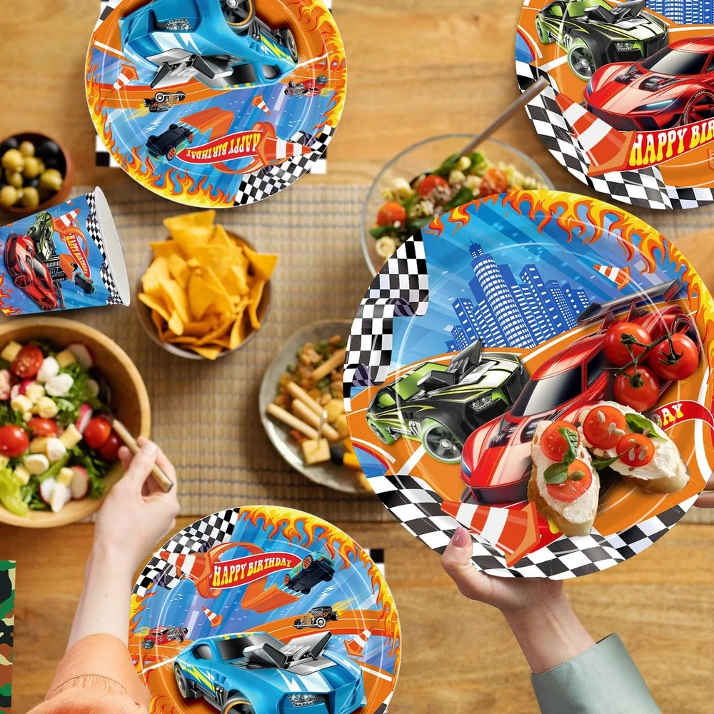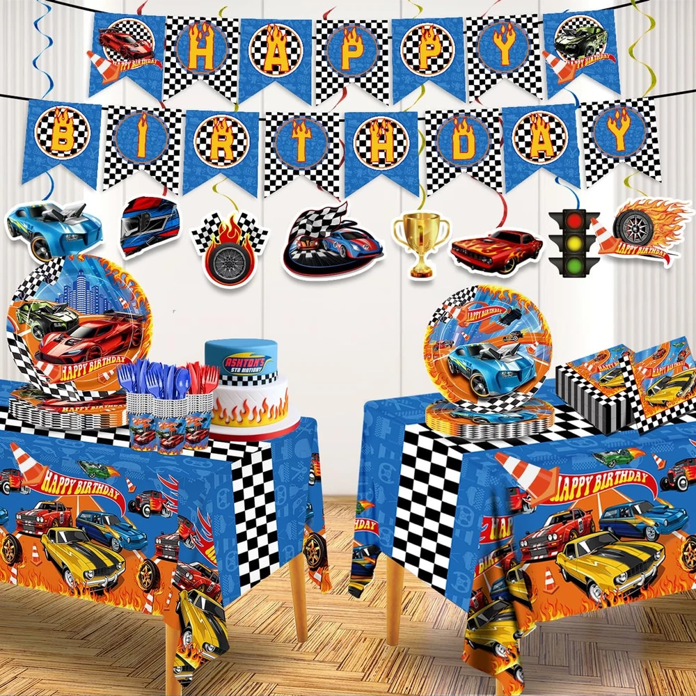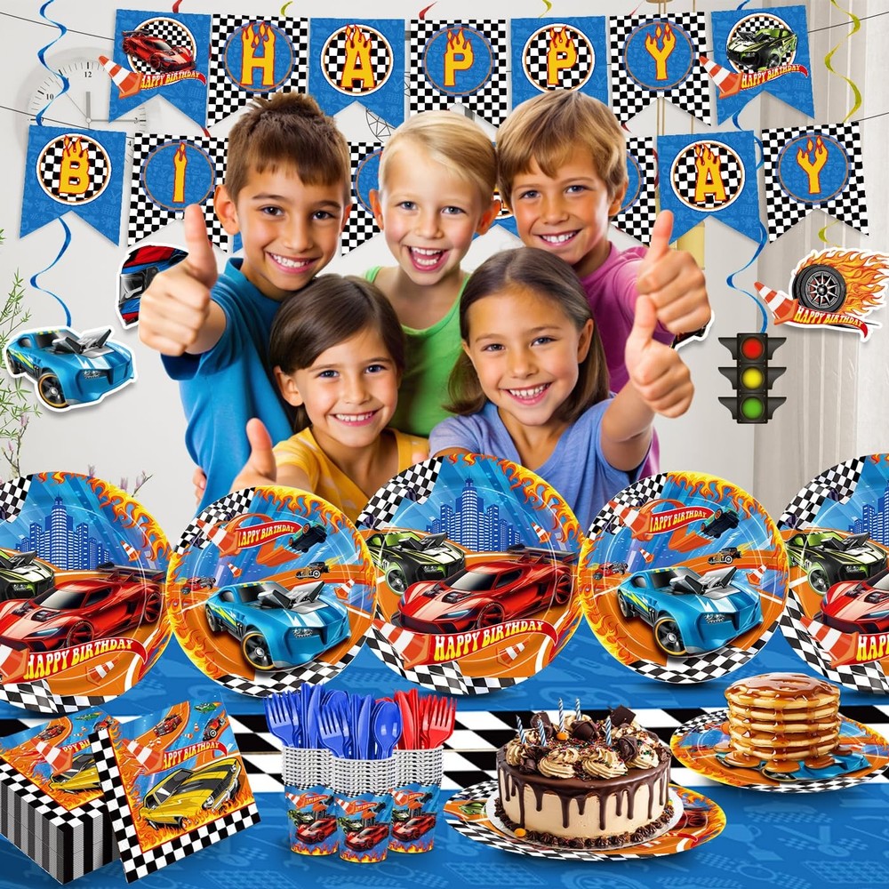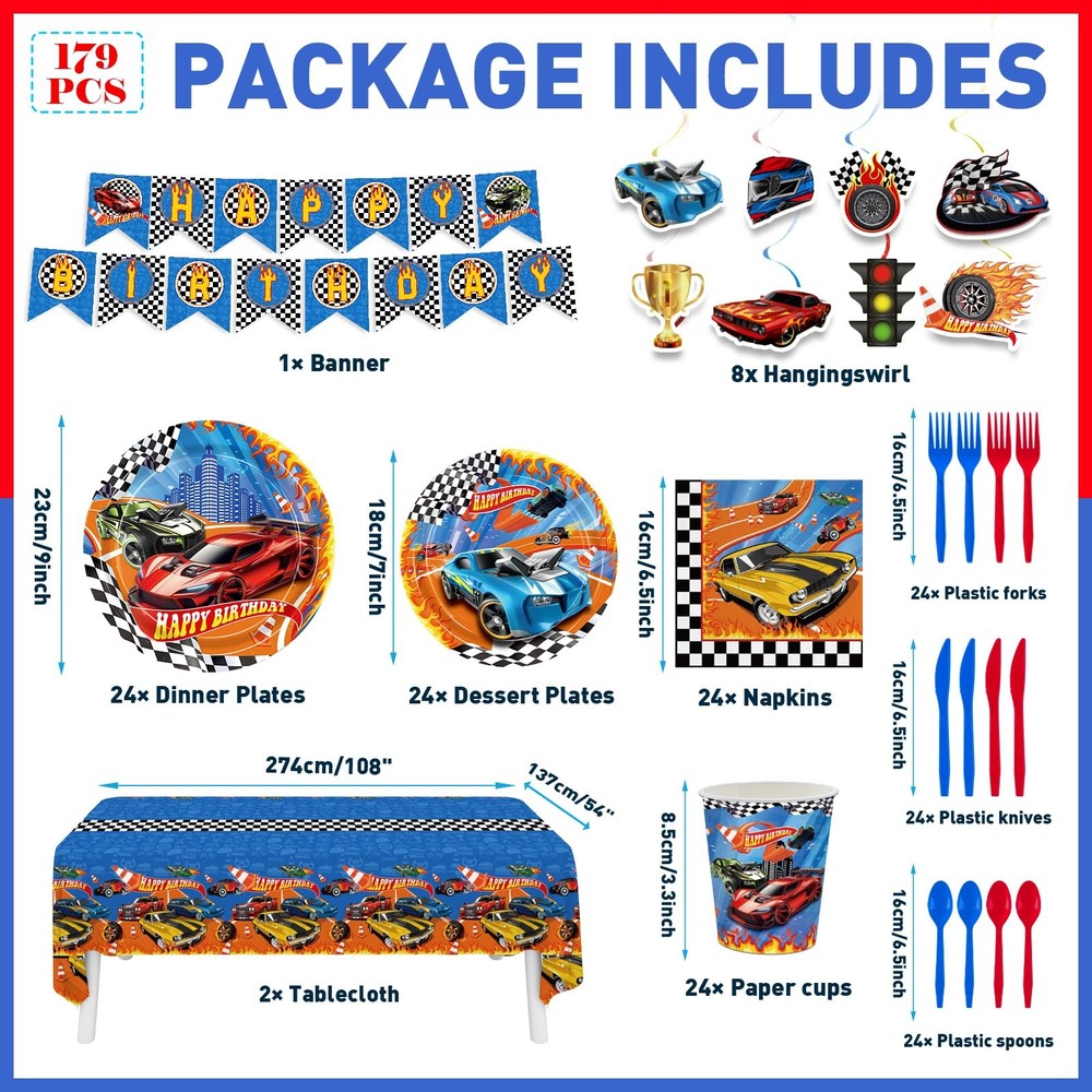 Birthday Party Decorations Racing Car Party Decorations: The racing car party tableware set includes 24pcs 9" dinner plates, 24pcs 7" dessert plates, 24pcs 6.5'' napkins, 24pcs paper cups, 24pcs red and blues knives, forks and spoons, a set of happy birthday banner, 8pcs of hanging swirls, 2pc 54" x 108" tablecloths. Serves up to 24 guests, allowing each guest to enjoy a complete racing dining experience! Race Car Design: The race car tableware set is featuring vibrant race car - themed decorations like a "Happy Birthday" banner with checkered flags and letters, plus plates, cups, napkins, and tablecloths adorned with cool race cars, this set has everything to create an racing party atmosphere. High Quality Material: The racing car plates napkins made of high-quality paper material, which are environmentally friendly and degradable. The paper plates are reliable, suitable for carrying all kinds of food, and the paper napkins are soft and absorbent, making guests more comfortable to dine. Save Your Time: Our race car party supplies are all disposable, just throw them away when you're done using them, which can save time and spend more time enjoying the race car party with family and friends. Wide Application: Our racing car party tableware set is an ideal addition to any birthday party. Suitable for racing themed birthdays, racing car theme events, racing themed parties, car birthday parties, children's parties, family gathering and so on.
