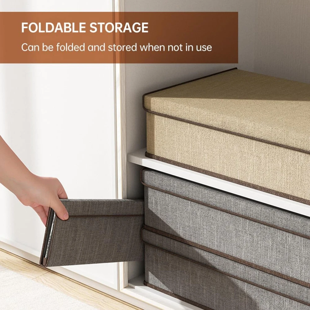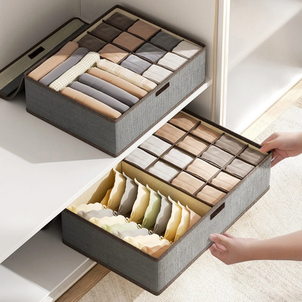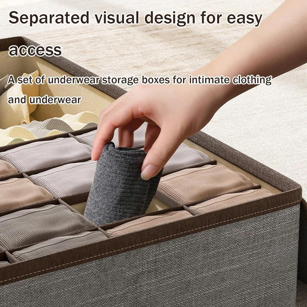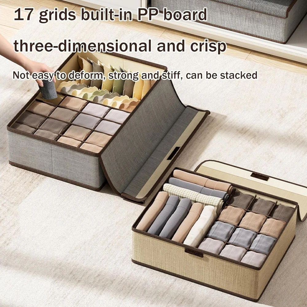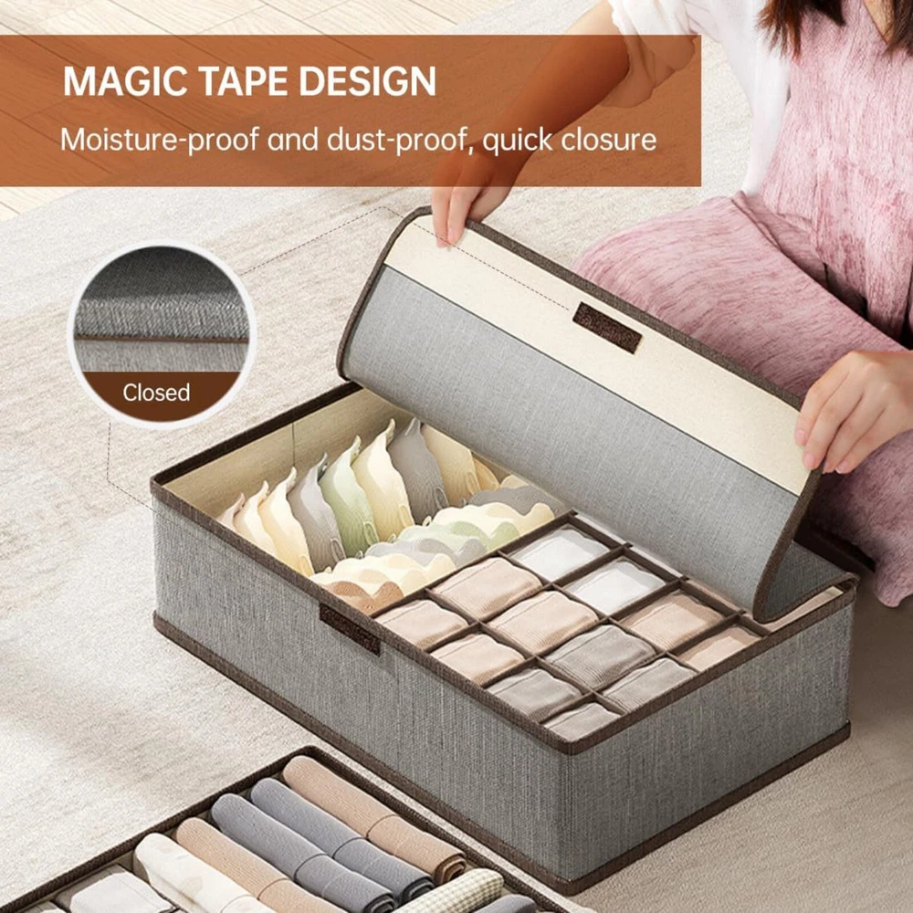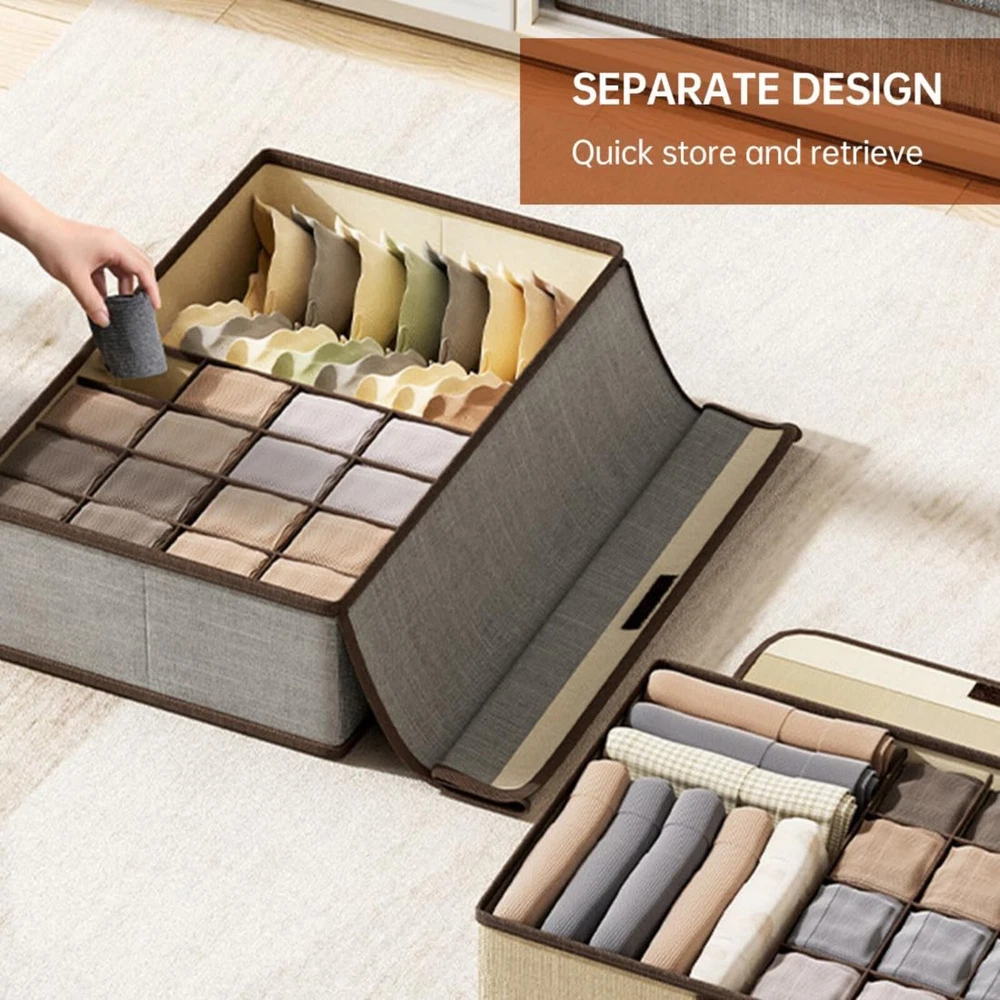 Material: Cotton and linen Product size: 44 * 29 * 12.5cm Package List: 1 * Storage Box 【MULTIPURPOSE DRAWER ORGANISER】 Drawer organisers can suit for many places such as drawer, dressing table,office desk and etc. These cubes storage can store various items, including bras, socks, leggings, t-shirts, purses, wrist-lets, wallets, watches, makeup and other accessories. 【easy to use】designed with a convenient closure magic buckle lid, it can be easily opened and closed, saving time and effort. it can also be folded up to save space when not in use. 【size】the large size is 17.25" * 11.5" * 5", with 16 small compartments and 1 large compartment. Unlike clothes storage boxes without compartments and with fixed compartments, our underwear drawer organiser contains compartments in different sizes. You can put your underwear, bras and socks in one box. 【cotton and linen material】made of high-quality cotton and linen material, it has the characteristics of dustproof, moisture-proof, and wear-resistant, and is not easily deformed or broken. the breathable structure ensures air circulation and keeps clothes fresh. 【multi-functional storage box】suitable for storing socks, ties, belts, underwear, small accessories, etc., it can be placed in closets, bedrooms, shelves, bathrooms, wardrobes, drawers, under-bed storage, desks, bookshelves, nurseries, and offices.