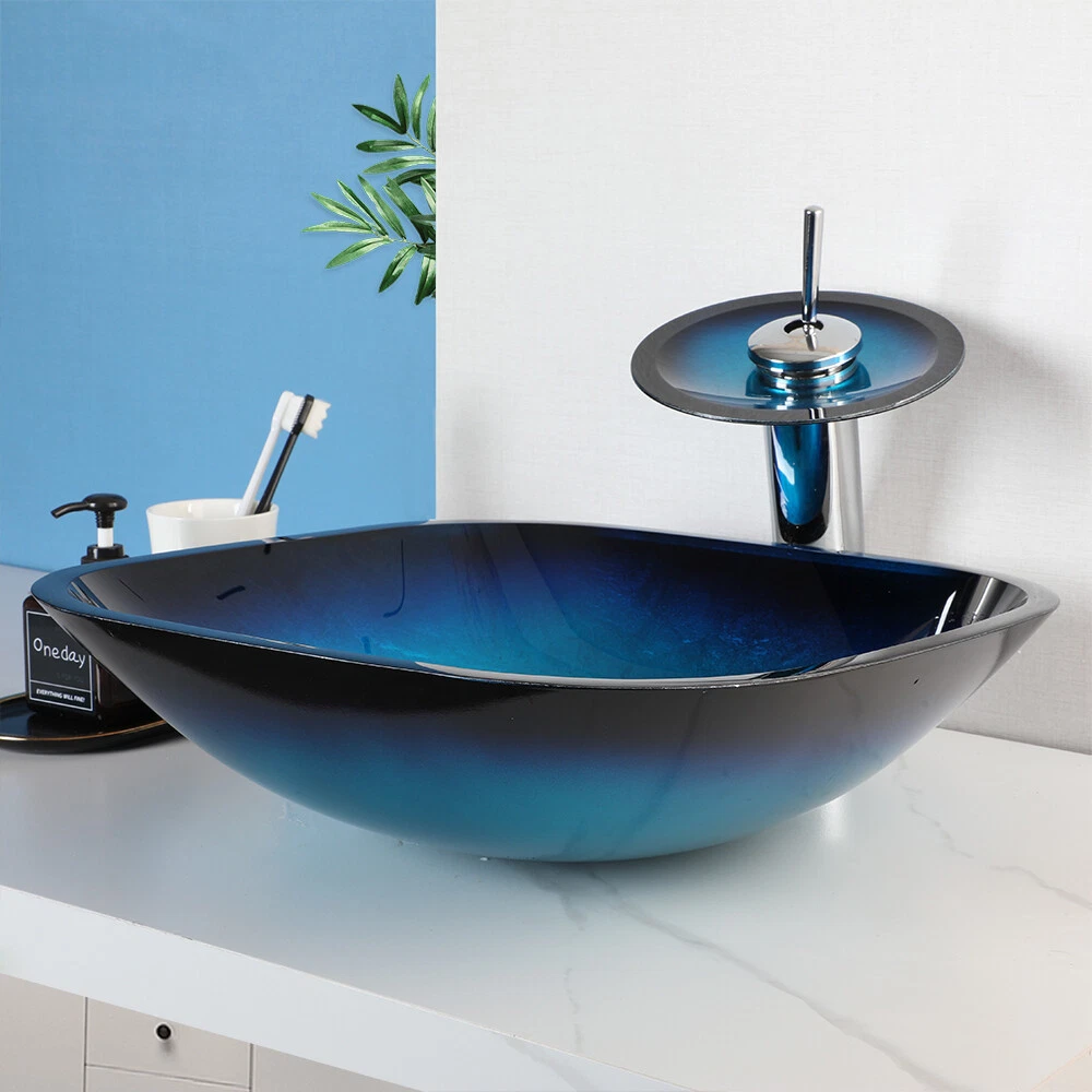 Dimension: Sink length: 425mm 17" Sink width: 425mm 17" Sink height: 130mm 5.2" Faucet height: 300mm 12" Spout height: 185mm 7.4" Spout reach: 70mm 2.8" Features: Type: Bathroom Vessel Sinks Material: Tempered glass Shape: Square Color: Black & blue Installation: Above Counter / Deck Mounted With chrome mixer faucet + glass disc With pop up drain Brand new in a box ready to ship Good quality and best price Easy to install and clean Package Includes: 1x Glass Sink 1 x Faucet 1 x Pop-up Drain 17”Square Bathroom Tempered Glass Vessel Sink Black Blue Basin Bowl Faucet Drain Description Dimension: Sink length: 425mm 17" Sink width: 425mm 17" Sink height: 130mm 5.2" Faucet height: 300mm 12" Spout height: 185mm 7.4" Spout reach: 70mm 2.8" Features: Type: Bathroom Vessel Sinks Material: Tempered glass Shape: Square Color: Black & blue Installation: Above Counter / Deck Mounted With chrome mixer faucet + glass disc With pop up drain Brand new in a box ready to ship Good quality and best price Easy to install and clean Package Includes: 1x Glass Sink 1 x Faucet 1 x Pop-up Drain Payment Delivery details Terms of sales About us Contact us Payment Payment is expected in 3 days after the end of Auction. So we can ship your item ASAP. When you paying with Paypal, please confirm your Ebay and Paypal address. Unpaid auctions must be reported to ebay, contact us if you need to file an extension for any late payment. Delivery details We ship this item from United States , it usually takes 2-8 days for delivery. No delivery to military addresses (Hawaii, Guam additional shipping charges apply) Terms of sales I describe items as well as I can. If I have missed something, please let me know. Please e-mail me before leaving feedback if you are unhappy with your item, so we can work it out. International Buyers – Please Note: Import duties, taxes, and charges are not included in the item price or shipping cost. About us Comes with 2 years manufacture warranty Exchange on defective item within 7 business days after the product is delivered. Shipping damage has to be reported within 5 business days of which the product was delivered. Contact us If you have any questions, please be free to contact with us, we will answer your questions ASAP. We will answer your question via email, please check your email for the answers. Our business time is from Monday-Sunday/8:00AM – 22:00PM