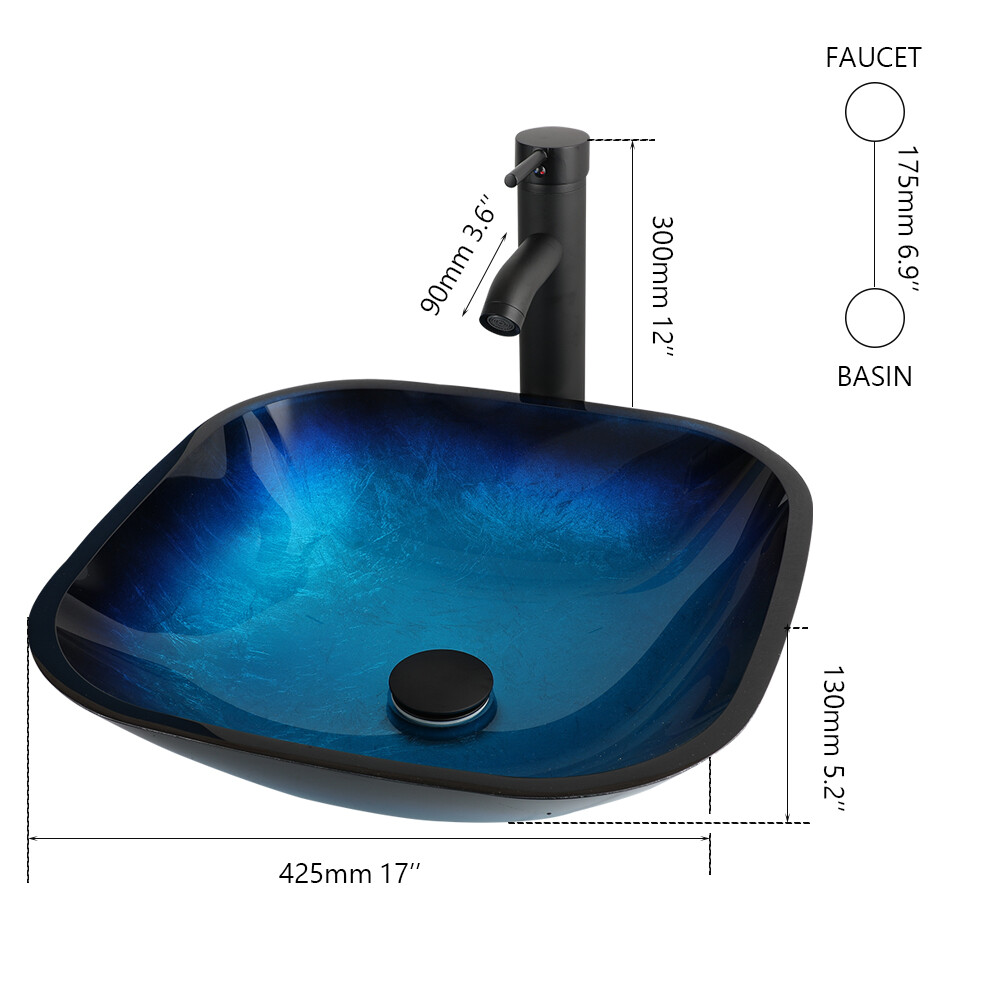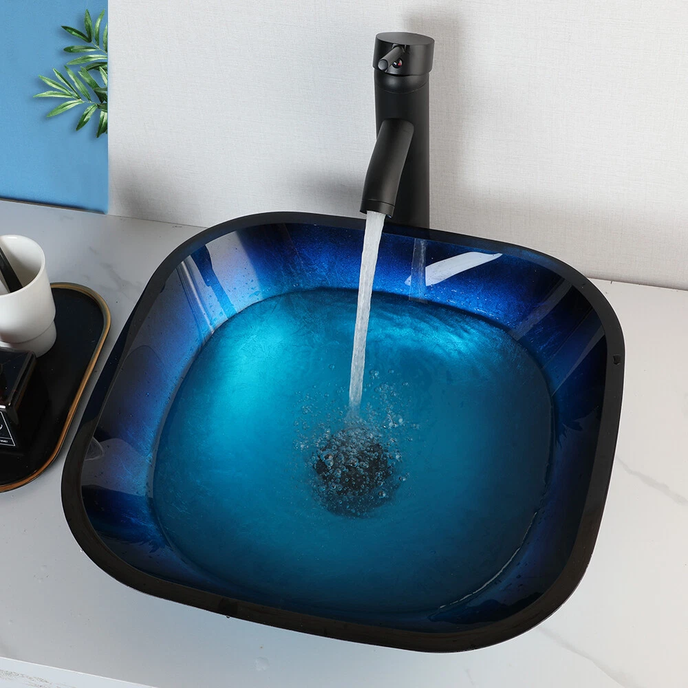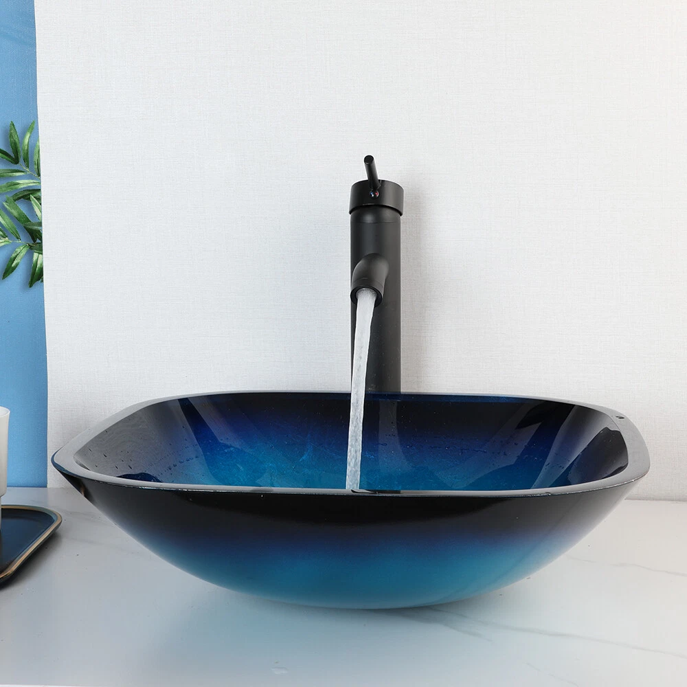 Dimension: Sink length: 425mm 17" Sink width: 425mm 17" Sink height: 130mm 5.2" Features: Type: Bathroom Vessel Sinks Material: Tempered glass Shape: Square Color: Black & blue Installation: Above Counter / Deck Mounted With chrome mixer faucet With pop up drain Brand new in a box ready to ship Good quality and best price Easy to install and clean Package Includes: 1x Glass Sink 1 x Faucet 1 x Pop-up Drain Package Includes: 1x Glass Sink 1 x Faucet 1 x Pop-up Drain 17”Square Bathroom Tempered Glass Vessel Sink Blue Basin Bowl Black Mixer Faucet Description Dimension: Sink length: 425mm 17" Sink width: 425mm 17" Sink height: 130mm 5.2" Features: Type: Bathroom Vessel Sinks Material: Tempered glass Shape: Square Color: Black & blue Installation: Above Counter / Deck Mounted With chrome mixer faucet With pop up drain Brand new in a box ready to ship Good quality and best price Easy to install and clean Package Includes: 1x Glass Sink 1 x Faucet 1 x Pop-up Drain Payment Delivery details Terms of sales About us Contact us Payment Payment is expected in 3 days after the end of Auction. So we can ship your item ASAP. When you paying with Paypal, please confirm your Ebay and Paypal address. Unpaid auctions must be reported to ebay, contact us if you need to file an extension for any late payment. Delivery details We ship this item from United States , it usually takes 2-8 days for delivery. No delivery to military addresses (Hawaii, Guam additional shipping charges apply) Terms of sales I describe items as well as I can. If I have missed something, please let me know. Please e-mail me before leaving feedback if you are unhappy with your item, so we can work it out. International Buyers – Please Note: Import duties, taxes, and charges are not included in the item price or shipping cost. About us Comes with 2 years manufacture warranty Exchange on defective item within 7 business days after the product is delivered. Shipping damage has to be reported within 5 business days of which the product was delivered. Contact us If you have any questions, please be free to contact with us, we will answer your questions ASAP. We will answer your question via email, please check your email for the answers. Our business time is from Monday-Sunday/8:00AM – 22:00PM