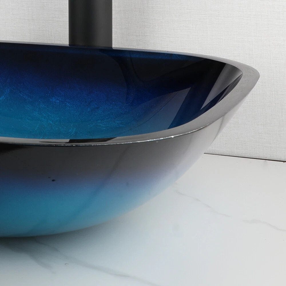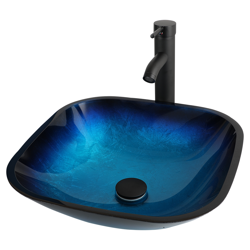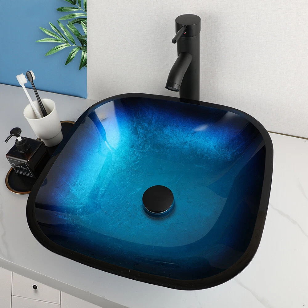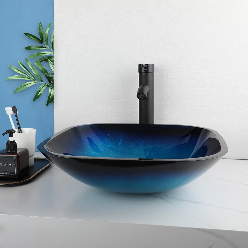 Dimension: Sink length: 425mm 17" Sink width: 425mm 17" Sink height: 130mm 5.2" Features: Type: Bathroom Vessel Sinks Material: Tempered glass Shape: Square Color: Black & blue Installation: Above Counter / Deck Mounted With chrome mixer faucet With pop up drain Brand new in a box ready to ship Good quality and best price Easy to install and clean Package Includes: 1x Glass Sink 1 x Faucet 1 x Pop-up Drain Package Includes: 1x Glass Sink 1 x Faucet 1 x Pop-up Drain 17”Square Bathroom Tempered Glass Vessel Sink Blue Basin Bowl Black Mixer Faucet Description Dimension: Sink length: 425mm 17" Sink width: 425mm 17" Sink height: 130mm 5.2" Features: Type: Bathroom Vessel Sinks Material: Tempered glass Shape: Square Color: Black & blue Installation: Above Counter / Deck Mounted With chrome mixer faucet With pop up drain Brand new in a box ready to ship Good quality and best price Easy to install and clean Package Includes: 1x Glass Sink 1 x Faucet 1 x Pop-up Drain Payment Delivery details Terms of sales About us Contact us Payment Payment is expected in 3 days after the end of Auction. So we can ship your item ASAP. When you paying with Paypal, please confirm your Ebay and Paypal address. Unpaid auctions must be reported to ebay, contact us if you need to file an extension for any late payment. Delivery details We ship this item from United States , it usually takes 2-8 days for delivery. No delivery to military addresses (Hawaii, Guam additional shipping charges apply) Terms of sales I describe items as well as I can. If I have missed something, please let me know. Please e-mail me before leaving feedback if you are unhappy with your item, so we can work it out. International Buyers – Please Note: Import duties, taxes, and charges are not included in the item price or shipping cost. About us Comes with 2 years manufacture warranty Exchange on defective item within 7 business days after the product is delivered. Shipping damage has to be reported within 5 business days of which the product was delivered. Contact us If you have any questions, please be free to contact with us, we will answer your questions ASAP. We will answer your question via email, please check your email for the answers. Our business time is from Monday-Sunday/8:00AM – 22:00PM