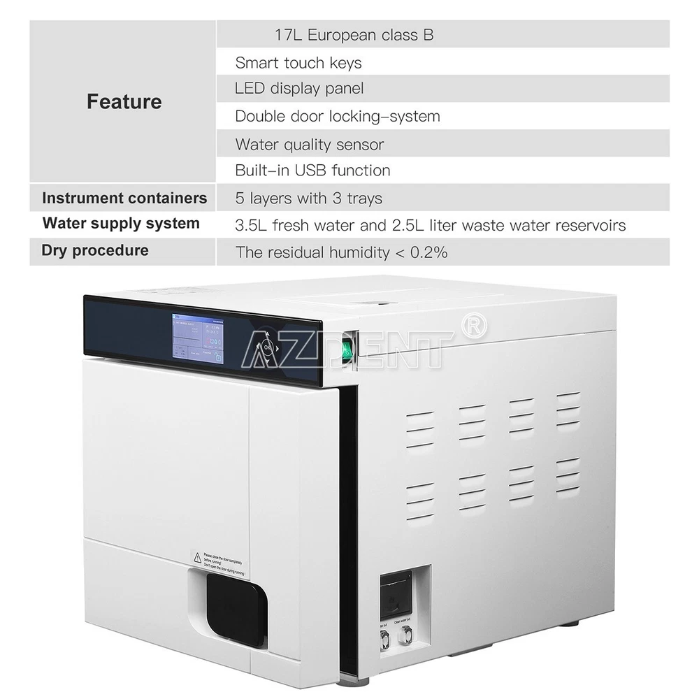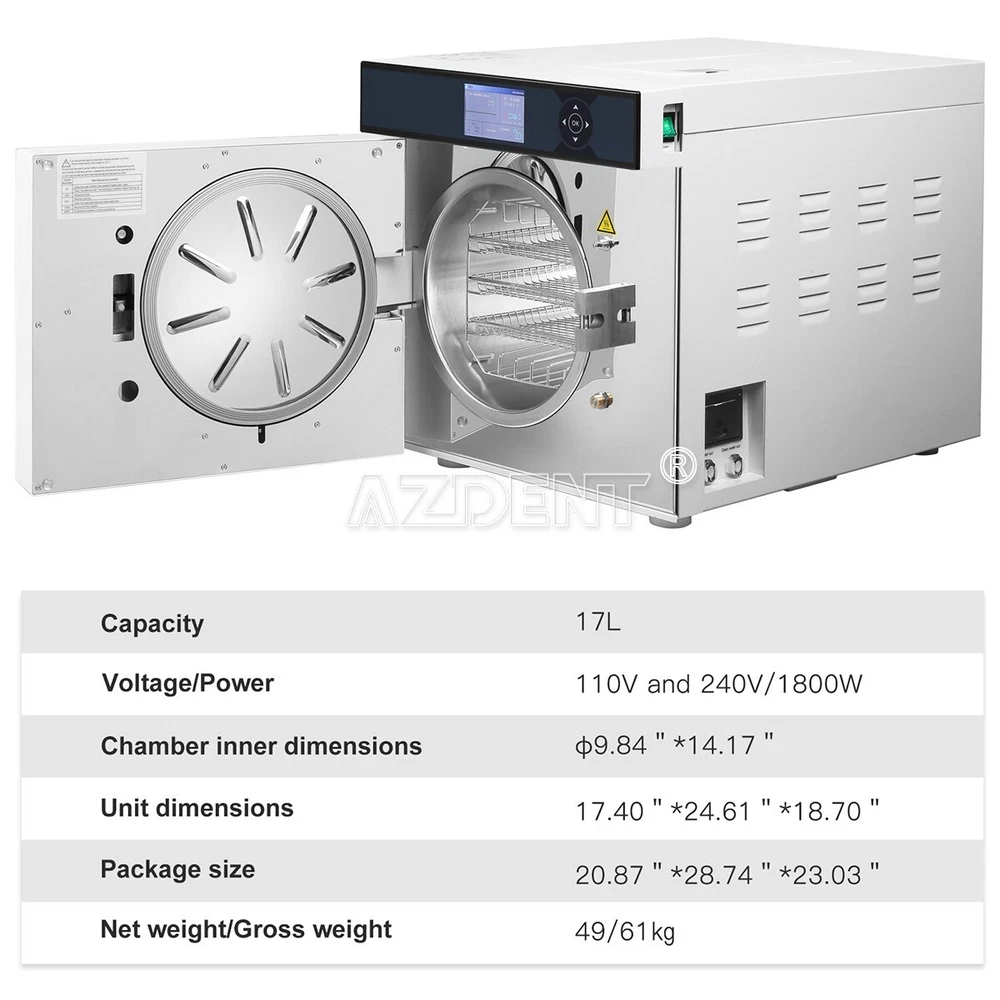Description: Physical Space: 17L Sterilizing temperature: 121℃,134℃ Display: LCD display Chamber inner dimensions(Diameter × Depth): φ25*D36cm(9.84"*14.17") Net Weight /Gross Weight: 49kg/61kg Product size: 62.5*47.5*44.2cm(24.61"*18.70"*17.40") Package size: 73*58.5*54cm(28.74"*20.87"*23.03") Specification : Feature 17L , European class B Smart touch keys LED display panel Double door locking-system Water quality sensor Built-in USB function Instrument containers 5 layers with 3 trays Water supply system 3.5L fresh water and 2.5L liter waste water reservoirs Dry procedure The residual humidity < 0.2% DESCRIPTION: 1. Using wide-angle LED color screen with soft light 2. Italian water pump and solenoid valve with more stable performance and longer service life 3. Large size condenser with dual fans perfectly meet the requirements of electrical safety 4. Safety first,double door locking-system 5. One-ckick program upgrade 6. One-click cpmponents fault self-test fuction 7. Program running curve dot matrix trend,clearly view the sterilization process in real time 8. Humanized appointment fuction making use more efficient and easier 9. 99% saturated steam makes sterilization more thorough 10. All-inclusive heating loop makes sterilized instruments drier FDA Statement: The sale of this item may be subject to regulation by the U.S. Food and Drug Administration and state and local regulatry agencies. If so, you can bid on this item only if you are an authorized purchaser. If the item is subject to FDA regulation, I will verify your status as an authorized purchaser of this item before shipping of the item. Seller name:allguest City,State:SHENZHEN,China Telephone number:0755-58772369 Payment We accept PayPal Only! All payments must be made within 7 days after the auction ends. Non-paying bidders will be reported to eBay. Please don't buy an item if you can't/won't pay for it. Paypal is the easiest way to pay for items on eBay. Please make sure your Paypal and eBay accounts have the same physical address used for delivery and the same e-mail address to ensure payment confirmation. Shipping: Import duties, taxes and charges are not included in the item price or shipping charges. These charges are the buyer's responsibility. Return If the item you received is damaged or defective,Please message to us immidately.We will free exchange or refund. We will pay the return shipping costs if the product is defective or the return is a result of our error. If the item is returned for any other reason you are responsible for the return shipping charges. You can return your purchase for up to 15 days from the date of delivery. No refund will be issued if the product shows signs of use. Returned package must be in the original packaging, everything must be in new condition, No missing parts. Our guarantee does not cover accidental damage or wear of product caused by customer.Thank you very much for your understanding! Shipping The goods you odered will be posted out in the second working day after the paymet has been made. (We will inform you via email if any delay occured due to holiday events. General shipping time is between 7-12 working days. (After the shipping started, the order will be monitored and the track of the item will be posted on paypal. Feedback You feedback is VERY important to us Please leave us positive feedback, an positive feedback will be automatically left for you once we receive your full payment. Please leave us with any concerns prior to leave negative feedback, as we can only correct issues when we are aware of them. We understand the concerns and frustrations you might have, and will try our best to resolve the isuues. Serivce is our #1 priority at BAISTRA! If you message us immediately after placing the order, we will make every effort to assist you with your change request. Unfortunately, we can not make changes or cancel an order once it has shipped. We offer the best items at the best prices. We strive to exceed all your expectations and put a smile on your face. Your experience will be a pleasant and effortless one when you buy at BAISTRA. We stand behind our products and pride ourselves on OUTSTANDING customer service. We guarantee that you will be delighted with your purchase or we will gladly and promptly issue you a refund or make things right!