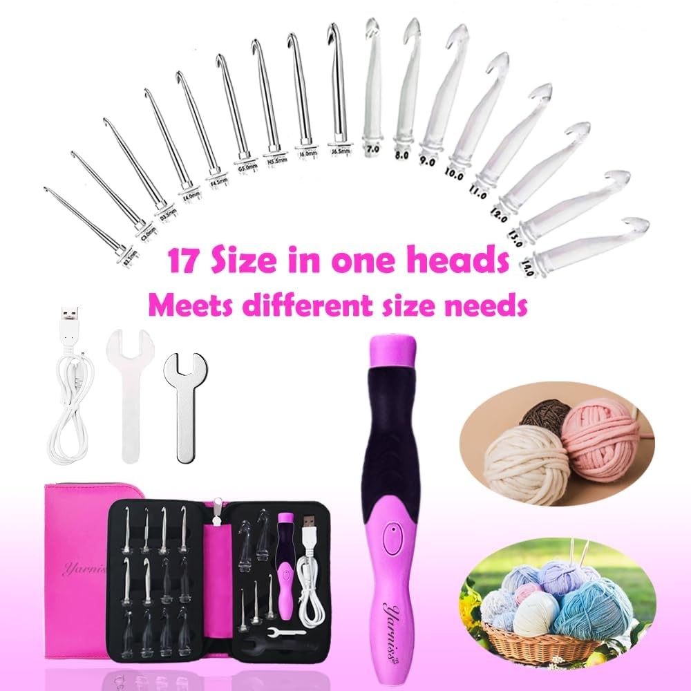 17 size Lighted Crochet Hooks Set 2.5 mm to 14.0 mm, Rechargeable Light Up crochet hooks with Case 【17 in 1 Head Lighted Crochet Hooks】The crochet hooks comes with 17 in 1 interchangeable head, you will get 9pcs metal head from 2.5 mm to 6.5 mm., and 8pcs plastic head from 7.0mm to 14.0mm. 【USB Fast Rechargeable】The glow crochet hooks equipped with USB data cable, easy to charging can be done by wall adapter, power bank or desktop/laptop computer etc. The built-in lithium battery is rechargeable and utilized repeatedly. It only takes 15 minutes to rechargeable, and then it can last for 7-8 hours. 【Longer LED Crochet Hooks】The lighted crochet set designed longer crochet shafts than previous version, the update version assemble with 1.90~2.0 inch crochet hook heads, which can make more loops when crocheting. 【Adjustable Brightness Levels】 The electrical crochet needle assemble with 2 brightness modes, see clearly even the darkest yarn. this lighting head makes crocheting easier under different kinds of light conditions. Especially suit for crochet needles with dark colored yarn or when you just need more light to crochet.