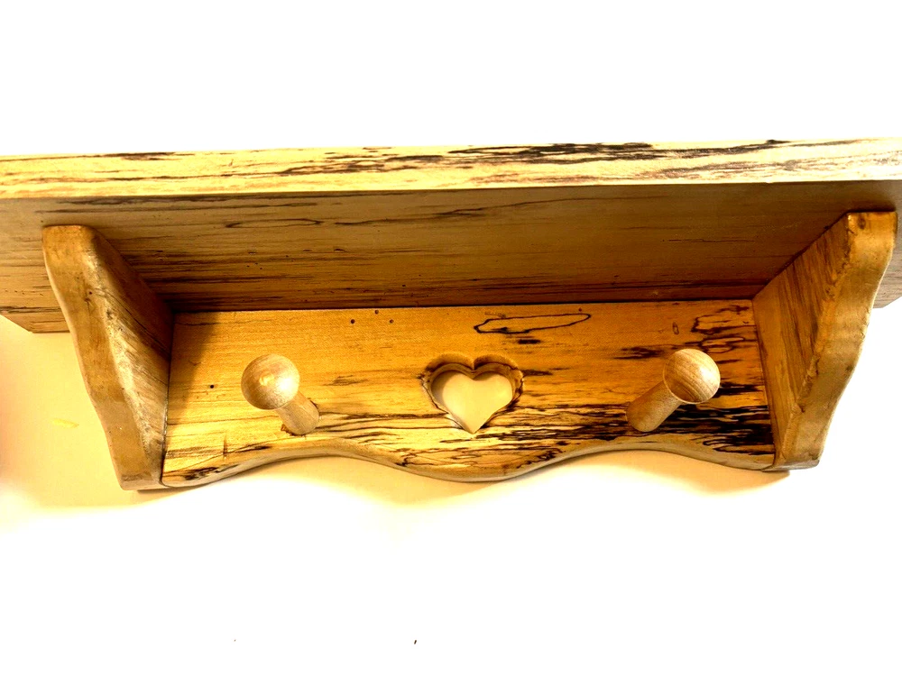 The 17" Wall Hung Shelf with 2 Cloths Hanging Pegs is a stylish and functional addition to any room. Made of solid wood with a light wood tone, this rectangular shelf features a patterned design in brown color. It includes one shelf for displaying plates or decorative items and two hanging pegs for cloths. Made in the United States, this shelf does not require assembly and is perfect for organizing and decorating your home.