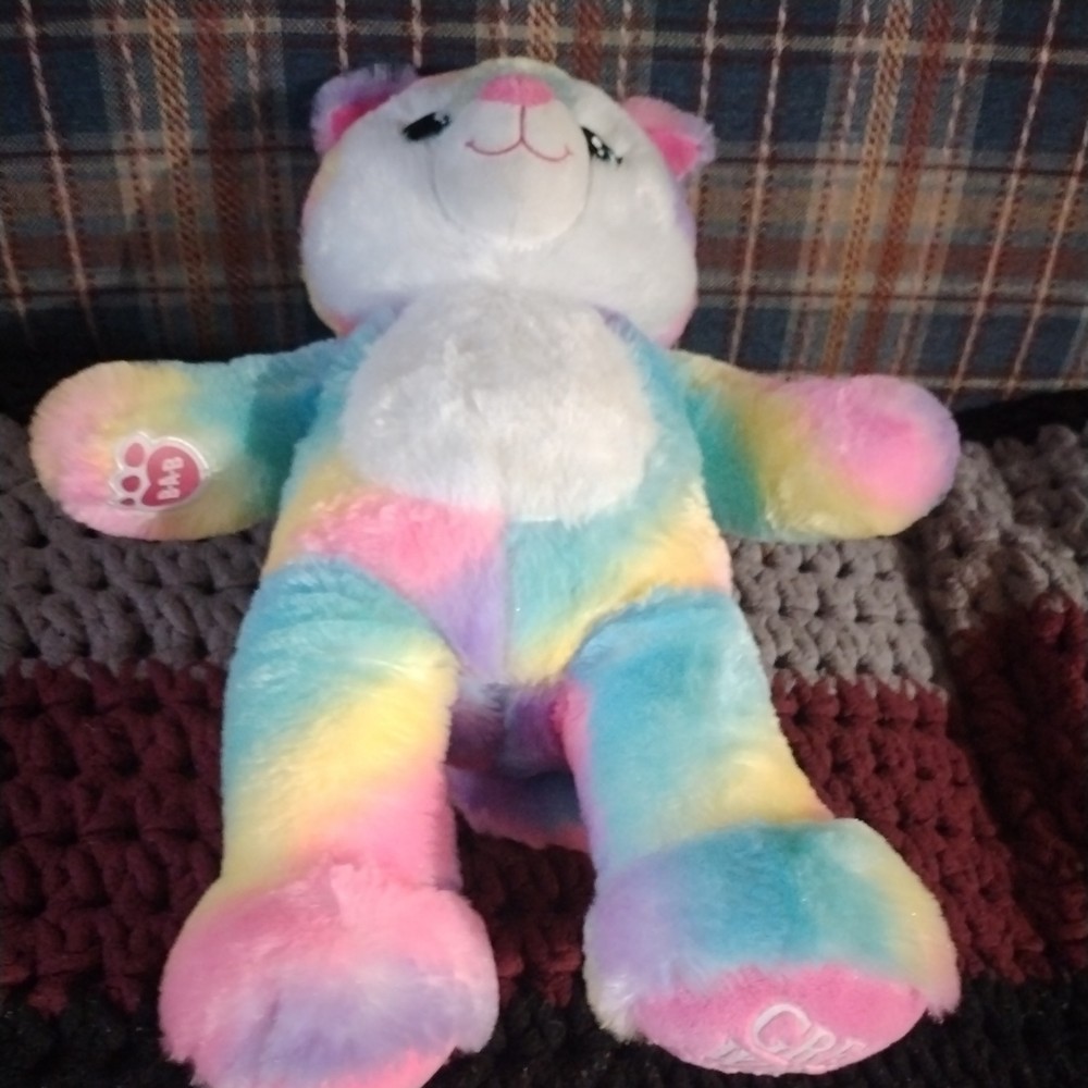 Unleash the spirit of the wilderness with this exclusive 17" Build-A-Bear Workshop Great Wolf Lodge Rainbow Plush. A vibrant mosaic of colors. overall condition is good