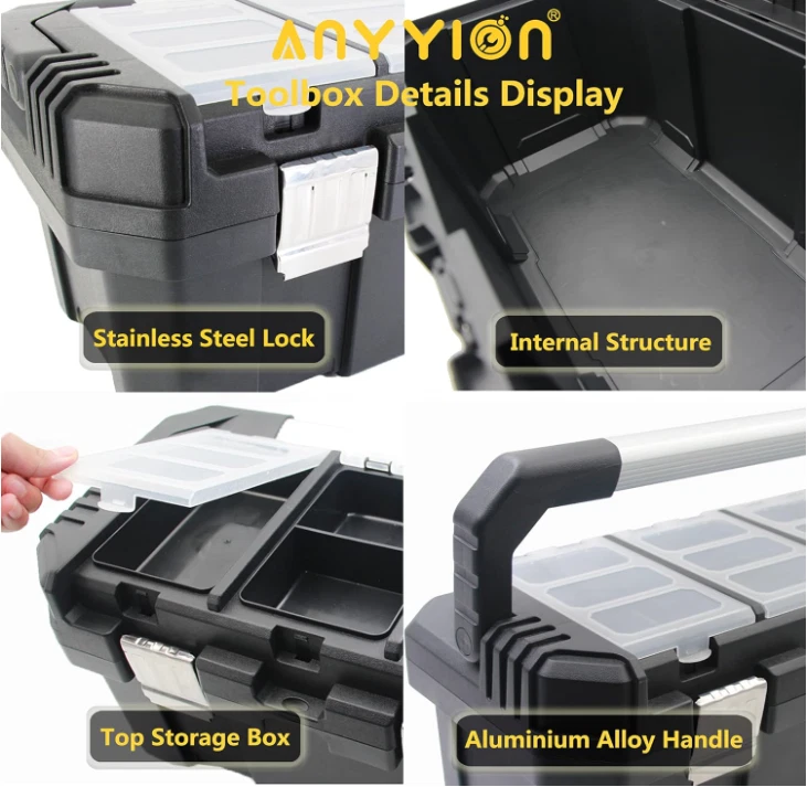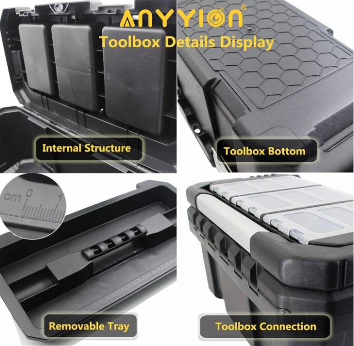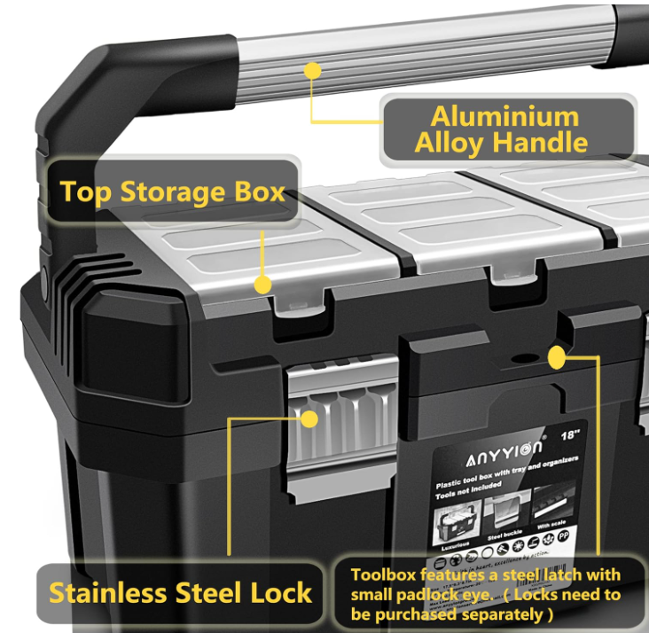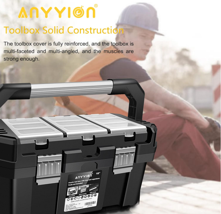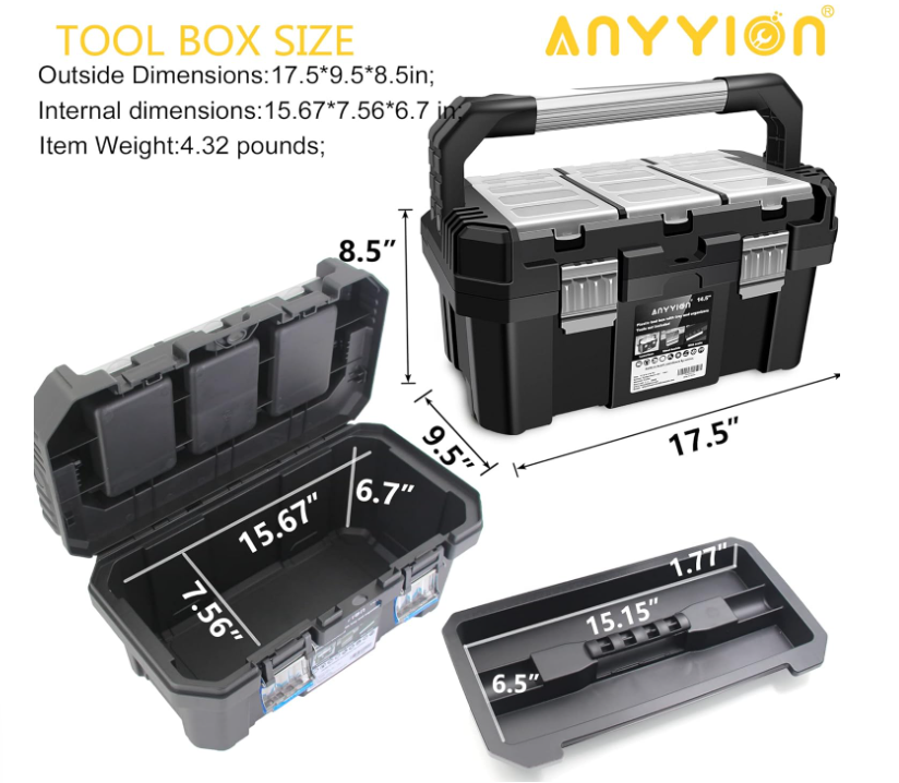 Anyyion 17-Inch Tool box with Removable Tray with Stainless Steel Dual Lock Secured,Small Parts Box, Metal Handle is Truly Rugged About this item Toolbox Solid Construction : This anyyion tool box is made of high quality PP plastic,pass the extreme freezing test, even at the temperature of -22°F, it is still resistant to falling, smashing and not cracking.which ensures the tool box durable and sturdy. a good choice for carrying power tools, hand tools, and medium items Tool Box Ample Storage Space : Features an interior organizer tray, provides ample storage space. Top storage box can store small parts, easy to find and avoid loss. Also it equipped with a bottom compartment, which can hold large, heavy items. Safety Design : Metal non-slip handle, the toolbox also has a metal stainless steel lock for greater safety, safety and durability. Toolbox features a steel latch with a small latch hole that can be padlocked or zipped to secure the case (purchased separately). 18 in Toolbox Size : Outside Dimensions:17.5*9.5*8.5 inch;Internal Dimensions:15.67*7.56*6.7inch; Item Weight:4.32pounds Metal non-slip handle, the toolbox also has a metal stainless steel lock for greater safety, safety and durability. This anyyion tool box is made of high quality PP plastic,which ensures the tool box durable and sturdy. a good choice for carrying power tools, hand tools, and medium items. Features an interior organizer tray, provides ample storage space. Top storage box can store small parts, easy to find and avoid loss. Also it equipped with a bottom compartment, which can hold large, heavy items.