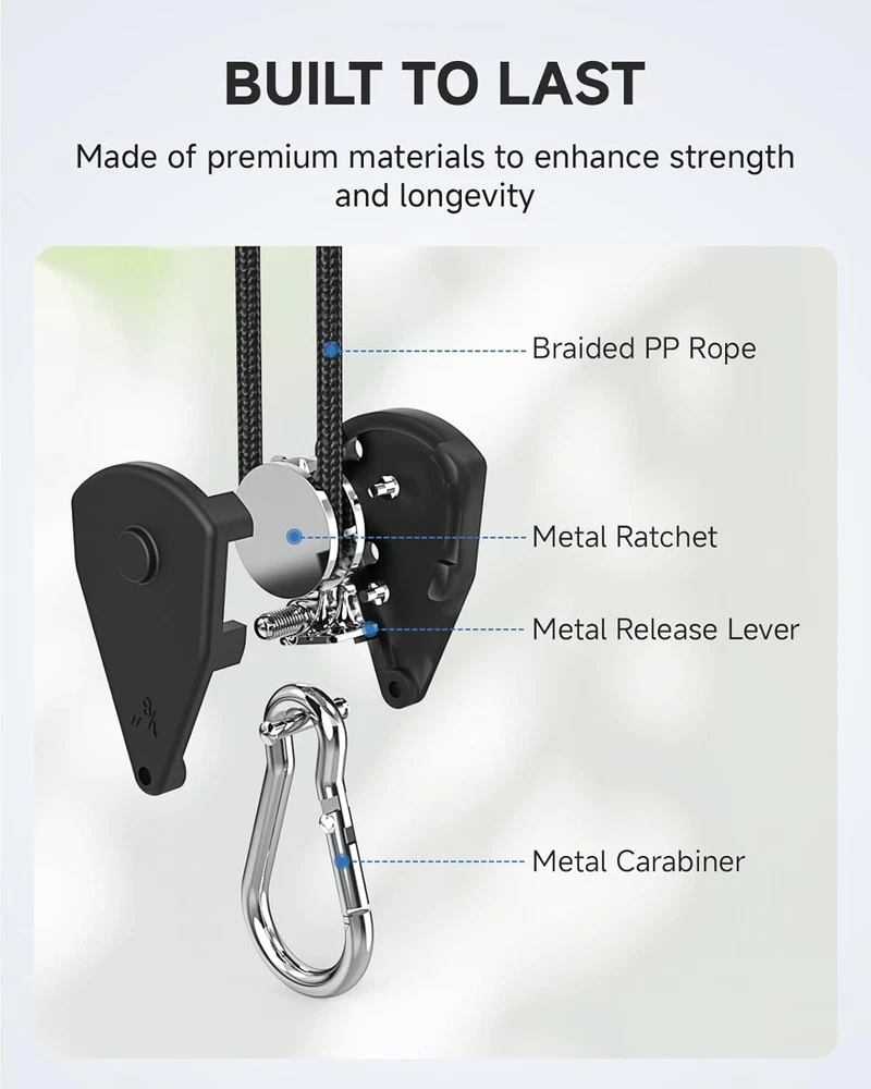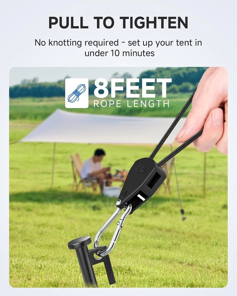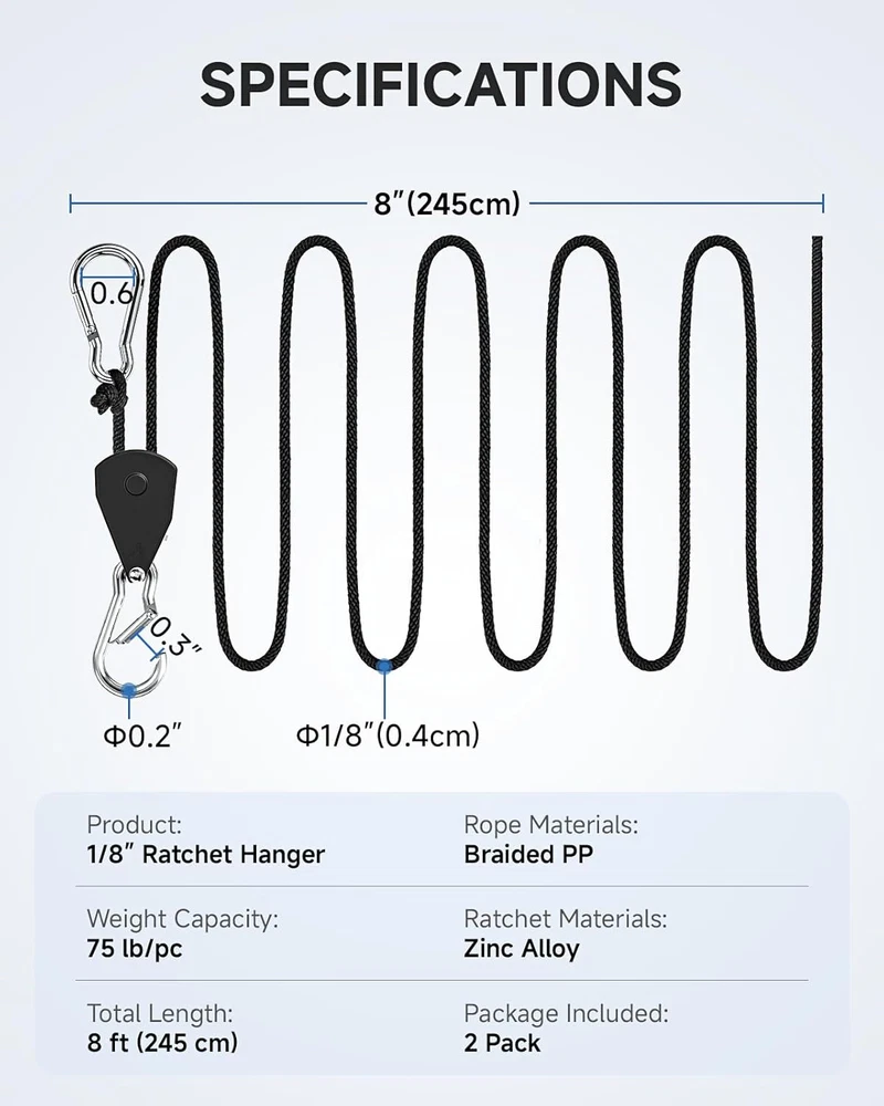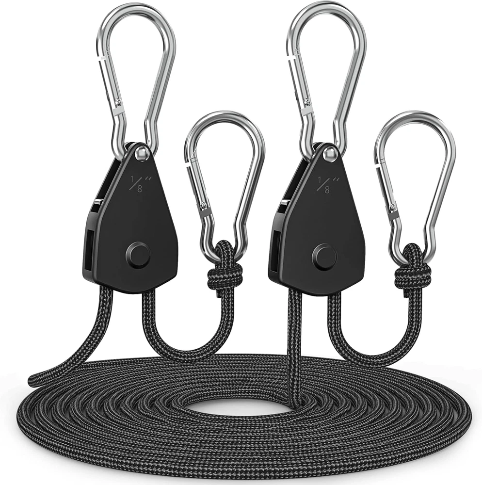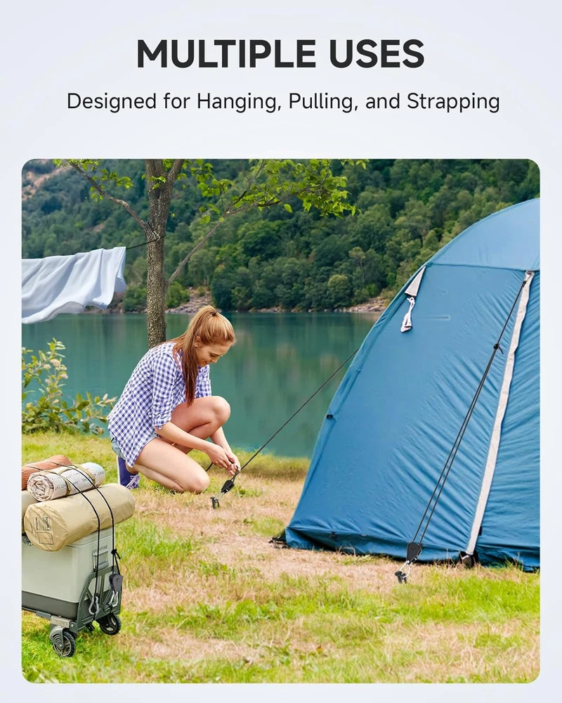 Key Features: Engineered with heavy-duty construction, these retractable and secure straps offer exceptional durability and reliability Premium Materials: Crafted from high-quality braided polypropylene rope and a durable metal ratchet for enhanced strength and longevity Easy to Use: Equipped with a quick-release mechanism, enabling effortless rope length adjustments without the risk of slippage; Each ratchet supports up to 75 lb, making it versatile for a wide range of tasks Built to Last: Designed with reinforced metal hooks, a sturdy ratchet, a reliable release lever, and a braided PP rope with a 330 lb break strength; This robust construction minimizes the risk of rust and ensures long-lasting performance Versatile Application: Ideal for securing various items, including transporting small objects, hanging indoor garden fixtures, and fulfilling various tie-down needs, such as setting up tarps or camping tents Product Description
