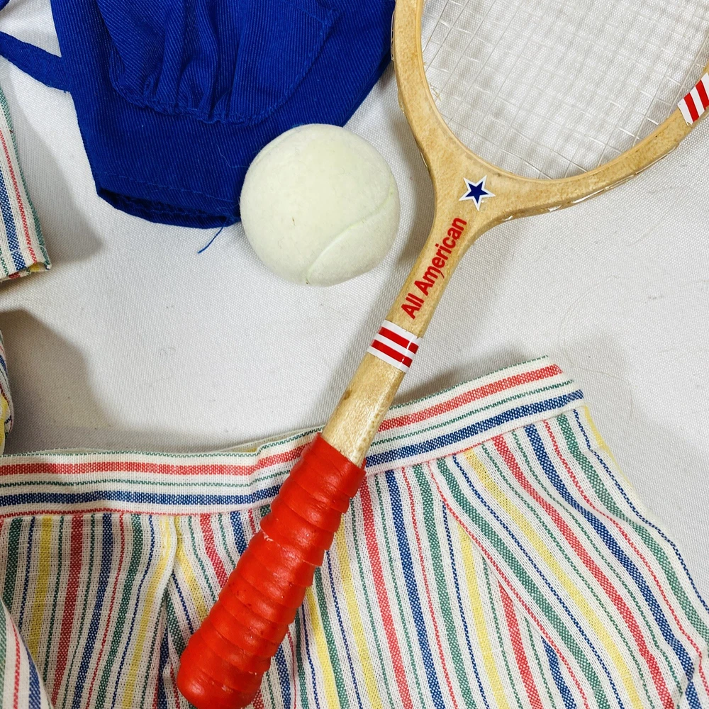 18" American Girl Doll Molly's Tennis Outfit - Limited Edition Set, Retired and Hard to Find. Tagged Special Edition 1997 Pleasant Company. Set includes Blouse, Overskirt, Shorts, Shoes, Tennis Racket, Tennis Ball, and Cover for Racket. Just missing hair ribbon and instructions from original set. In excellent pre-owned condition, only flaw noted is one faint smudge/stain on upper waistband of skirt, no other stains, rips, or signs of wear. Please see all pictures for exact cosmetic condition and other details, as they are part of the description as well, and ask any questions before purchasing. We are a husband and wife team with a growing family, and greatly appreciate your support of our small business. Please browse our eBay store for a variety of other American Girl items. We hope you enjoy this set!