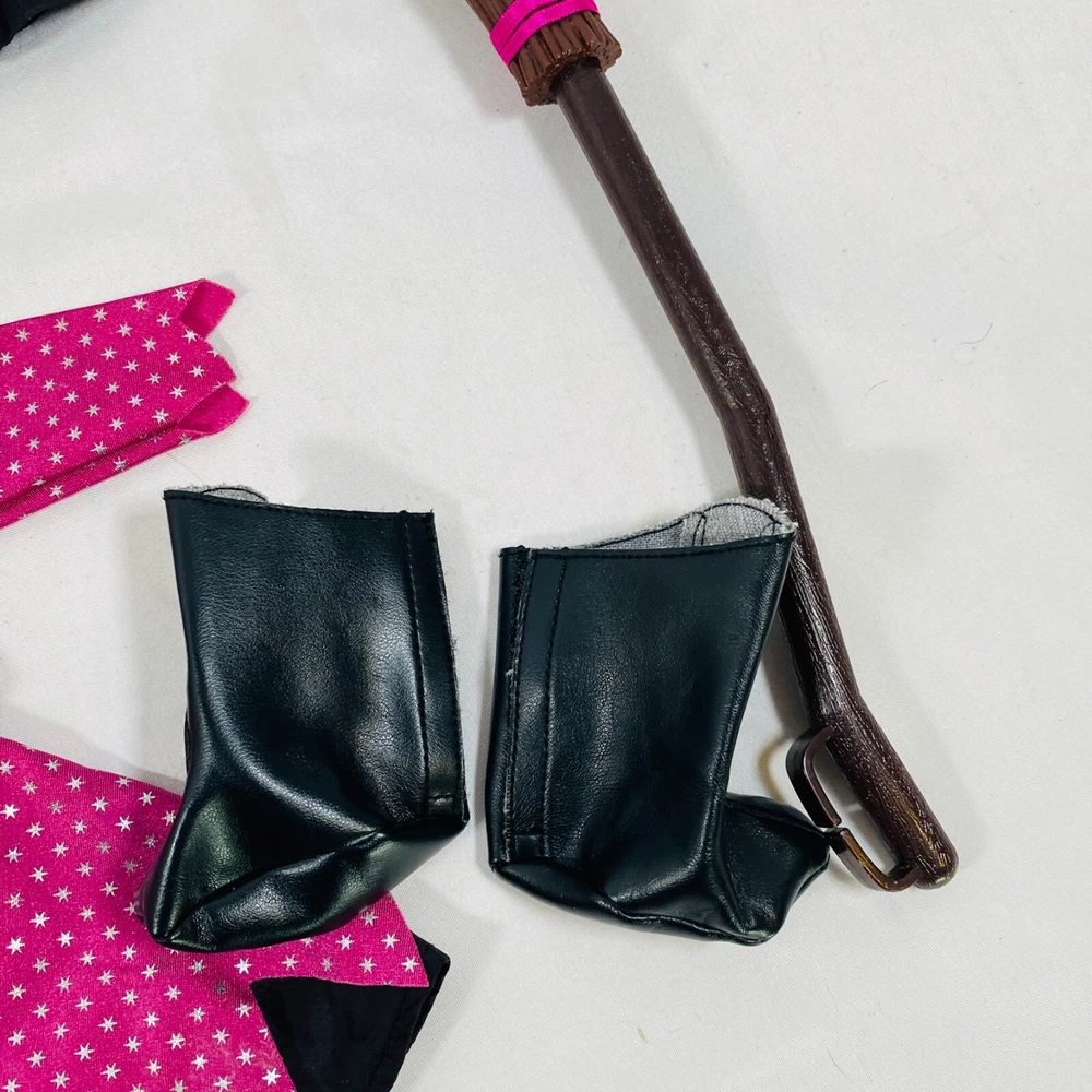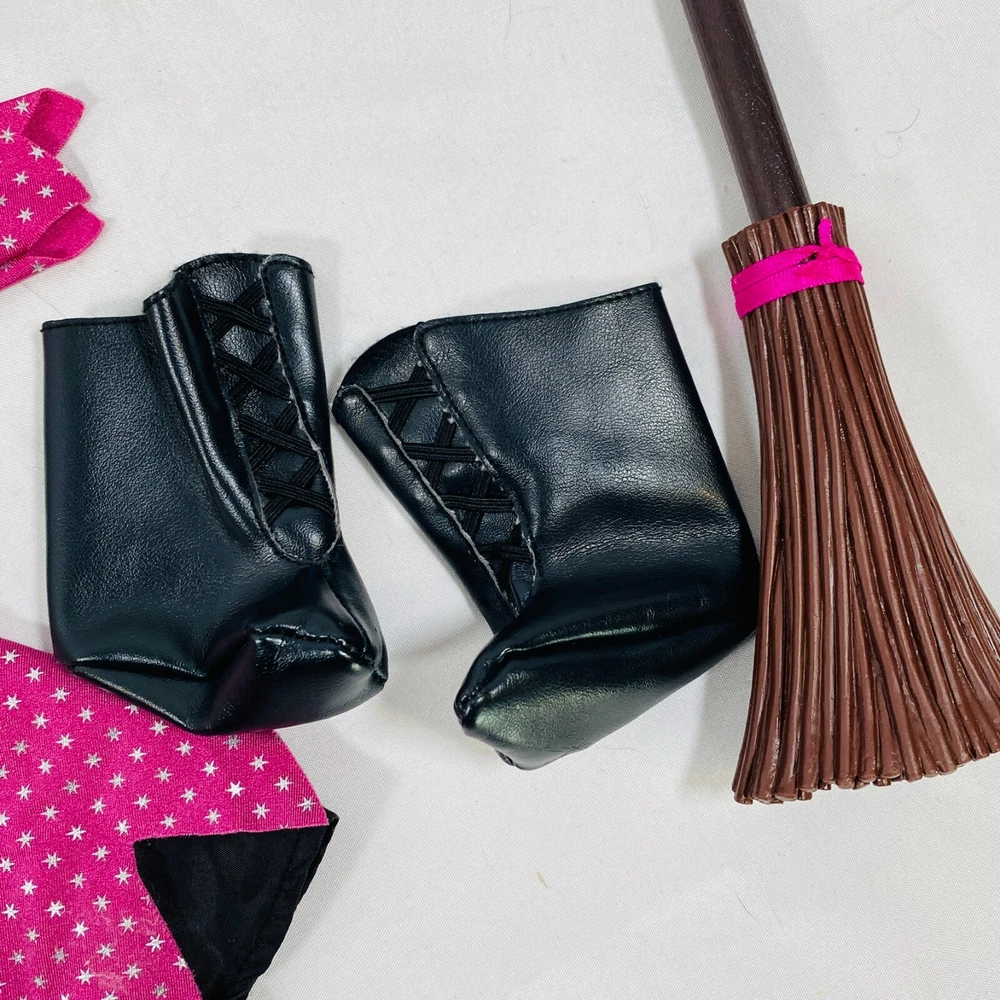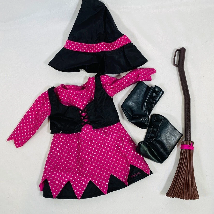 18" American Girl Doll 2013 Pink Halloween Witch Costume, Complete Set. Includes Hat, Dress, Boots, and Broom. In gently played with condition, some white marks on dress hem and hat as pictured, may wash out, I haven't tried. No other flaws noted. Please see all pictures for exact cosmetic condition and other details, and ask any questions before purchasing. We are a husband and wife team with a growing family, and greatly appreciate your support of our small business. Please browse our eBay store for a variety of other American Girl items. We hope you enjoy this set!