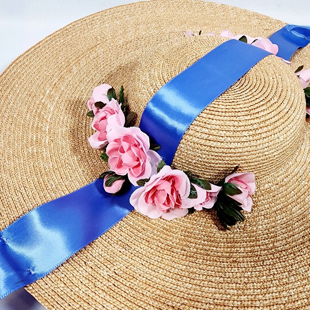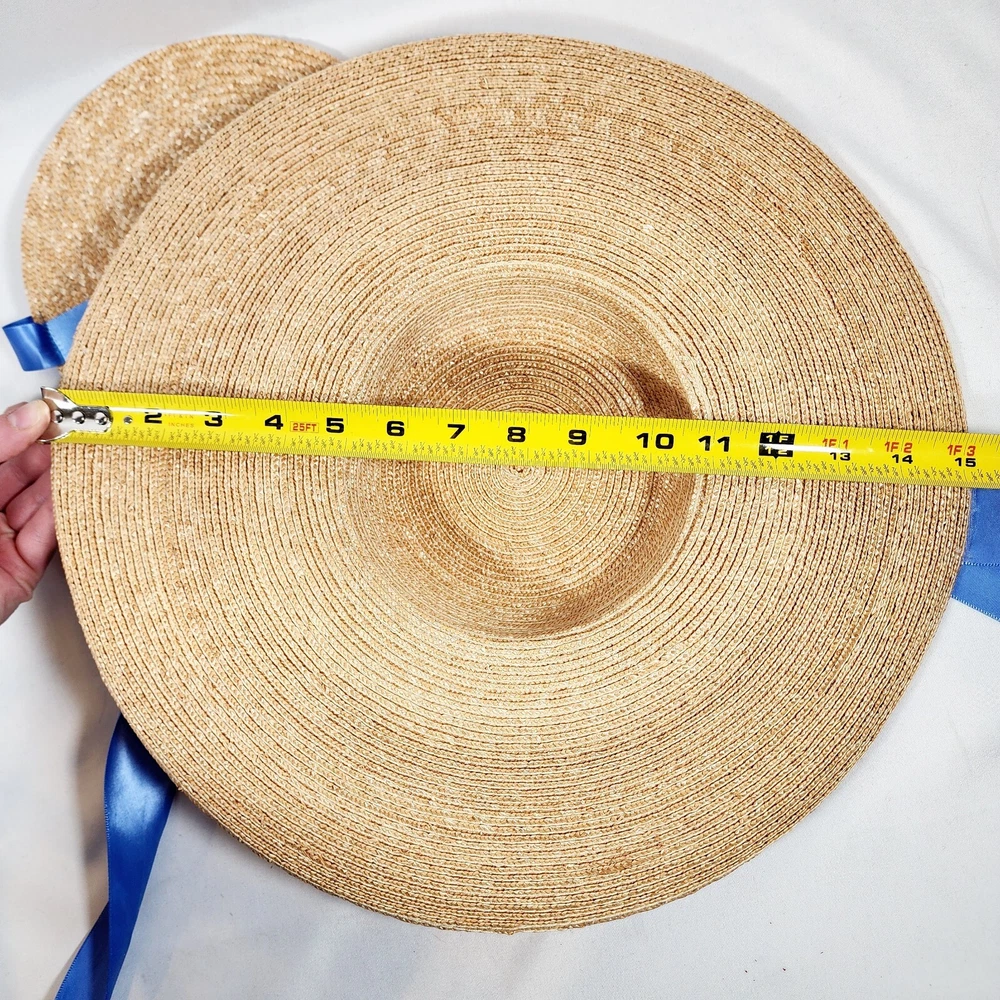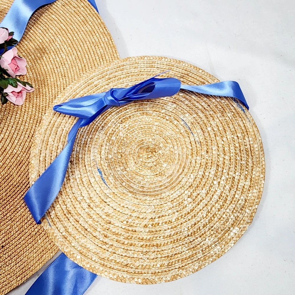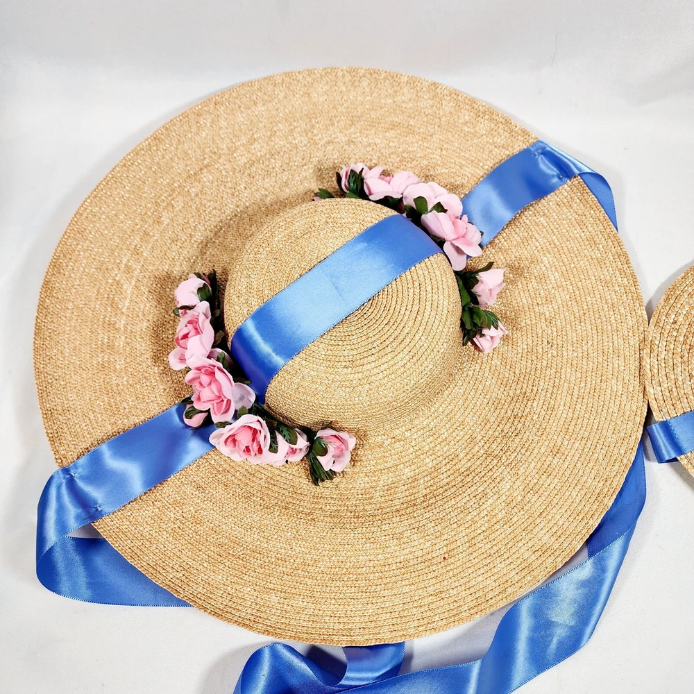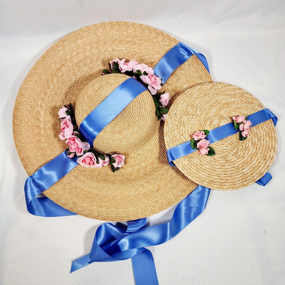 The American Girl Collection - Matching Straw Hats for Felicity's Summer Gown Outfit. Set includes 1 Hat Sized for 18" Dolls and 1 Child-Sized Hat. These are from the Pleasant Company era of American Girl, and definitely genuine. The Girl-Sized one is from the "Dress Like Your Doll" Line, which was phased out around 2000. Extremely rare and hard to find. Hats are both Rose-Trimmed, Wide-Brimmed, Straw Hats, and tie on with blue satin ribbons. Ribbons are stitched along edges of hats to keep them from slipping around. Set is in excellent condition, may have a tiny flaw in the weaving here and there but nothing noticeable. Ribbons in both hats are in great shape, as are the flowers. I think the hats are fairly flexible in sizing and could likely fit a girl or adult, depending on how you want them to fit and the size of your head, of course. Measurements of the girl-sized hat are as follows: 15 3/4" brim edge to edge, 6" diameter of hat inner crown Please see all pictures for exact cosmetic condition and other details, as they are part of the description as well, and ask any questions before purchasing. We are a husband and wife team with a growing family, and greatly appreciate your support of our small business. Please browse our eBay store for a variety of other American Girl items. We hope you enjoy this set!
