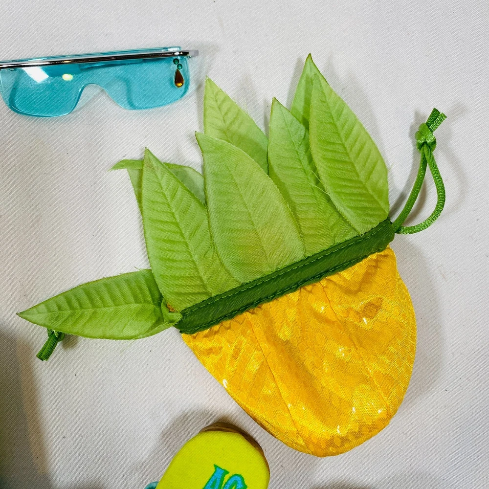 18" American Girl Doll 2004 JLY "Tropical Breezes Outfit", Complete Set. Includes Top, Shorts, Bandana, Glasses, Sandals, and Pineapple Bag. In gently played with condition, only tlaw noted is one tiny mark on top as pictured. Please see all pictures for exact cosmetic condition and other details, and ask any questions before purchasing. We are a husband and wife team with a growing family, and greatly appreciate your support of our small business. Please browse our eBay store for a variety of other American Girl items. We hope you enjoy this set!