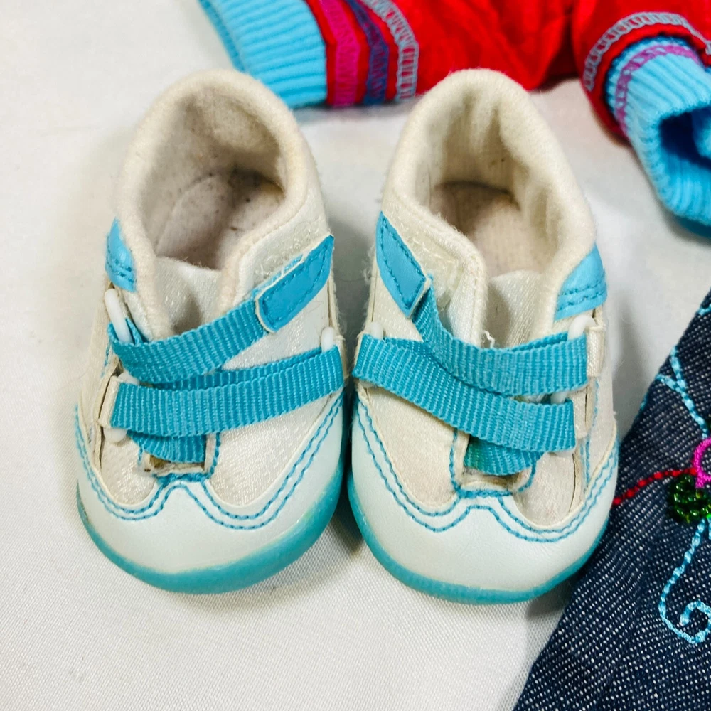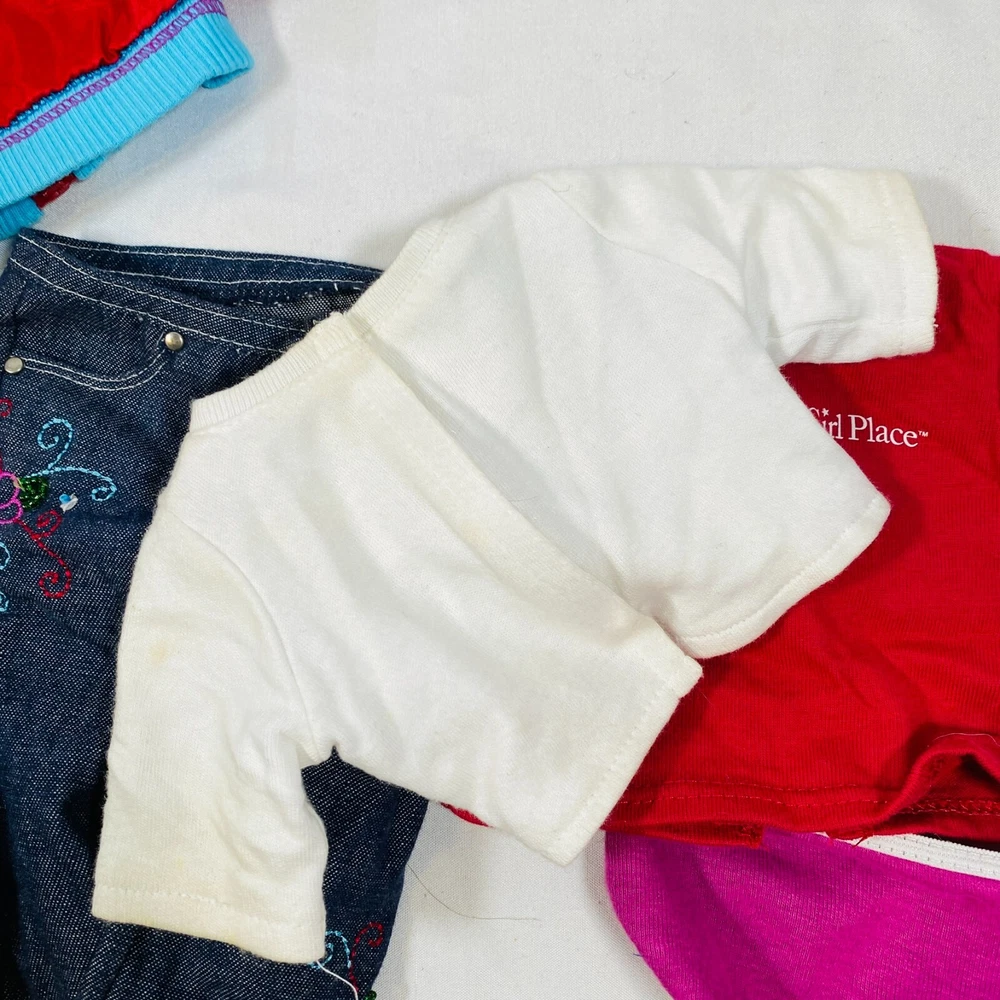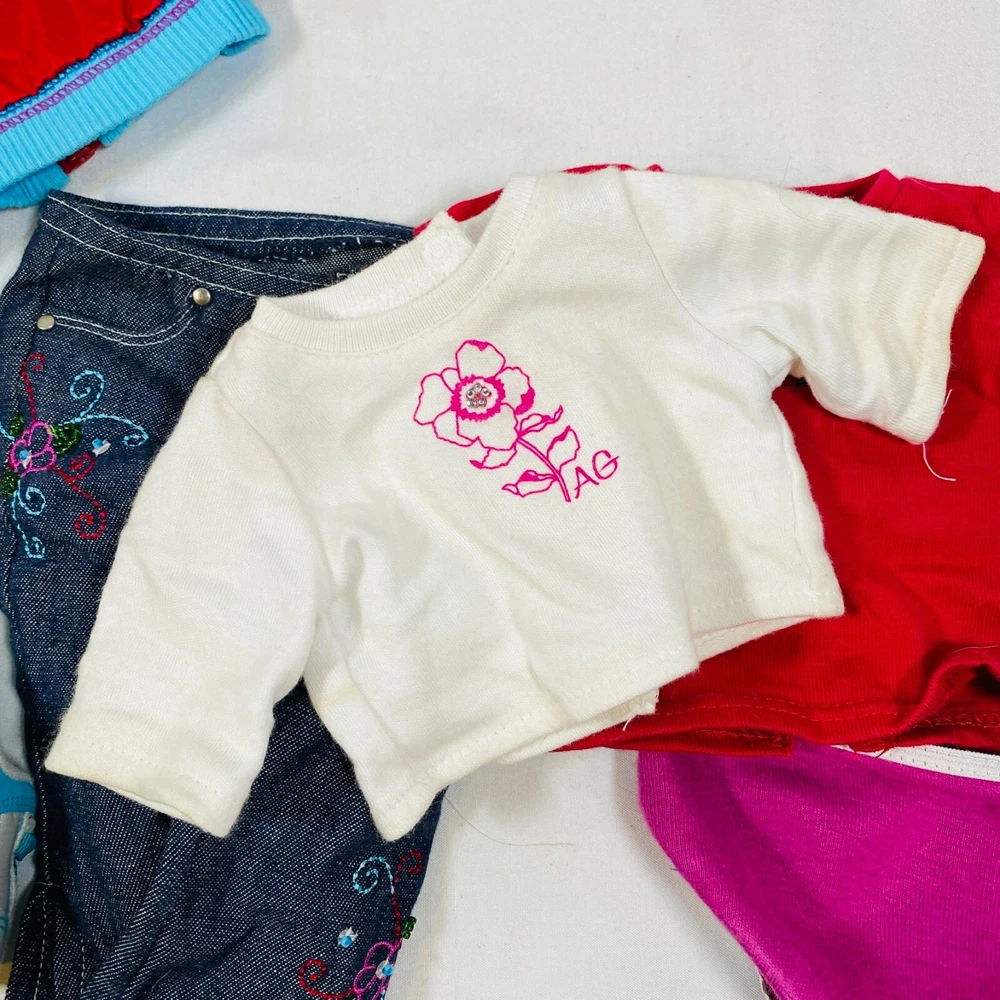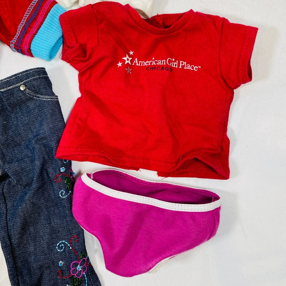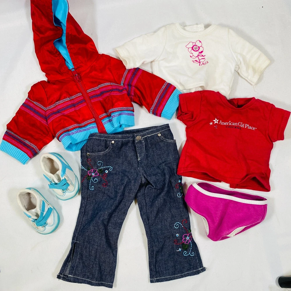 18" American Girl Doll Just Like You "Ready For Fun" Meet Outfit: Red Jacket, White Top, Embroidered Jeans, Magenta Underwear, Tennis Shoes. Just missing the socks. Also includes a bonus American Girl Place Chicago Red T-Shirt. All in gently played with condition, main flaw noted is some smudging on white shirt. Please see all pictures for exact cosmetic condition and other details, and ask any questions before purchasing. We are a husband and wife team with a growing family, and greatly appreciate your support of our small business. Please browse our eBay store for a variety of other American Girl items. We hope you enjoy this set!