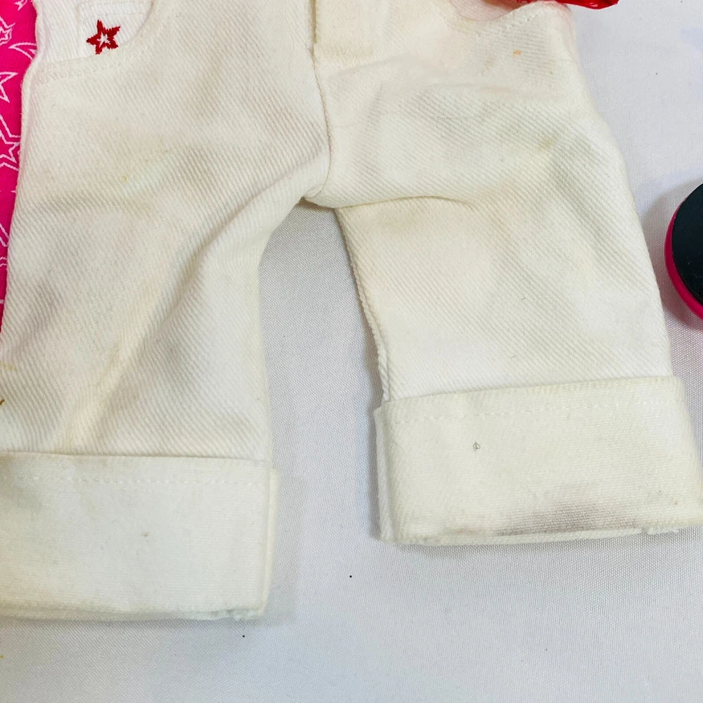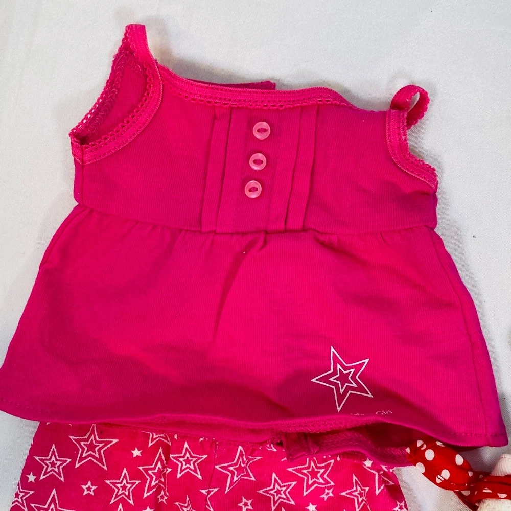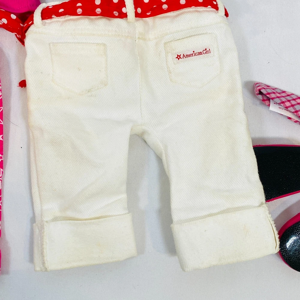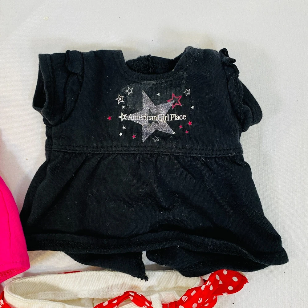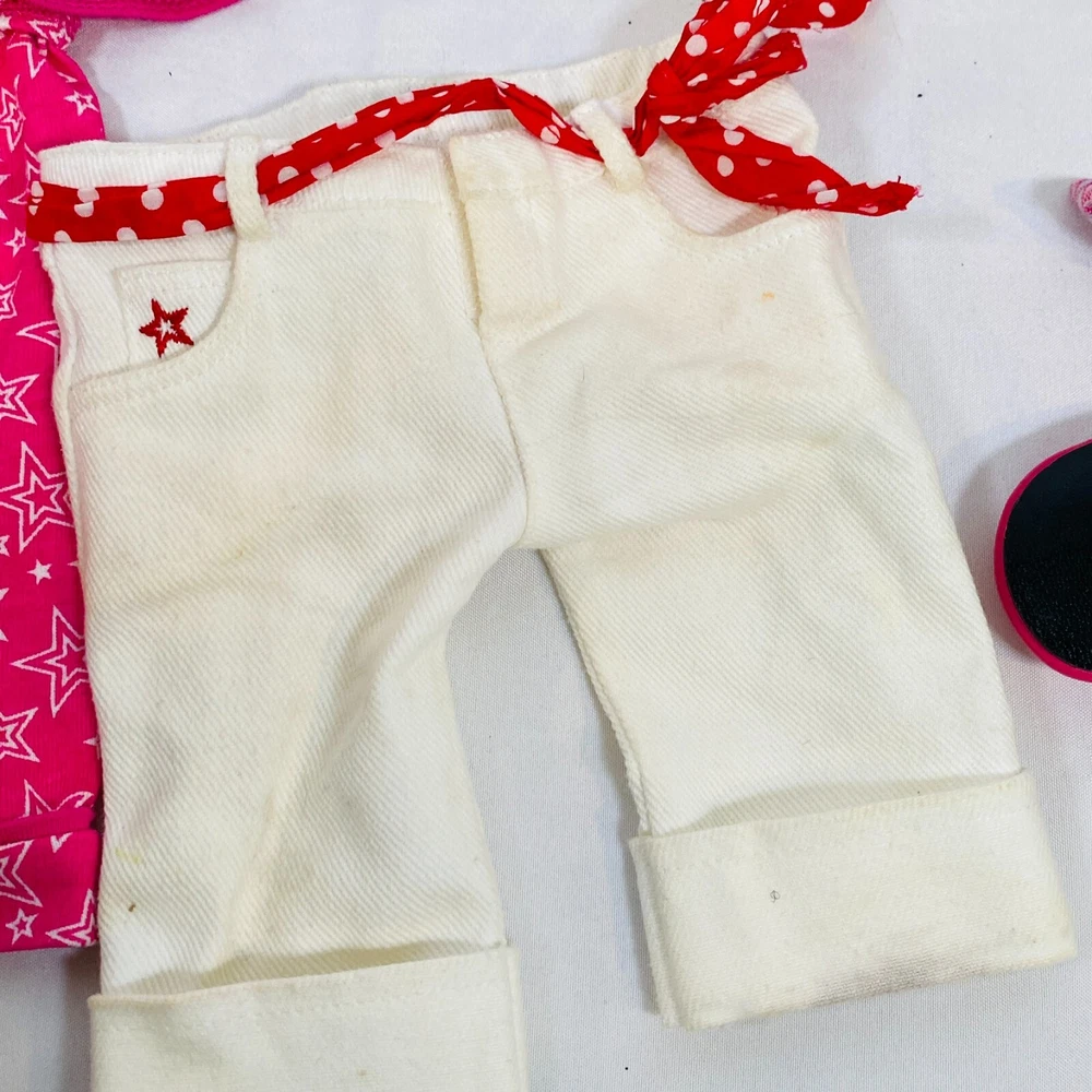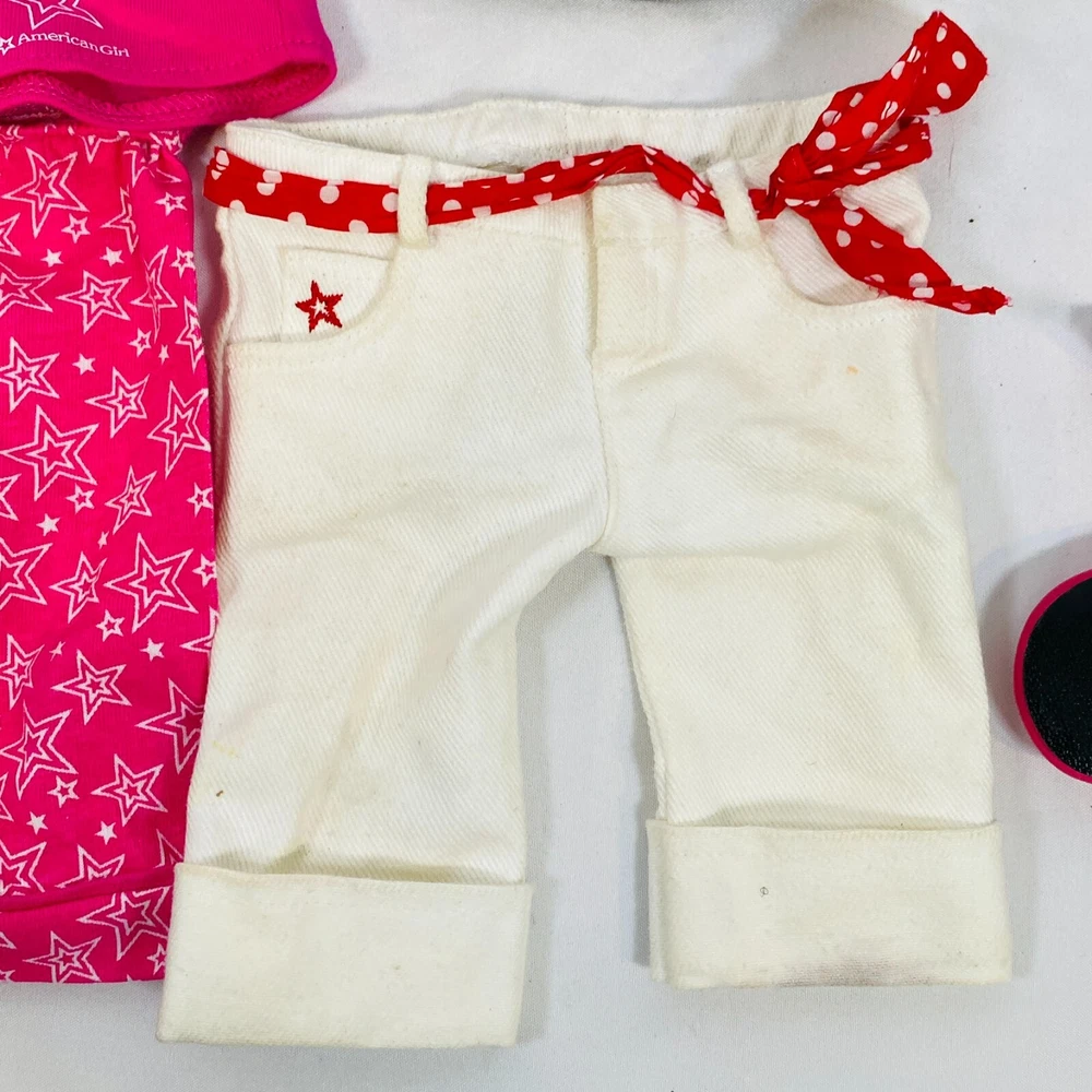 18" American Girl Doll Place Store Exclusives. Set includes the following: American Girl Place Pink Pajama Top & Pants American Girl Place Black T-Shirt American Girl Place White Capri Pants JLY Star Hoodie Meet Outfit: Plaid Headband + Pink Shoes Red Balloon In gently played with condition, capri pants are stained/dirty, one mark on balloon, no flaws noted on other pieces. Please see all pictures for exact cosmetic condition and other details, and ask any questions before purchasing. We are a husband and wife team with a growing family, and greatly appreciate your support of our small business. Please browse our eBay store for a variety of other American Girl items. We hope you enjoy this set!