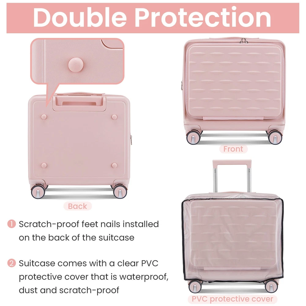 18" Carry On Luggage with Front Open Door &Laptop Interlayer, Hard Shell Suitcase Built-In TSA Luggage Lock, Hardside Lightweight PC Travel Suitcase for Women Men with Spinner Wheels Airline Approved Specifications Place of Origin China Main Color Pink Main Material PC Dangerous Goods #dangerFlag# Dimensions & Weights Assembled Length (in.) Not Applicable Assembled Width (in.) Not Applicable Assembled Height (in.) Not Applicable Weight (lbs) Not Applicable Product Features 【TSA Combination Lock】 TSA customs locks allow for more security and privacy during the journey, with the ability to perform non-destructive opening and inspection.