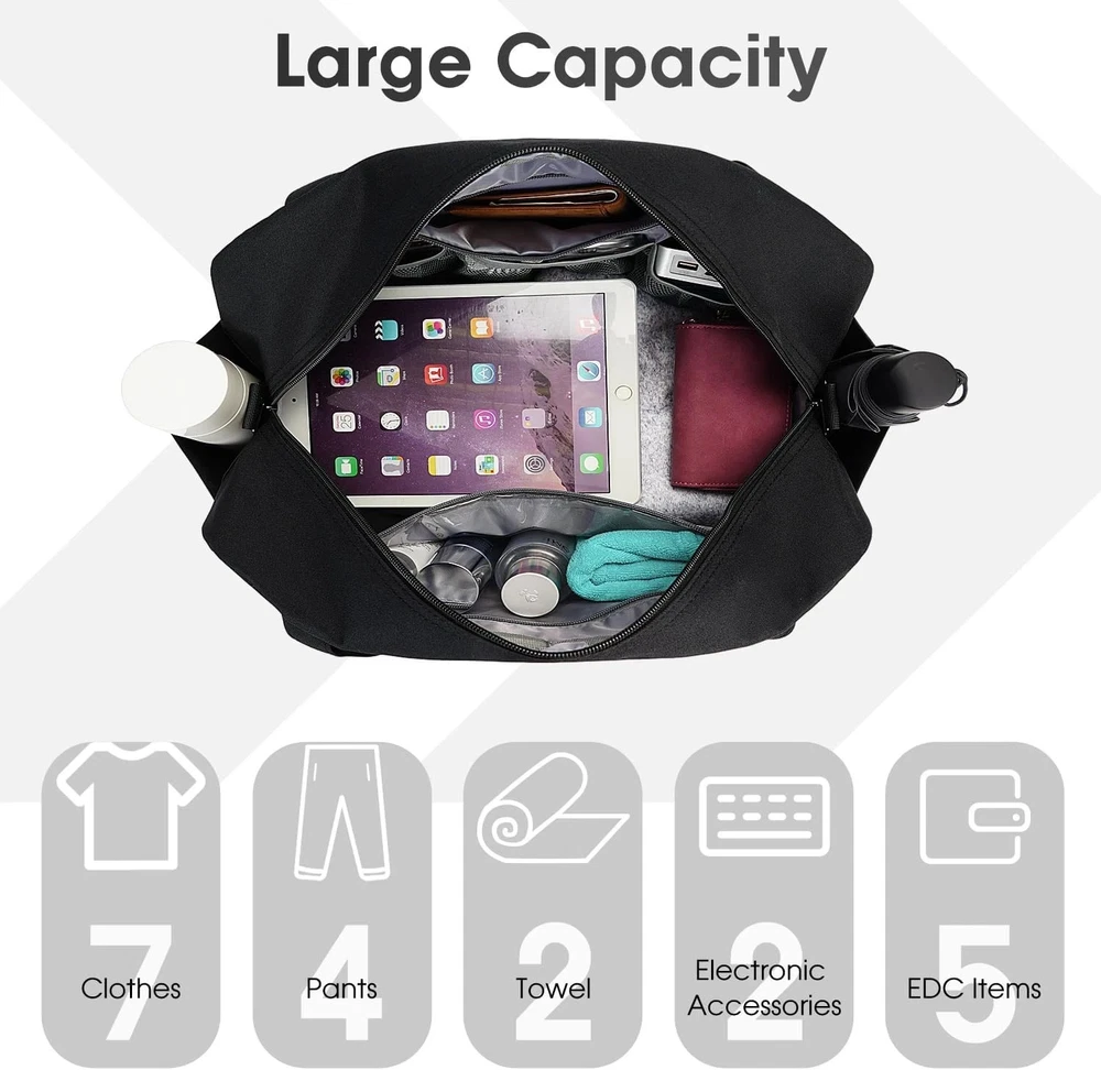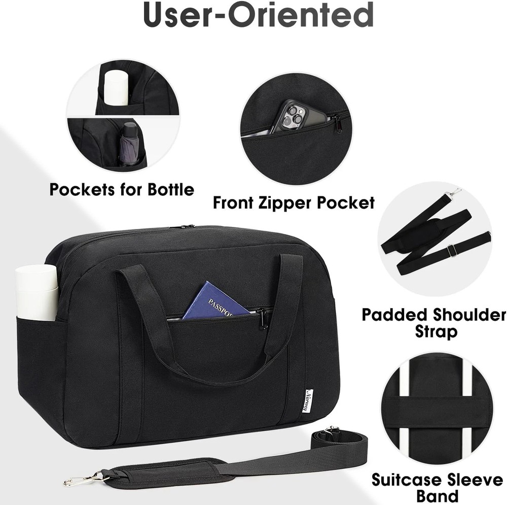 Narwey 18" Carry on Bag Underseat for Airplane Spirit Airlines Personal Item Travel Bag 18x14x8 Small Duffle Bag Duffel Bag Gym Weekender Overnight Bag with Wet Pocket for Women and Men (Black) Description : Airline-friendly Travel Bag. Bag size 17x11.5x7.5 inch (Capacity 25L) fits personal item size 18x14x8 of Spirit Airlines & Frontier Airlines, which can be placed under seat and no need to pay carry-on. 25L main compartment could accommodate all your travel items for 3 to 4 days or a week's worth of clothe Wet Dry Separated Small Gym Bag. Spacious enough for all your gym essentials yet compact enough to fit in a gym locker. Waterproof material lined wet pocket is ideal for storing wet or leaky items, such as toiletries and towels. Both sides feature pockets for water bottles and umbrellas Premium Weekender Bag. Go hands-free with adjustable and detachable padded shoulder strap and suitcase sleeve band. Sturdy and water resistant fabric avoid any rip and protect your gears well from rain or wet during trips. Convenient for a weekend get away Multiple Reasonable Pockets. Front zippered pocket allows quick access to frequently used items like tickets or passport. 3 inner mesh pockets could keep small items organized. No more scrambling - this bag keeps your essentials handy Multi-purpose Design. More than carry-on, it tackles a wide variety of situations. Ideal for garment bag, hospital bag, sports, gym use, yoga, travel, weekend shopping, overnight, camping and picnic