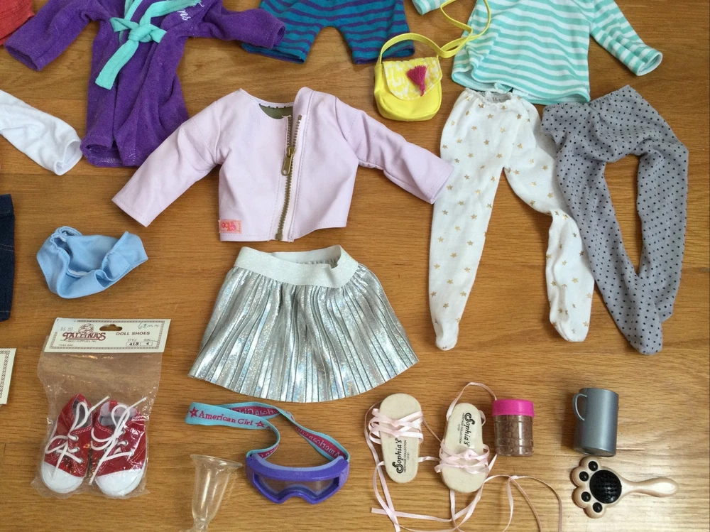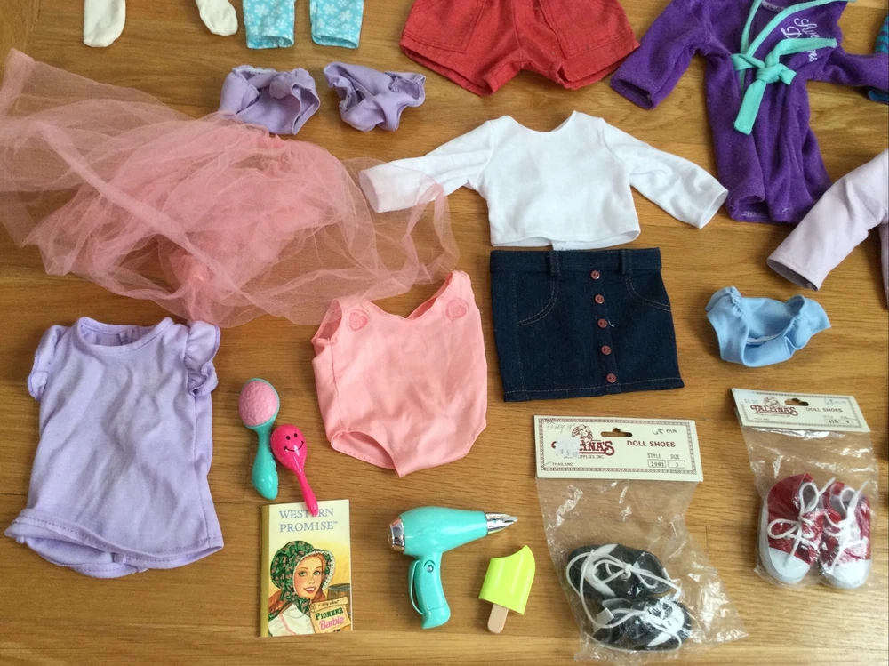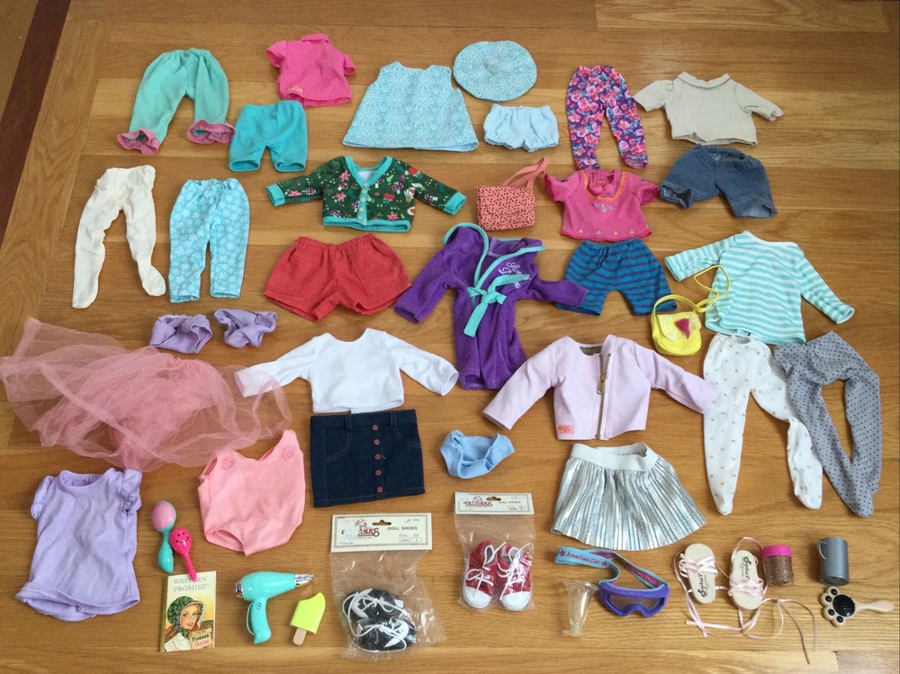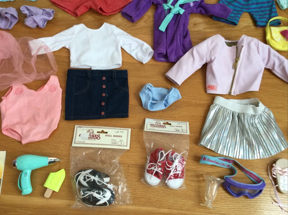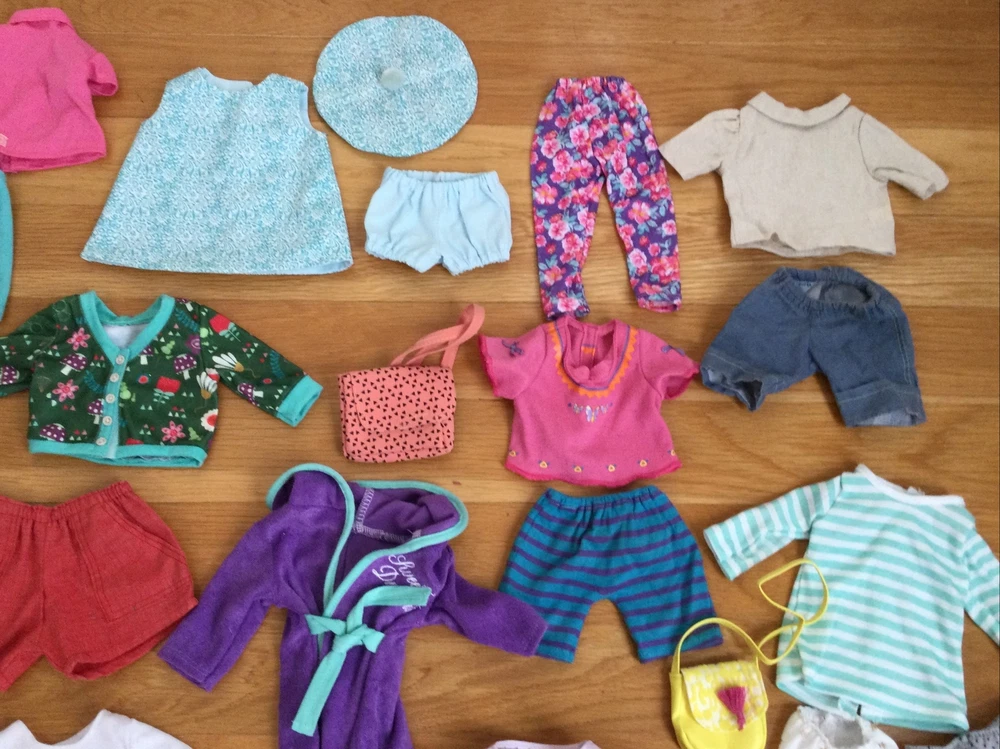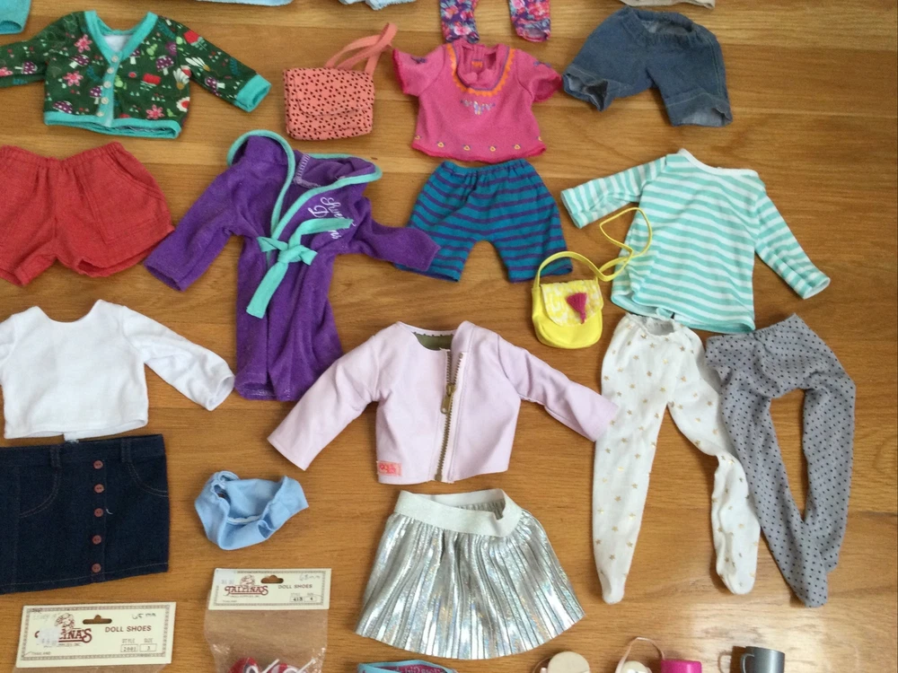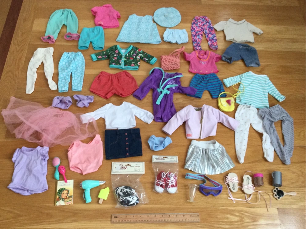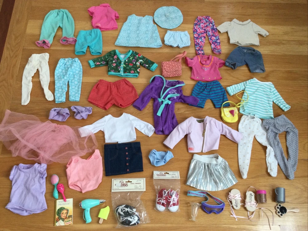 Doll Clothing and accessories lot: -Ballet Dance Leotard (OG) -Yellow Purse/ Bag -White and Teal Floral Dress w/ hat (Homemade) -Tutu -Red and White Shoes (Tallina’s) -Zippered Faux Leather Jacket/ Coat (OG) -Black and White shoes (Tallina’s) -Beige Top with Buttons (OG) -Bathrobe -Denim Skirt -MORE From a smoke-free and pet-free home. Freshly laundered! Mixed brands as noted above, some Unbranded. Some vintage. Clothing fits 18” American Girl/Battat OG dolls. Please see photos to supplement this description. Ruler indicates size. I am happy to combine shipping so please see my other listings (including LOTS of vintage and collectible items INCLUDING OTHER 18” DOLL/ AMERICAN GIRL DOLL LOTS THIS WEEK!). Thanks and good luck!!