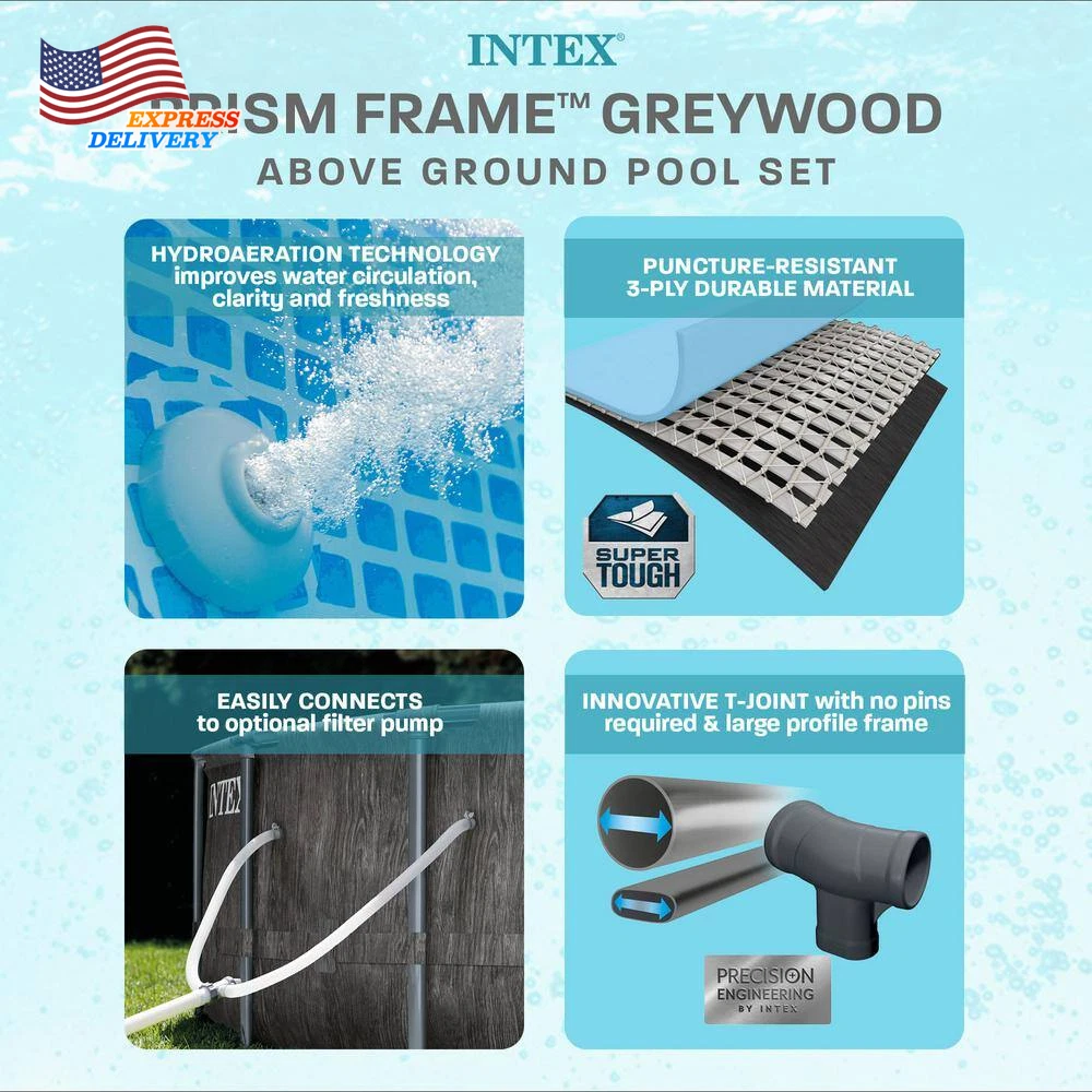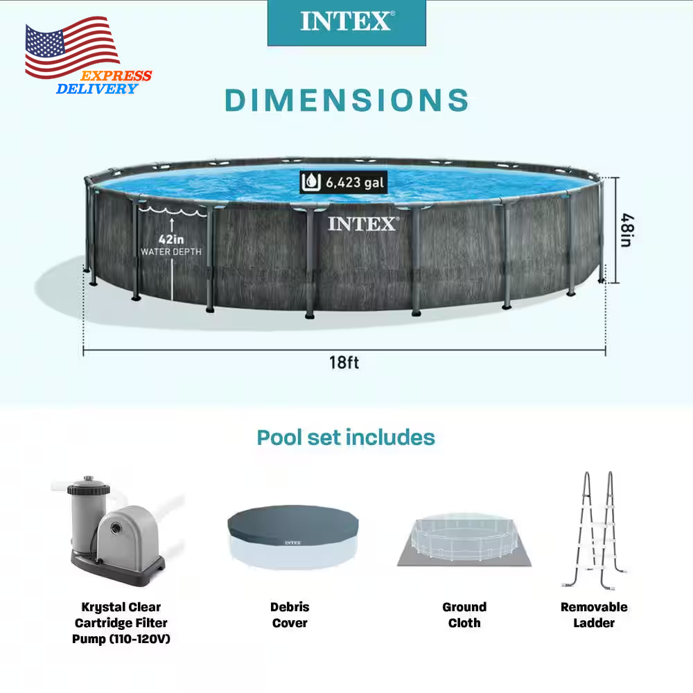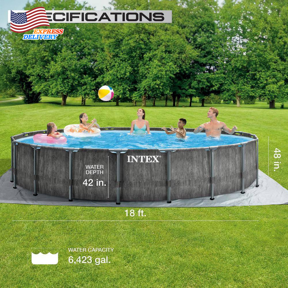 Store New Arrivals Add to Favorite View Feedback Contact 18 Ft. round 48 In. Deep Hard Side Prism Steel Frame above Ground Pool Set NEW Description Assembly Required Yes Capacity (gallons) 6423 gal Color Family Grays Color/Finish Gray Features Drain,Filtration Frame Material Steel Included Cover,Ground Cloth,Ladder Outdoor Living Product Type Framed Pool Product Weight (lb) 211.2 lb Recommended Capacity Up to 6 adults Returnable 90-Day Shape Round Manufacturer Warranty 1 Year Pool Depth (In) 216 Pool Size Round-18 ft. Pool Wall Height (in) 48 Stylish woodgrain exterior complements any backyard aesthetic Durable frame with polymer T-joints for added strength Quick and easy setup in 60 minutes, no tools required Whether you're hosting a summer get-together or need a day of relaxing, have everything you need with the Greywood Prism Frame Pool Set from Intex. Featuring a sophisticated woodgrain pattern, this pool provides a beautiful look and feel that will complement any backyard aesthetics. The sturdy frame and innovative Polymer T-joints ensure ultimate durability and a quick, easy assembly process. Constructed of durable 3-ply materials that resist punctures, you'll be splashing in this pool for years to come. The Hydro Aeration Technology incorporated into the cartridge filter pump offers improved circulation and filtration, water clarity, and increased negative ions at the water surface. Including a 1,500 Gal. cartridge filter pump, ladder, ground cloth, and convenient pool cover, you'll have everything you need for the perfect day in the sun. Splash the day away and have a blast with the Intex Greywood Prism Swimming Pool Set. Disclaimer: Please review your HOA rules and restrictions before purchasing this product. Not all housing agencies permit private above-ground pools. ABOUT US We offer the best prices around on high quality products. Our E-store includes media such as books, movies, music and games while offering electronics, toys, sporting apparel, clothing, tools, general home, garden items and more. SHIPPING We are always working hard to ensure your package arrives as soon as possible. Please understand that some factors like weather, high postal traffic, and the performance of shipping companies are outside of our control. We offer free shipping to the lower 48 states and ship within 2 business days of payment, usually sooner. We do not accept P.O. Boxes. Please provide a physical address. For shipping outside of the continental USA, we only use eBay's Global Shipping Program.The item is shipped to KY and then sent to the rest of the world. International customers are responsible for all duties and taxes. Continue to check out in order to calculate costs for shipping the item to your country. Messages regarding eBay's Global Shipping Program MUST be directed at eBay EXCLUSIVELY. RETURNS We offer a 30-Day Return Policy on items which you are not completely satisfied with. You have the option for a full-refund or an exchange of the item. No returns are available on items shipped outside of the USA. PAYMENT We accept PayPal. CONTACT US This page content is yet to come Please ad us to your favorite seller and visit again later Thank You CUSTOMER SATISFACTION We try our very best to make sure every customer is completely satisfied. If there's a problem, message us! We're happy to help. WE ACCEPT Copyright © 2021 AutoDS. | All Rights Reserved