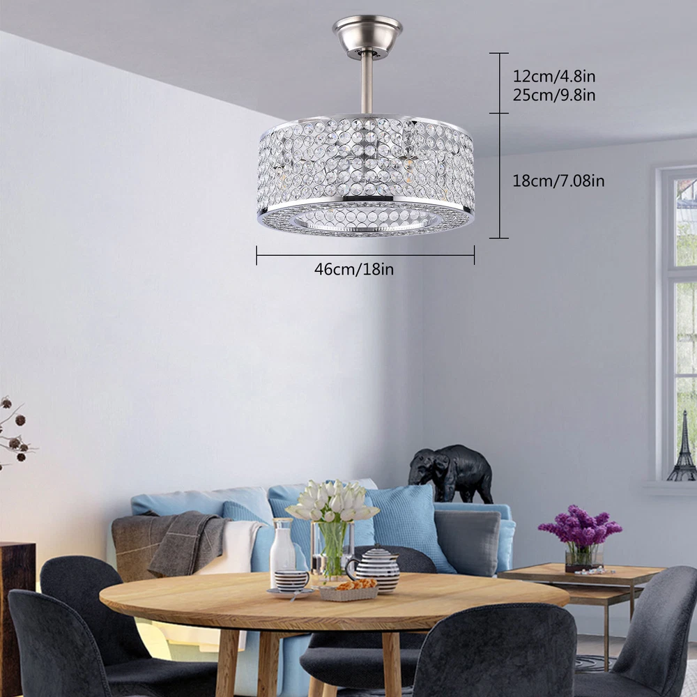 18"Ceiling Fan Lamp Crystal LED Caged Flush Mount Chandelier Bladeless w/ Remote 18'' Cage Ceiling Fan Light Crystal LampShade Fan Chandiler W/ Remote ✦ About this item 【Unique and safe novel design】 Crystal shade, Unique to say the least, thecomposition of cage ceiling fan is quite striking, combining modernity and elegance in one. The exterior crystal lampshade a stylish theme while protecting the light bulb and the central fan blade. It's perfect for a loft or office space, hang in your eating area and enjoy the cool breeze. Light & Fan—This ceiling fan with is designed for who need marvelous update for your house. Suit for ceiling from 7.5-11.5 feet, and room from 8-15㎡like children room, bedroom, kitchen island or dinning room. Easy to install: hard wire. perfect design to illuminate your space, whether it is a kitchen island, dining room, bedroom, foyer or any other place. 【Remote Control】 The Industrial ceiling fan lights fixture with 3-speed adjustment (low/medium/high) and 3 fan timing options (1/2/4H) sleep shutdown about multi-function remote control. The fan and lights can be controlled separately, which can control your ceiling fan quickly and easily!(max distance of 20 meters). 3 Gear Wind—The enclosed ceiling fan speed vary from soft to cool, match daily needs; ABS fan blades, durable, lightweight and easy to clean. Timing Function—Smart timing set to automatically POWER OFF light and fan after you fall asleep. Mute Motor—Indoor/Outdoor ceiling fan is equipped with a whisper wind motor which makes no noise, stay away from any noise interference while providing a quiet and comfortable environment. ✦ Dimensions Fixture Height: 7.08" (18 cm) Fixture Width: 18" (46cm) ✦Bulb Information Bulb requirements: use (4) E26bulbs, maximum 60watts, options include incandescent, fluorescent, LED, halogen, etc. (bulbs are not included) Wattage: Max 60W Voltage: AC110-120V Remote control: yes ✦Material and Colour Material: Nickel-plated metal +crystal ✦ Package Included 1 *Fan Light (Bulbs Not Included) 2*Down rods (12CM & 25CM) 1 * Accessories package 1 * User Manual Easy to install: surface mounted. Products include English manuals, remote control and installation instructions, with the provided bracket, providing easier installation and detailed installation instructions. Applicable scenarios: The chandelier is suitable for home and commercial spaces,such as living room, dining room, kitchen island, bedroom, foyer, farmhouse , bar, restaurant, gallery, exhibition room, hotel, coffee shop, office。 ✦Suggestion: 1. For a safe and secure installation, please ensure that the electrical box to which this fixture will be mounted is properly attached to a structural member of the building. 2. All wires are connected. When unpacking, be careful not to pull with wires as a bad connection may result. 3. Do not connect electricity until your fixture is fully assembled. Payment Delivery details Terms of sales About us Contact us Payment We accept ebay payment 。 Fees such as import duties, taxes are not included in the item price or shipping costs. These charges are the buyer's responsibility. Delivery details Shipping: 2-9 working days to: USA Terms of sales We maintain high standards of excellence and strive for hundred percent customer satisfaction. Feedback is very important to us. We hope that you contact us immediately before you give neutral or negative feedback, so that we can address your concerns. It is impossible to address issues if we do not know about them! About us Your satis faction is our ultimate goal. We work hard to earn your trust and future business. Our certified technicians have tested each item before shipping. The unit comes with 1 year limited warranty on all manufacturing defects. a) If you receive a defective item, you may return it or ask for a discount. Please contact us within 14 days after you receive the package. b) What you returned must be intact and in its original packaging as re? u. Customer is responsible for shipping costs of the returned item. c) We will cover the cost of shipping back t with the shipping rate indicated in the registration page. We will send you a new unit or refund the full payment you paid. Thank you. Contact us Business Hour Business Hour: Monday To Friday: 8:30 AM to 5:00 PM (Beijing China time) Due to time zones, our reply to your questions may not be immediately. But within above working time, we will reply your email within 24 hours. If it's non-workdays, please kindly be patient and wait till Monday. Please contact us with ebay message. Please feel free to contact us if you have any questions. Monday To Friday: 8:30 AM to 5:00 PM (Beijing China time) Due to time zones, our reply to your questions may not be immediately. But within above working time, we will reply your email within 24 hours. If it's non-workdays, please kindly be patient and wait till Monday. Please contact us with ebay message. Please feel free to contact us if you have any questions. On Mar 2, 2025 at 18:26:30 PST, seller added the following information:
