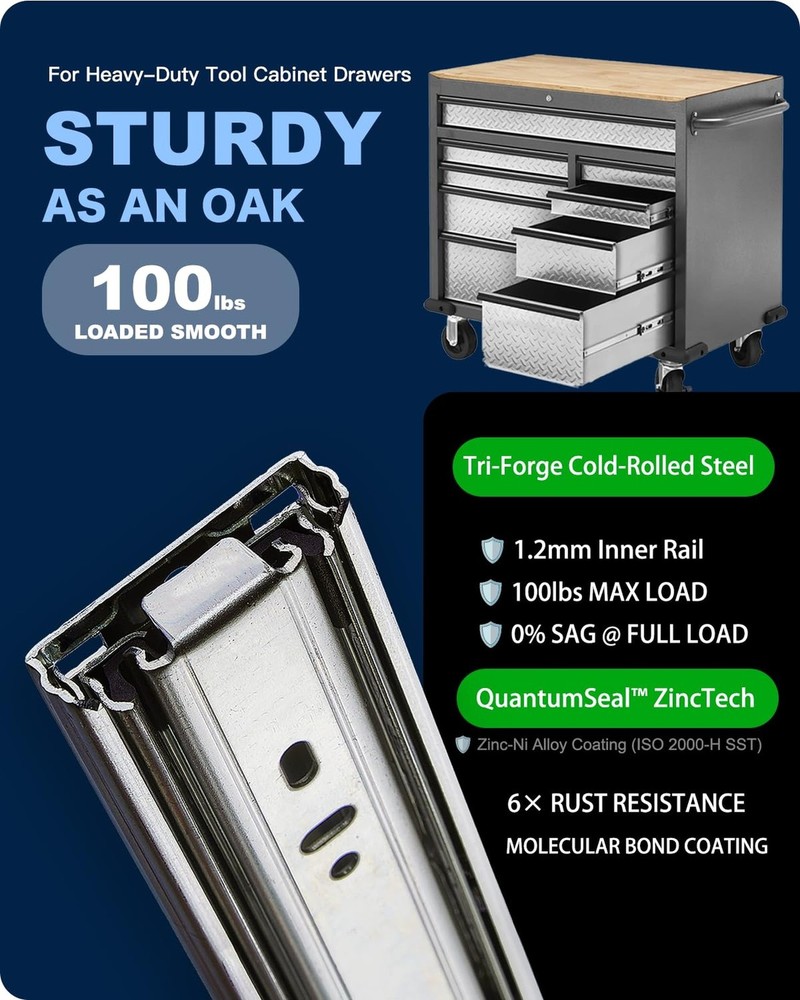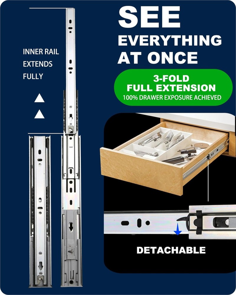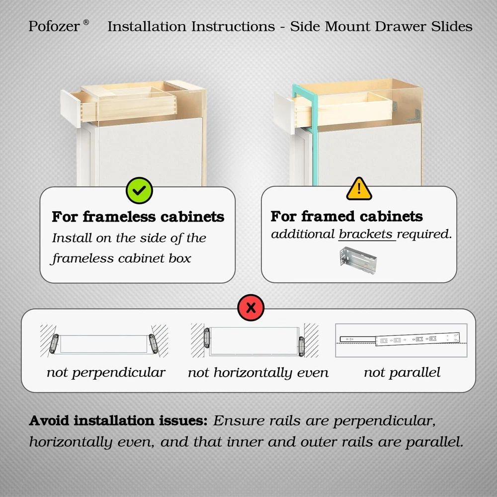 18 Inch Soft Close Drawer Slides – 6 Pairs, Heavy Duty Ball Bearing, Full Extension for Cabinets and Dressers, 100 LB Capacity Product Details Model: Soft-Close, 6 Pairs Size: 18 Inch Brand: Pofozer MPN: Soft-Close, 6 Pairs UPC: Does not apply EAN: Does not apply Color: White Material: Alloy Steel Brand: Pofozer Product Dimensions: 17.72"L x 1.77"W x 0.5"Th Finish Type: Powder Coated Mounting Type: ‎Side Mount Weight Limit: ‎97.16 Pounds Drawer Type: ‎Wardrobe drawers,Dresser drawers,File cabinet drawers,Cabinet drawers,Tool chest drawers,heavy duty drawer Manufacturer: ‎QunFa Number of Items: ‎12 Part Number: ‎Soft-Close, 6 Pairs Item Weight: ‎15.57 pounds Product Dimensions: ‎22 x 1.75 x 0.52 inches Country of Origin: ‎China Item model number: ‎Soft-Close, 6 Pairs Size: ‎18 Inch Finish: ‎Powder Coated Maximum Weight Capacity: ‎97.16 Pounds Included Components: ‎drawer slides Batteries Included?: ‎No Batteries Required?: ‎No Date First Available: June 28, 2024 Soft Close Function: The soft close drawer slides mechanism activates in the last 2.5 inches, ensuring that even if the drawer is slammed shut, the drawer slides automatically lock and slowly close completely, providing a serene and smooth finish. Top-notch Rust Resistance: These drawer hardware are electroplated with zinc for enhanced rust protection and greater surface hardness, ensuring seamless durability for 10-20 years of dependable use. Strong Load Bearing: Crafted from high-grade cold-rolled steel, these heavy duty drawer slides offer superior resistance to bending compared to hot-rolled steel. With a thickness of 1.21.01.0 mm, they support up to 100 lbs (recommended not to exceed 80 lbs), making them ideal for heavy-duty applications. Smooth and Quiet Bearing Design: Featuring continuous bearings and precision engineering, these ball bearing drawer slides ensure exceptionally smooth and quiet operation, enhancing user experience tremendously. Full Extension: The full extension drawer slides allow complete access to the entire drawer. Their three-stage extension design can fully pull out the drawer, maximizing storage access and efficiency. Dimensions: Measuring 17.72" (450mm) x 1.77" (45mm) x 0.5" (12.7mm), these 18 inch drawer slides fit perfectly in the right settings. Installation Method: Designed for side mount, this product set is optimal for frameless cabinets, where the slide can be directly side-mounted. Framed cabinets require the purchase of additional rear brackets. Ensure you choose a slide that is 1 inch shorter than the actual cabinet depth for perfect fit. Suitable Furniture: These versatile slides can be installed in cabinet drawer slides like kitchen drawers, dresser drawer slides, bedroom wardrobe drawers, bathroom cabinet drawers, desks or study tables, shoe cabinet drawers, storage benches, or beds, and are also suitable for drawer replacement or hardware upgrades. Drawer slides are an essential component for any cabinet or furniture with drawers. These unassuming metal tracks allow drawers to glide effortlessly in and out, making accessing your belongings a breeze. Sturdy and durable, quality drawer slides can support heavy loads without sagging or binding. They come in various styles, from basic epoxy-coated steel to sleek ball-bearing models that offer smooth, silent operation. When selecting drawer slides, consider the weight capacity, extension length (how far the drawer pulls out), and mounting type to ensure a perfect fit for your project. Whether you're building a new dresser or upgrading an existing one, the right drawer slides can transform the functionality and longevity of your furniture. With proper installation and maintenance, these hardworking hardware pieces will keep your drawers operating like new for years to come.