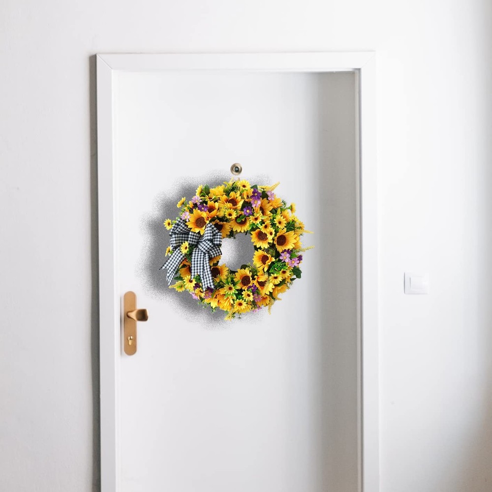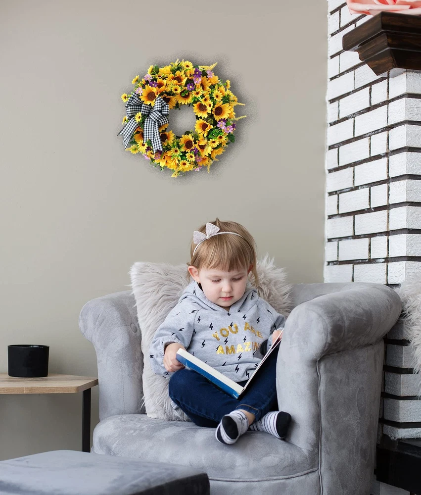 High quality: These beautiful sunflower wreaths are handcrafted, and each flower is handcrafted with care, accented with brown long-lasting twigs that cover the base of the floral wreath. High quality: These beautiful sunflower wreaths are handcrafted, and each flower is handcrafted with care, accented with brown long-lasting twigs that cover the base of the floral wreath. Natural appearance: The beautiful sunflower wreath is decorated with small daisies-all the flowers look beautiful and full of vitality. Light color, perfect to illuminate any room, soft and comfortable feeling, strong rigidity. Very Suitable Size - Artificial sunflowers are 18inches in overall diameter, there are 25 large sunflowers, 8cm in diameter. After the product is received, it needs to be tiled and arranged. The 18-inch diameter includes small flowers on the outer ring. Due to manual measurement, please allow 1-2cm error. Use it for a long time: this yellow sunflower wreath is not only used in spring and summer, but also as a year-round decoration. Vivid and bright colors add warmth and make people love it. Multifunctional decoration:The front door wreath can be used indoors and outdoors, is a versatile decorative accessory. Hang it on the front door, living room, fireplace, closet, wall, window, shelf and other places you like.