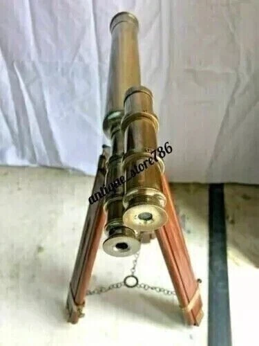 Antique Nautical 18 Inch Telescope With Wooden Table Standing Brass Tripod Stand Material : Brass,Glass & Wood Finish : Antique Brass Finish (as shown in picture) Tripod Color : As Shown In Image TUBE LENGTH OF TELESCOPE : 45 cm MAXIMUM HEIGHT OF TELESCOPE : 70 cm The focus is adjusted by rotating the threaded section near the eyepiece.