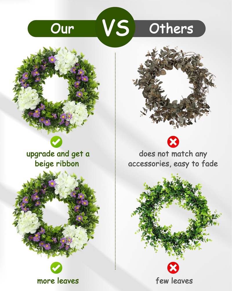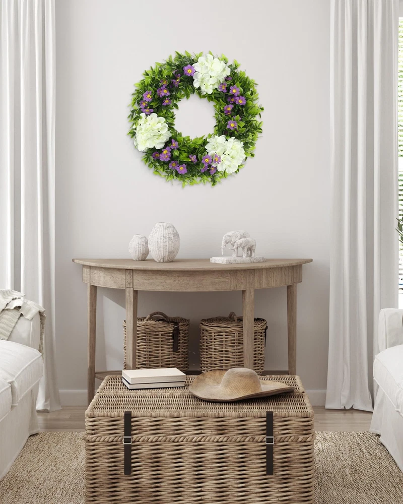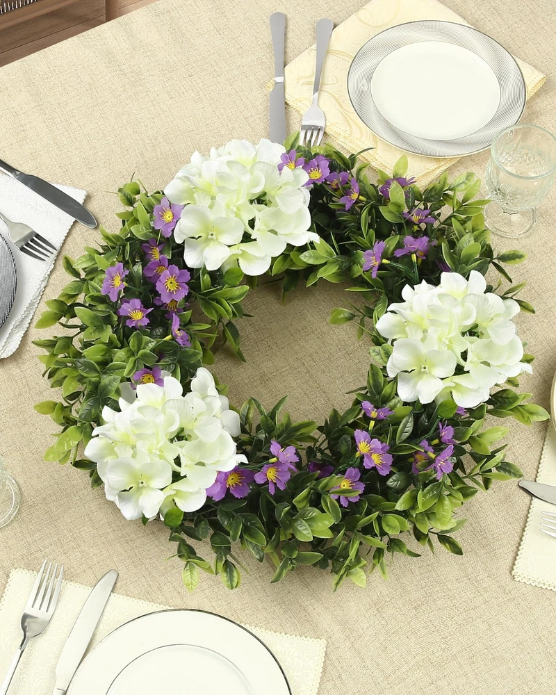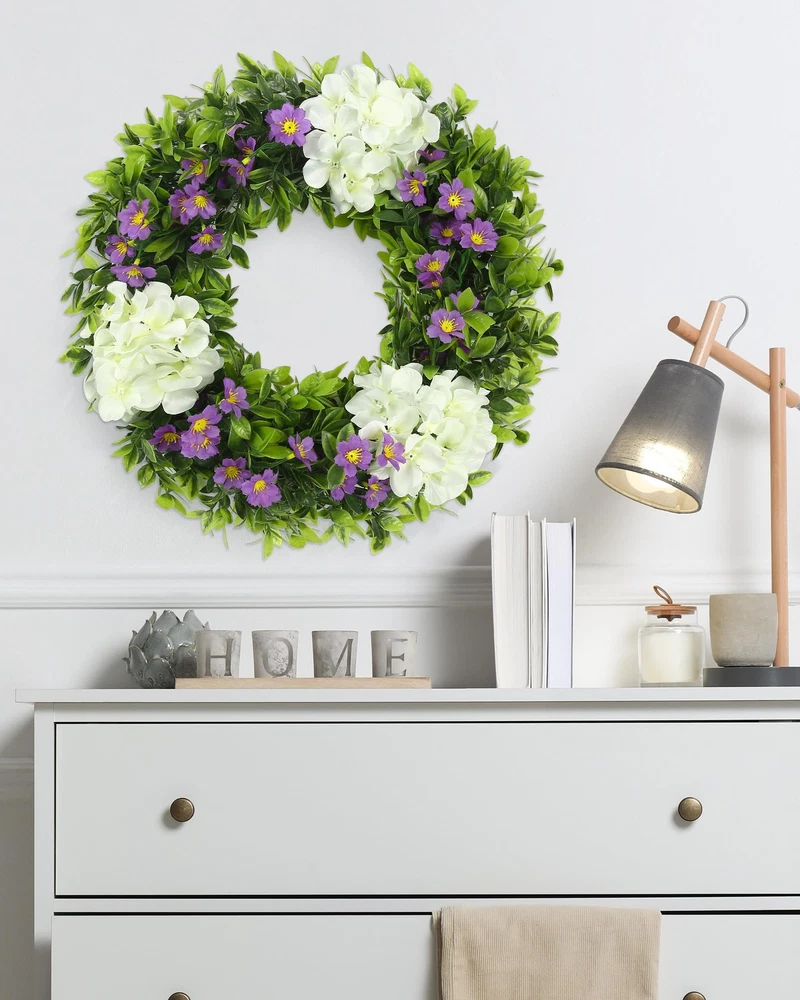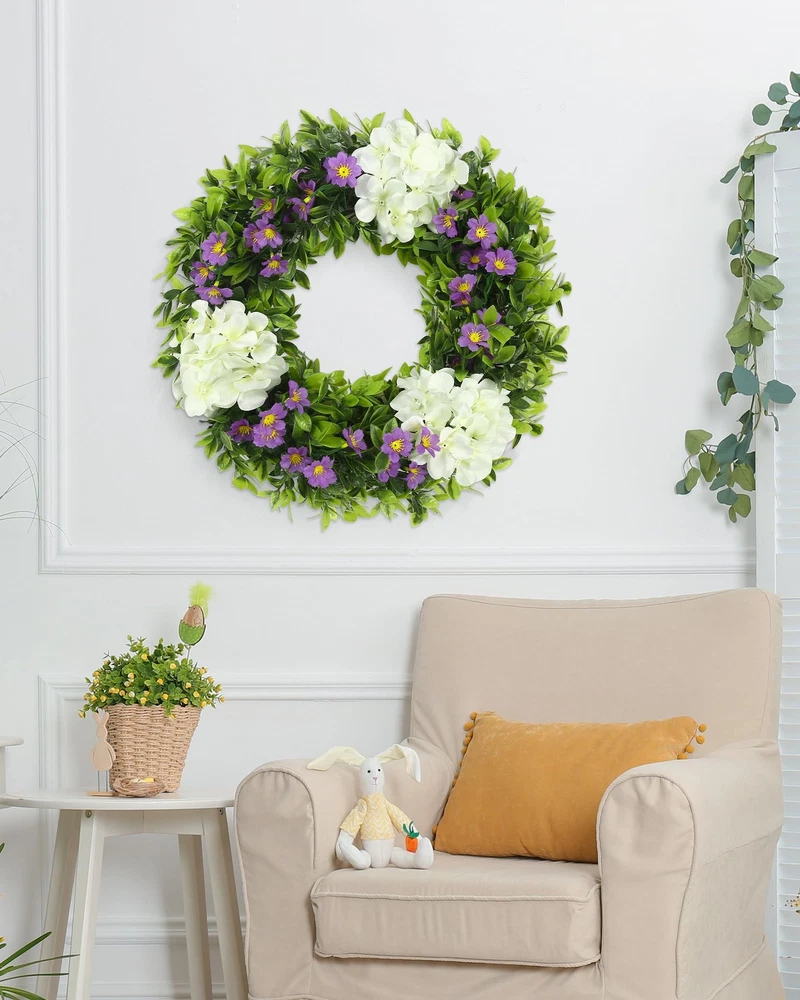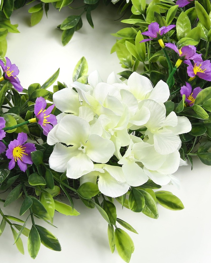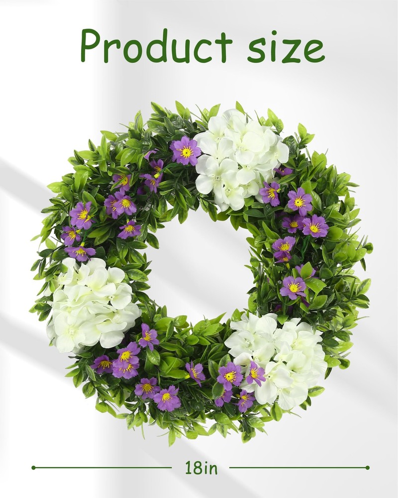 Wreaths Fresh and elegant overall look: This 18-inch white hydrangea wreath is like a pure dreamland, and it will firmly lock people's eyes as soon as it appears. It exudes a fresh and elegant atmosphere. Although it is not large in size, it has a delicate and charming charm. Whether it is hung on the door or placed indoors, it can instantly create a quiet and warm atmosphere for the surrounding space, like a fairy in a white gauze skirt, gracefully descending on the earth. Lively and lively dragon grass: 39 three-headed six-layer grass dragons, like lively green vines, naturally and smoothly surround the wreath. Their slender branches and leaves stretch freely, and each leaf is shining with vitality, as if it is a green line carefully drawn by nature. When the breeze blows, the dragon grass sways gently, as if it is whispering a natural ballad, adding a lively rhythm to the wreath. Pure and romantic hydrangea blooms: three white hydrangeas, like white clouds, float lightly on the wreath. Their large and plump flower balls are surrounded by countless small petals, and the pure white color exudes a soft light, as if they were flowers kissed by angels. Each hydrangea is so delicate and beautiful, bringing a pure and romantic atmosphere to the entire wreath. Playful embellishment of purple flowers: 9 branches of 4-pronged purple flowers, like purple elves, playfully shuttle through the wreath. Their unique 4-pronged shape seems to have equipped these elves with smart wings. The purple petals are particularly eye-catching against the background of white hydrangeas and green dragon grass, adding a lively and playful color to the wreath, like jumping notes in the painting. Stable and solid support structure: 97 branches of 7 cm 4-pronged flower plugs, like a solid fortress, firmly support every part of the wreath. They are evenly distributed inside the wreath, with a fine forked design, providing a reliable support for the flowers and branches. Twelve 6-cm iron wires, like invisible threads, closely connect the various parts and enhance the stability of the wreath. The 33-cm hoop bottom is like a solid stage, firmly supporting the entire wreath, allowing its beauty to be perfectly displayed, becoming a beautiful landscape to decorate life.