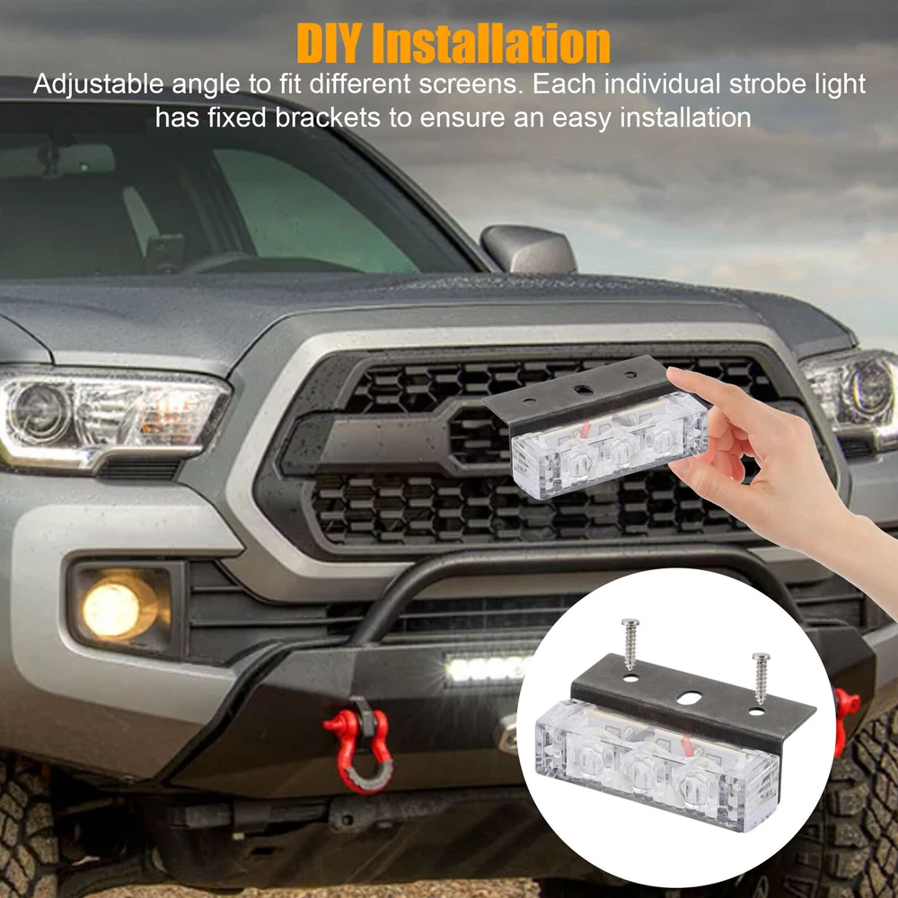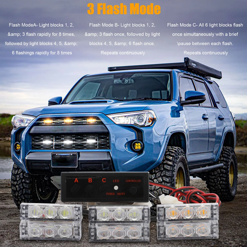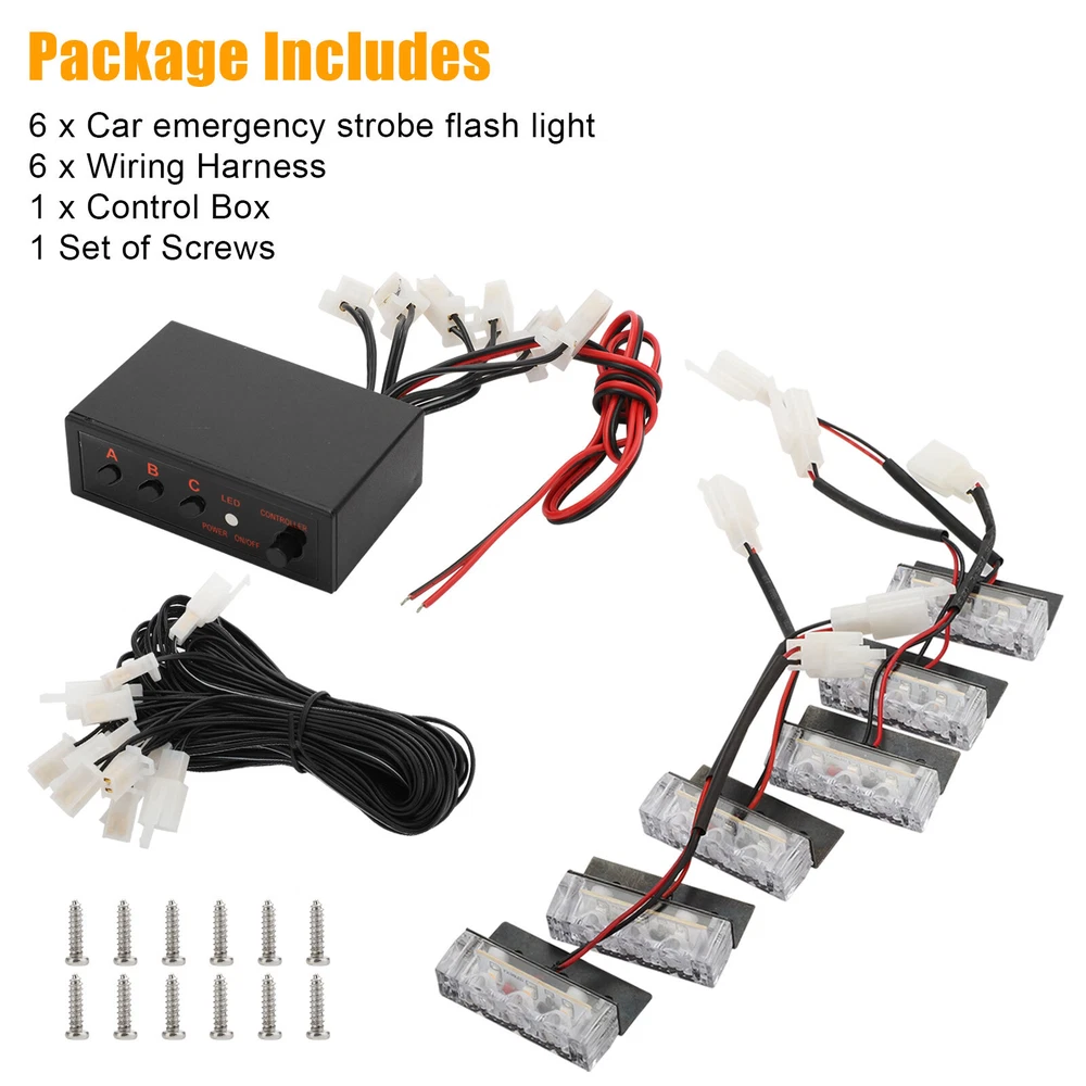 Product Feature ⭐ 【 High Quality 】 : 6 in 1,18 LED, each lamp contains 3 lamp beads . High-power strobe, super bright, increases Visibility. ☔ 【 Waterproof Design 】 : Good sealing performance, waterproof, dustproof, anti-collision, splash-proof, long lifespan . ✔️ 【 Easy To Install 】 : DIY Installation. Adjustable angle to fit different screens . Each individual strobe light has fixed brackets to ensure an easy installation. 🚗 【 Wide Application 】 : Universal fit all Cars SUV vans and trucks with DC 12V . 3 Flash Mode 🔹 Flash Mode A - Light blocks 1, 2, & 3 flash rapidly for 8 times, followed by light blocks 4, 5, & 6 flashings rapidly for 8 times. 🔹 Flash Mode B - Light blocks 1, 2, & 3 flash once, followed by light blocks 4, 5, & 6 flash once. Repeats continuously. 🔹 Flash Mode C - All 6 light blocks flash once simultaneously with a brief pause between each flash. Repeats continuously. Product Specification Type Strobe Light To Fit Brake Light, Foglight, Indicator, Parking Light Lighting Technology LED Number of Lights 6 x LED Grill Lights (3 LEDs per light) Voltage DC 12V Output Power 3W LED Color White/Amber Flashing modes 3 Light Dimensions 48*15*13mm Control Box Dimensions 76*48*25mm Lifespan Up to 50,000-hour life expectancy Placement on Vehicle Front Features Waterproof, Dustproof, Anti-collision, Splash-proof Application Security Vehicles,Construction Vehicles Fit For all Cars SUV vans and trucks with DC 12V Package Included ✅ 6 x Car Strobe Flash Light ✅ 6 x Wiring Harness ✅ 1 x Control Box ✅ 1 Set of Screws