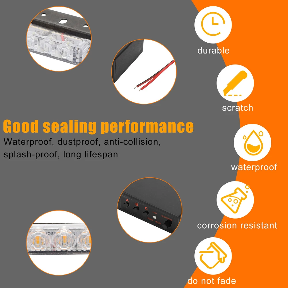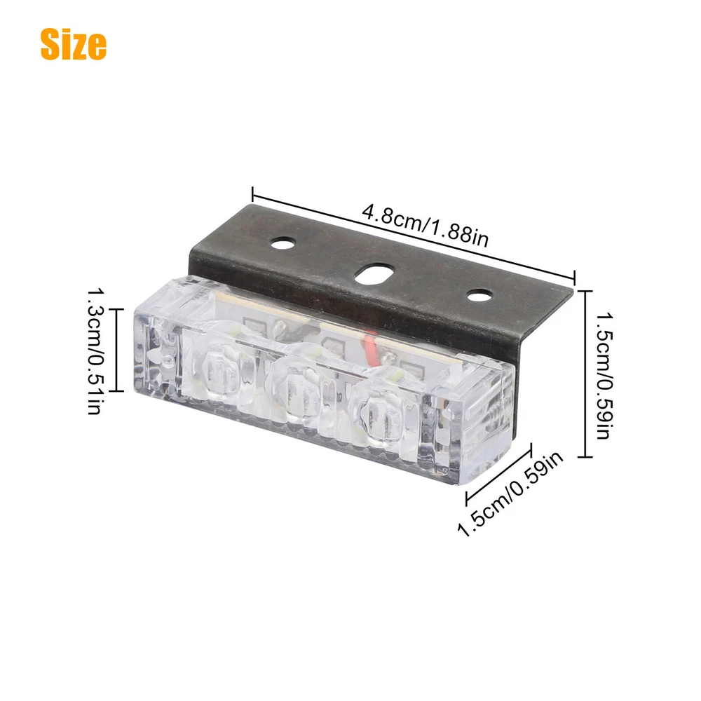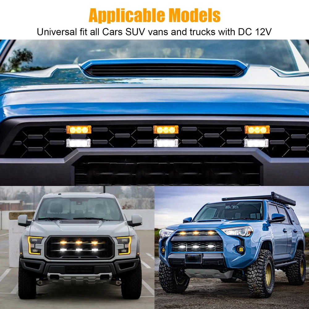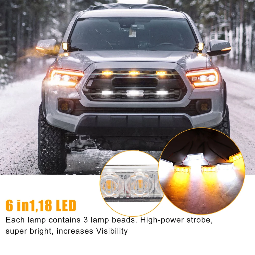 Product Feature ⭐ 【 High Quality 】 : 6 in 1,18 LED, each lamp contains 3 lamp beads . High-power strobe, super bright, increases Visibility. ☔ 【 Waterproof Design 】 : Good sealing performance, waterproof, dustproof, anti-collision, splash-proof, long lifespan . ✔️ 【 Easy To Install 】 : DIY Installation. Adjustable angle to fit different screens . Each individual strobe light has fixed brackets to ensure an easy installation. 🚗 【 Wide Application 】 : Universal fit all Cars SUV vans and trucks with DC 12V . 3 Flash Mode 🔹 Flash Mode A - Light blocks 1, 2, & 3 flash rapidly for 8 times, followed by light blocks 4, 5, & 6 flashings rapidly for 8 times. 🔹 Flash Mode B - Light blocks 1, 2, & 3 flash once, followed by light blocks 4, 5, & 6 flash once. Repeats continuously. 🔹 Flash Mode C - All 6 light blocks flash once simultaneously with a brief pause between each flash. Repeats continuously. Product Specification Type Strobe Light To Fit Brake Light, Foglight, Indicator, Parking Light Lighting Technology LED Number of Lights 6 x LED Grill Lights (3 LEDs per light) Voltage DC 12V Output Power 3W LED Color White/Amber Flashing modes 3 Light Dimensions 48*15*13mm Control Box Dimensions 76*48*25mm Lifespan Up to 50,000-hour life expectancy Placement on Vehicle Front Features Waterproof, Dustproof, Anti-collision, Splash-proof Application Security Vehicles,Construction Vehicles Fit For all Cars SUV vans and trucks with DC 12V Package Included ✅ 6 x Car Strobe Flash Light ✅ 6 x Wiring Harness ✅ 1 x Control Box ✅ 1 Set of Screws