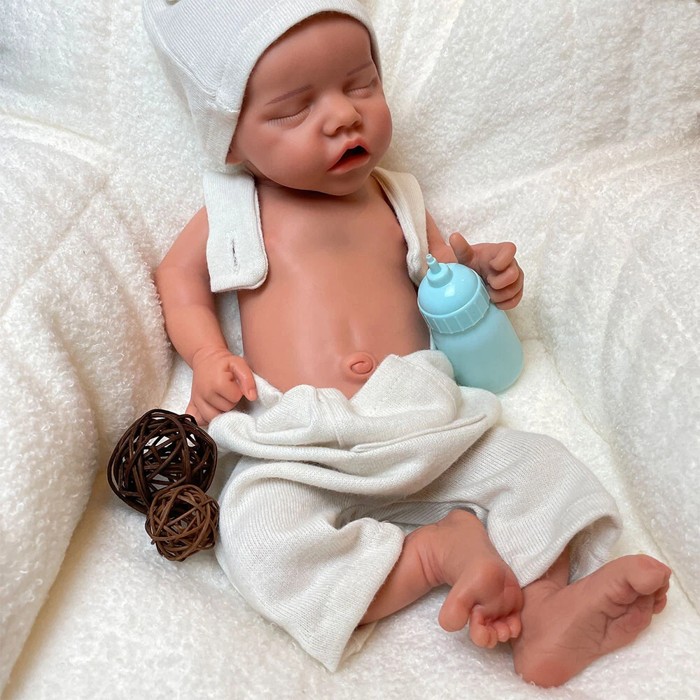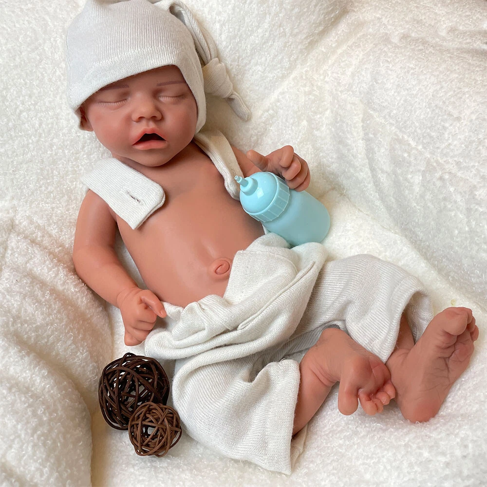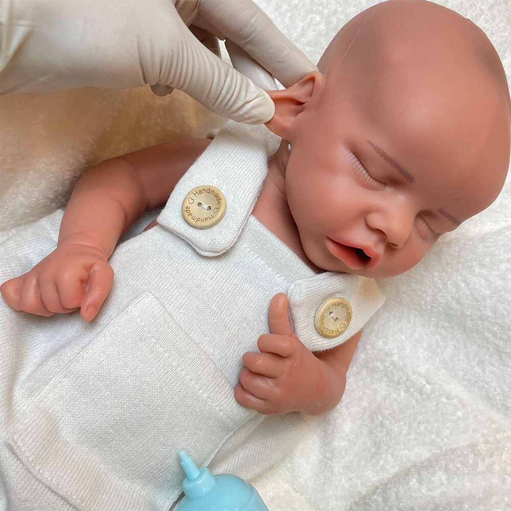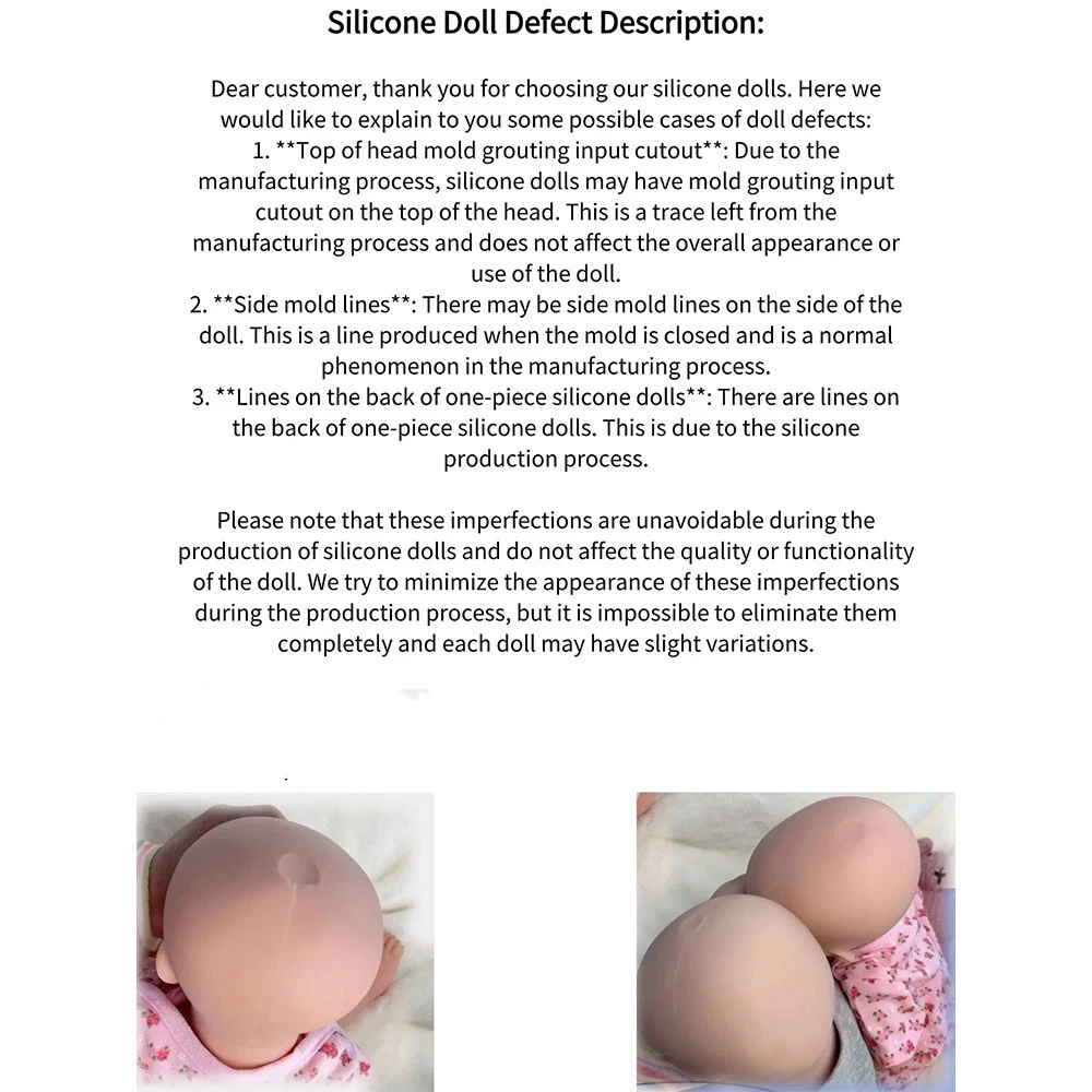 PACKAGE INCLUDES • 1 x painted Silicone Reborn Girl doll (anatomically a girl) *Net weight is about :5.6lb • Size: Around 18Inches from head to toe, . It fits into newborn size hat, diapers, and other baby accessories • Mouth: she can take a pacifier • Function: Doll's limbs are flexible and poseable, the doll can sit, lay down easily and have a bath, but cannot stand up, speak, pee, blink • Safety: Conforms to the safety requirements of ASTM F963 and EN71 for ages 3+ • Application: Birthday present, christmas gift, children playmates, grandparent's companion, and doll collection • Recommended Age Range: 3 years old+ 【Kind Reminder】Each of our dolls is purely handmade, and the pictures are real-life photos. There may be slight differences between each silicone doll, and there may be slight flaws. If you mind, please choose carefully. 【User Notice】 Our reborn baby dolls' head has a silicone injection hole. The injection hole is one of the processes of making dolls. So it will leave a slight mark on its head. This is not a doll's quality problem. Tips: Silicone doll daily care can be done by patting talcum powder all over the body after cleaning the doll, keeping it dry and avoiding sticking.