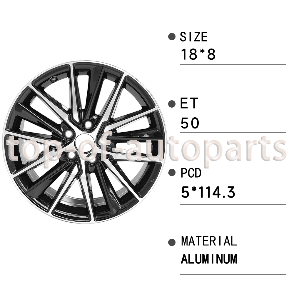 Product Description This is a brand new 18'' x 8" replacement aluminum alloy wheel for the 2021, 2022 and 2023 Toyota Camry made to original specifications and design. All specifications of the reproduction alloy and steel wheels sold at our store are made to factory specs. Wheel diameter, width, bolt pattern, offset, center bore, etc are factory specs to guarantee an exact fit guaranteed. Our industry connections and fitment knowledge offer our customer's the best price without sacrificing quality, customer service, or quick delivery. Direct Fit Replacement: This item is a direct fit replacement for the original 2021-2023 Toyota Camry wheel of the same finish and design. The factory center cap, lugs, and tire pressure sensors off the original wheel of this design will work on our wheel. Additional Fitments: This style wheel fits any 2018-2023 Toyota Camry with appropriate 18 inch size tires. It is a great upgrade for the Camry L, LE, or XLE models. Please contact us if you have any fitment questions. Package Included: This item is for the wheel only. Center caps, lugs, lug covers, tire pressure sensors, or other accessories are not included. Item specifics Condition: New Diameter : 18'' Width: 8'' Bolt Pattern: 114.3 Offset: 50 Finish: Machined w/ Black Style: 15-spoke Lugs: 5