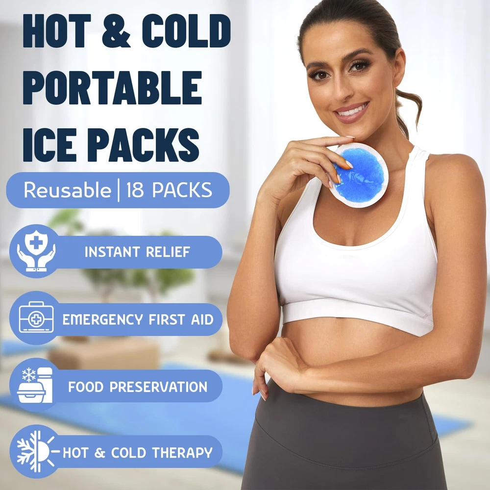 [WARM TIPS] The best cold compress effect is achieved by freezing in the refrigerator for more than 2 hours. If a hot compress is needed, please note that it should be heated in the microwave for less than 5 seconds and not continuously. [STILL SOFT AFTER FROZEN]: High-quality soft gel can keep our small ice packs soft and close to the skin after freezing in the refrigerator for several hours, so that the gel small ice bags can be fully close to the areas that need cold compress, providing better family first emergency care. [WHAT WILL YOU GET]: 18 Pack portable gel ice pack can be easily replaced at any time, meeting the daily needs of a large family. You can freeze them in the refrigerator for easy access at any time, it can be used in the office, school, home, or outdoor activities. [SAFETY & HIGH QUALITY]: The two sides are made of different materials, providing you with dual temperature requirements. One side is made of PVC material, which is colder, while the other side is made of non-woven fabric, which is more suitable for sensitive areas such as the forehead and face. This kids ice pack the non-woven fabric material on the back will not tear and has good sealing performance to prevent internal gel leakage. The interior is filled with high-quality non-toxic gel. These gel ice bags remain soft and flexible after being frozen in the refrigerator for several weeks. The small ice pack will be very cold, but it will not freeze like water. [COMPACT & PORTABLE]: The size of this small ice pack is designed for families, and the 4-inch reusable circular portable cold pack is more suitable for families. Whether it is for relieving eye fatigue, breastfeeding, wisdom tooth surgery, injections, cosmetic surgery, bumps, bruises, small wounds, fever, headache, hot and cold compress for various joint areas, or bento cooling. [AFTER-SALES SERVICE]: If you have any questions about the product or encounter any problems with your order, please feel free to contact us. Our service team will provide you with professional solutions.