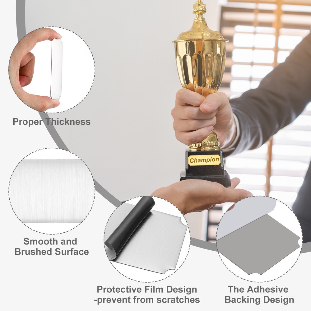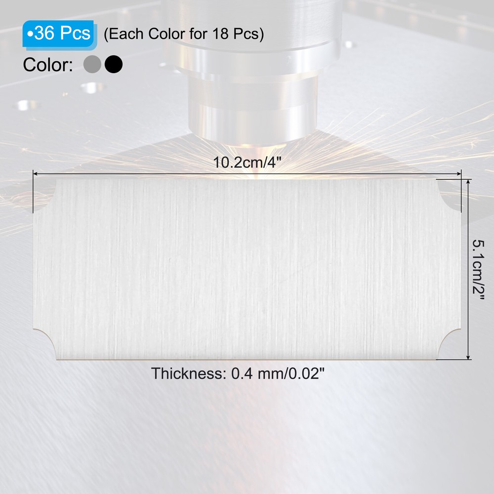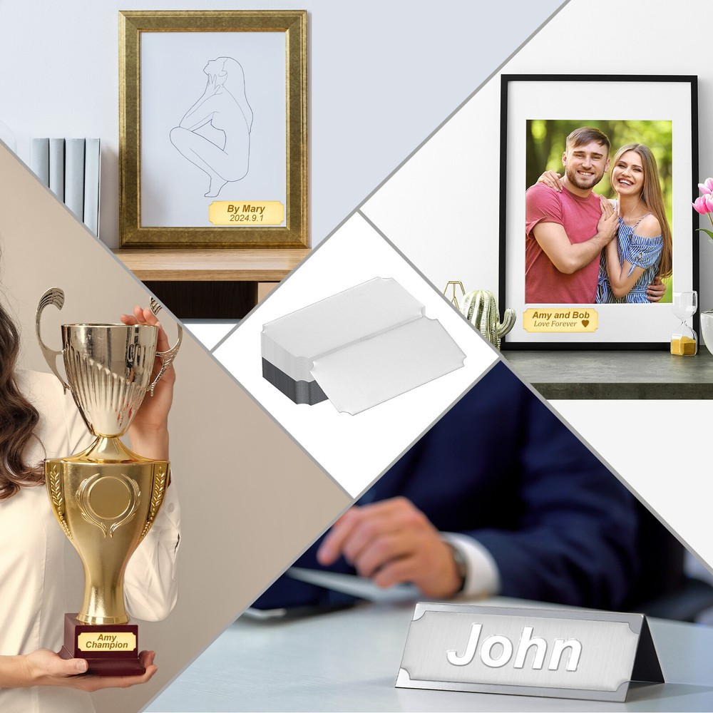 Document Our engraved nameplates are perfect for mounting on plaques, picture frames, sweaters, trophies, bags, display boxes, flag cases, and anything else.SpecificationMaterial: Stainless SteelColor: Silver/BlackSize: 10.2 x 5.1 cm/4 x 2 Inch(L*W)Thickness: 0.4 mm/0.02 InchPacking List: 18 Pcs x Engraved NameplateAdvantageOur engraved nameplates are made of brushed stainless steel which is durable, stable, not easy to fade, rust, or break, and can be used for a long time. With a smooth surface, it will not scratch your skin.The right thickness makes the plate stronger and allows for deeper engraving. These elegant nameplates have a beautiful luster and a simple design. Suitable for various crafts to add brilliance.The protective film design can effectively prevent scratches. The adhesive backing design allows you to stick this nameplate anywhere without any tools and it can be firmly on the objects.InstructionPlace a metal workbench block underneath the blank stamping tags for better stamping.NOTE:1. There may be light scratches and blemishes due to shipping, but they can be polished.2. Only for laser engraving, not suitable for mechanical engraving.3. Please remove the protective film before use. 18 Pcs 4" x 2" Engraved Name Plate Picture Frame Label Art Tag, Silver/Black Our engraved nameplates are perfect for mounting on plaques, picture frames, sweaters, trophies, bags, display boxes, flag cases, and anything else. Specification Material: Stainless Steel Color: Silver/Black Size: 10.2 x 5.1 cm/4 x 2 Inch(L*W) Thickness: 0.4 mm/0.02 Inch Packing List: 18 Pcs x Engraved Nameplate Advantage Our engraved nameplates are made of brushed stainless steel which is durable, stable, not easy to fade, rust, or break, and can be used for a long time. With a smooth surface, it will not scratch your skin. The right thickness makes the plate stronger and allows for deeper engraving. These elegant nameplates have a beautiful luster and a simple design. Suitable for various crafts to add brilliance. The protective film design can effectively prevent scratches. The adhesive backing design allows you to stick this nameplate anywhere without any tools and it can be firmly on the objects. Instruction Place a metal workbench block underneath the blank stamping tags for better stamping. NOTE: 1. There may be light scratches and blemishes due to shipping, but they can be polished. 2. Only for laser engraving, not suitable for mechanical engraving. 3. Please remove the protective film before use. Hot Item Payment 1.We accept eBay payment . 2.Payment must be received within 7 business days of auction closing. Shipping 1.We ship to your eBay or Paypal address. Please make sure your eBay and Paypal address is correct before you pay. 2.Items will be shipped within 1-3 business day when we received payment. 3.Delivery time depends on destination and other factors. Description Policy 18 Pcs 4" x 2" Engraved Name Plate Picture Frame Label Art Tag, Silver/Black Our engraved nameplates are perfect for mounting on plaques, picture frames, sweaters, trophies, bags, display boxes, flag cases, and anything else. Specification Material: Stainless Steel Color: Silver/Black Size: 10.2 x 5.1 cm/4 x 2 Inch(L*W) Thickness: 0.4 mm/0.02 Inch Packing List: 18 Pcs x Engraved Nameplate Advantage Our engraved nameplates are made of brushed stainless steel which is durable, stable, not easy to fade, rust, or break, and can be used for a long time. With a smooth surface, it will not scratch your skin. The right thickness makes the plate stronger and allows for deeper engraving. These elegant nameplates have a beautiful luster and a simple design. Suitable for various crafts to add brilliance. The protective film design can effectively prevent scratches. The adhesive backing design allows you to stick this nameplate anywhere without any tools and it can be firmly on the objects. Instruction Place a metal workbench block underneath the blank stamping tags for better stamping. NOTE: 1. There may be light scratches and blemishes due to shipping, but they can be polished. 2. Only for laser engraving, not suitable for mechanical engraving. 3. Please remove the protective film before use. Hot Item Payment 1.We accept eBay payment . 2.Payment must be received within 7 business days of auction closing. Shipping 1.We ship to your eBay or Paypal address. Please make sure your eBay and Paypal address is correct before you pay. 2.Items will be shipped within 1-3 business day when we received payment. 3.Delivery time depends on destination and other factors.