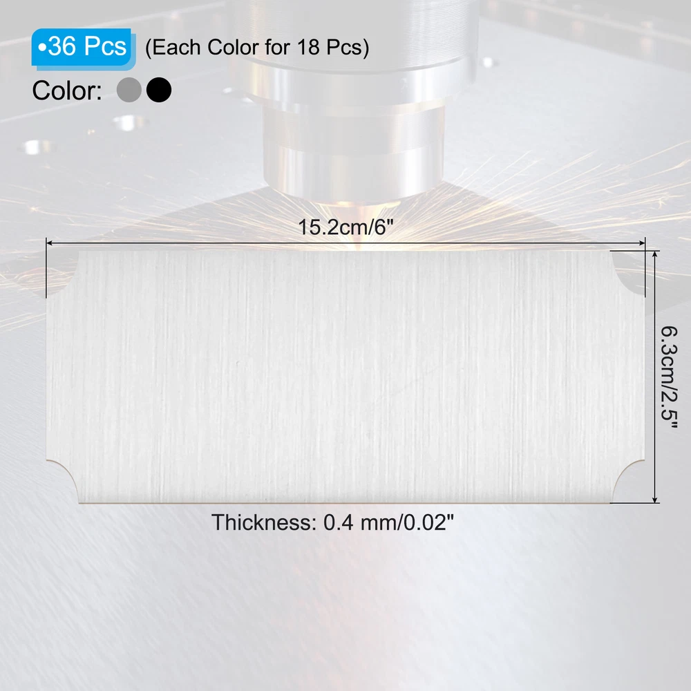 Document Our engraved nameplates are perfect for mounting on plaques, picture frames, sweaters, trophies, bags, display boxes, flag cases, and anything else.SpecificationMaterial: Stainless SteelColor: Silver/BlackSize: 15.2 x 6.3 cm/6 x 2.5 Inch(L*W)Thickness: 0.4 mm/0.02 InchPacking List: 18 Pcs x Engraved NameplateAdvantageOur engraved nameplates are made of brushed stainless steel which is durable, stable, not easy to fade, rust, or break, and can be used for a long time. With a smooth surface, it will not scratch your skin.The right thickness makes the plate stronger and allows for deeper engraving. These elegant nameplates have a beautiful luster and a simple design. Suitable for various crafts to add brilliance.The protective film design can effectively prevent scratches. The adhesive backing design allows you to stick this nameplate anywhere without any tools and it can be firmly on the objects.InstructionPlace a metal workbench block underneath the blank stamping tags for better stamping.NOTE:1. There may be light scratches and blemishes due to shipping, but they can be polished.2. Only for laser engraving, not suitable for mechanical engraving.3. Please remove the protective film before use. 18 Pcs 6" x 2.5" Engraved Name Plate Picture Frame Label Art Tag, Silver/Black Our engraved nameplates are perfect for mounting on plaques, picture frames, sweaters, trophies, bags, display boxes, flag cases, and anything else. Specification Material: Stainless Steel Color: Silver/Black Size: 15.2 x 6.3 cm/6 x 2.5 Inch(L*W) Thickness: 0.4 mm/0.02 Inch Packing List: 18 Pcs x Engraved Nameplate Advantage Our engraved nameplates are made of brushed stainless steel which is durable, stable, not easy to fade, rust, or break, and can be used for a long time. With a smooth surface, it will not scratch your skin. The right thickness makes the plate stronger and allows for deeper engraving. These elegant nameplates have a beautiful luster and a simple design. Suitable for various crafts to add brilliance. The protective film design can effectively prevent scratches. The adhesive backing design allows you to stick this nameplate anywhere without any tools and it can be firmly on the objects. Instruction Place a metal workbench block underneath the blank stamping tags for better stamping. NOTE: 1. There may be light scratches and blemishes due to shipping, but they can be polished. 2. Only for laser engraving, not suitable for mechanical engraving. 3. Please remove the protective film before use. Hot Item Payment 1.We accept eBay payment . 2.Payment must be received within 7 business days of auction closing. Shipping 1.We ship to your eBay or Paypal address. Please make sure your eBay and Paypal address is correct before you pay. 2.Items will be shipped within 1-3 business day when we received payment. 3.Delivery time depends on destination and other factors. Description Policy 18 Pcs 6" x 2.5" Engraved Name Plate Picture Frame Label Art Tag, Silver/Black Our engraved nameplates are perfect for mounting on plaques, picture frames, sweaters, trophies, bags, display boxes, flag cases, and anything else. Specification Material: Stainless Steel Color: Silver/Black Size: 15.2 x 6.3 cm/6 x 2.5 Inch(L*W) Thickness: 0.4 mm/0.02 Inch Packing List: 18 Pcs x Engraved Nameplate Advantage Our engraved nameplates are made of brushed stainless steel which is durable, stable, not easy to fade, rust, or break, and can be used for a long time. With a smooth surface, it will not scratch your skin. The right thickness makes the plate stronger and allows for deeper engraving. These elegant nameplates have a beautiful luster and a simple design. Suitable for various crafts to add brilliance. The protective film design can effectively prevent scratches. The adhesive backing design allows you to stick this nameplate anywhere without any tools and it can be firmly on the objects. Instruction Place a metal workbench block underneath the blank stamping tags for better stamping. NOTE: 1. There may be light scratches and blemishes due to shipping, but they can be polished. 2. Only for laser engraving, not suitable for mechanical engraving. 3. Please remove the protective film before use. Hot Item Payment 1.We accept eBay payment . 2.Payment must be received within 7 business days of auction closing. Shipping 1.We ship to your eBay or Paypal address. Please make sure your eBay and Paypal address is correct before you pay. 2.Items will be shipped within 1-3 business day when we received payment. 3.Delivery time depends on destination and other factors.