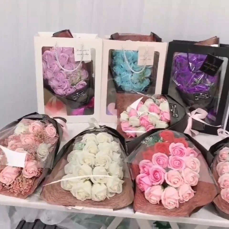 Introducing our exquisite Eternal Rose Soap Flower Bouquet, the perfect gift for any occasion! This stunning bouquet features a vibrant array of 18 gradient flowers in beautiful shades of red, pink, blue, and purple, creating a visually captivating display that will brighten anyone's day. Crafted with care, these soap flowers look beautiful and emit a delightful fragrance, adding a touch of elegance to any room. Packaged in a stylish gift box, this bouquet is ready to impress your loved ones right out of the box. Ideal for birthdays, anniversaries, Valentine's Day, or just as a thoughtful gesture to show you care, our Handmade Soap Flower Bouquet is a unique and memorable gift that will leave a lasting impression. Treat someone special today! Product information: Material: Soap flower Craft: Handmade Type: Bouquet Packing: Gift box Color: 18 new gradient red flowers, 18 new gradient pink flowers, 18 new gradient blue flowers, 18 new gradient purple flowers Packing list: Rose soap flower x1