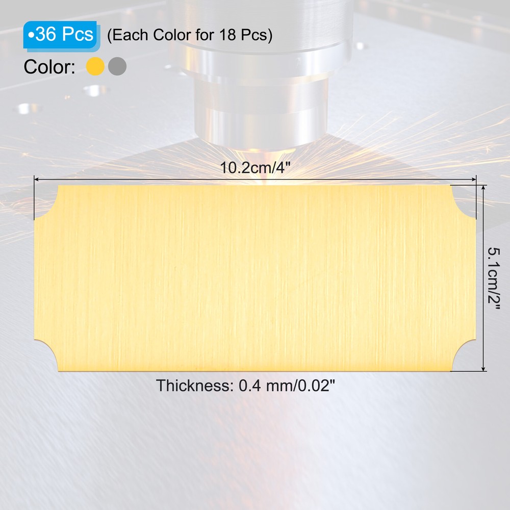 Document Our engraved nameplates are perfect for mounting on plaques, picture frames, sweaters, trophies, bags, display boxes, flag cases, and anything else.SpecificationMaterial: Stainless SteelColor: Silver/GoldSize: 10.2 x 5.1 cm/4 x 2 Inch(L*W)Thickness: 0.4 mm/0.02 InchPacking List: 18 Pcs x Engraved NameplateAdvantageOur engraved nameplates are made of brushed stainless steel which is durable, stable, not easy to fade, rust, or break, and can be used for a long time. With a smooth surface, it will not scratch your skin.The right thickness makes the plate stronger and allows for deeper engraving. These elegant nameplates have a beautiful luster and a simple design. Suitable for various crafts to add brilliance.The protective film design can effectively prevent scratches. The adhesive backing design allows you to stick this nameplate anywhere without any tools and it can be firmly on the objects.InstructionPlace a metal workbench block underneath the blank stamping tags for better stamping.NOTE:1. There may be light scratches and blemishes due to shipping, but they can be polished.2. Only for laser engraving, not suitable for mechanical engraving.3. Please remove the protective film before use. 18 Pcs 4" x 2" Engraved Name Plate Picture Frame Label Art Tag, Silver/Gold Our engraved nameplates are perfect for mounting on plaques, picture frames, sweaters, trophies, bags, display boxes, flag cases, and anything else. Specification Material: Stainless Steel Color: Silver/Gold Size: 10.2 x 5.1 cm/4 x 2 Inch(L*W) Thickness: 0.4 mm/0.02 Inch Packing List: 18 Pcs x Engraved Nameplate Advantage Our engraved nameplates are made of brushed stainless steel which is durable, stable, not easy to fade, rust, or break, and can be used for a long time. With a smooth surface, it will not scratch your skin. The right thickness makes the plate stronger and allows for deeper engraving. These elegant nameplates have a beautiful luster and a simple design. Suitable for various crafts to add brilliance. The protective film design can effectively prevent scratches. The adhesive backing design allows you to stick this nameplate anywhere without any tools and it can be firmly on the objects. Instruction Place a metal workbench block underneath the blank stamping tags for better stamping. NOTE: 1. There may be light scratches and blemishes due to shipping, but they can be polished. 2. Only for laser engraving, not suitable for mechanical engraving. 3. Please remove the protective film before use. Hot Item Payment 1.We accept eBay payment . 2.Payment must be received within 7 business days of auction closing. Shipping 1.We ship to your eBay or Paypal address. Please make sure your eBay and Paypal address is correct before you pay. 2.Items will be shipped within 1-3 business day when we received payment. 3.Delivery time depends on destination and other factors. Description Policy 18 Pcs 4" x 2" Engraved Name Plate Picture Frame Label Art Tag, Silver/Gold Our engraved nameplates are perfect for mounting on plaques, picture frames, sweaters, trophies, bags, display boxes, flag cases, and anything else. Specification Material: Stainless Steel Color: Silver/Gold Size: 10.2 x 5.1 cm/4 x 2 Inch(L*W) Thickness: 0.4 mm/0.02 Inch Packing List: 18 Pcs x Engraved Nameplate Advantage Our engraved nameplates are made of brushed stainless steel which is durable, stable, not easy to fade, rust, or break, and can be used for a long time. With a smooth surface, it will not scratch your skin. The right thickness makes the plate stronger and allows for deeper engraving. These elegant nameplates have a beautiful luster and a simple design. Suitable for various crafts to add brilliance. The protective film design can effectively prevent scratches. The adhesive backing design allows you to stick this nameplate anywhere without any tools and it can be firmly on the objects. Instruction Place a metal workbench block underneath the blank stamping tags for better stamping. NOTE: 1. There may be light scratches and blemishes due to shipping, but they can be polished. 2. Only for laser engraving, not suitable for mechanical engraving. 3. Please remove the protective film before use. Hot Item Payment 1.We accept eBay payment . 2.Payment must be received within 7 business days of auction closing. Shipping 1.We ship to your eBay or Paypal address. Please make sure your eBay and Paypal address is correct before you pay. 2.Items will be shipped within 1-3 business day when we received payment. 3.Delivery time depends on destination and other factors.