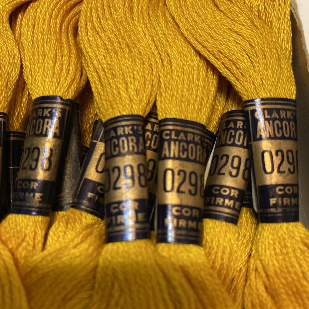 This product is a lot of 18 skeins of yellow cotton embroidery floss, each containing 8 meters of thread. It is Clarks brand, 6 ply stranded cotton, suitable for cross stitch and needlepoint projects. The floss is unused and perfect for hand embroidery, making it a great addition to any crafter's collection.