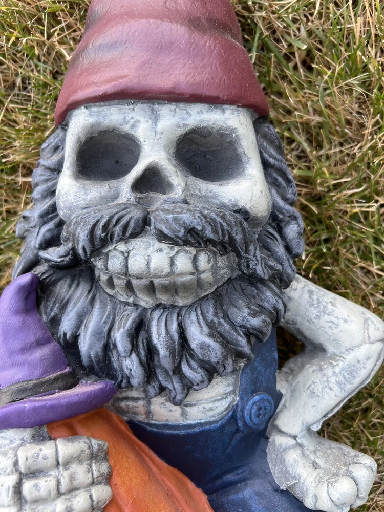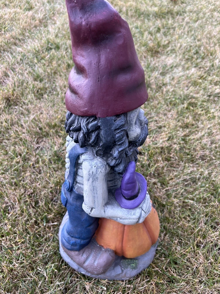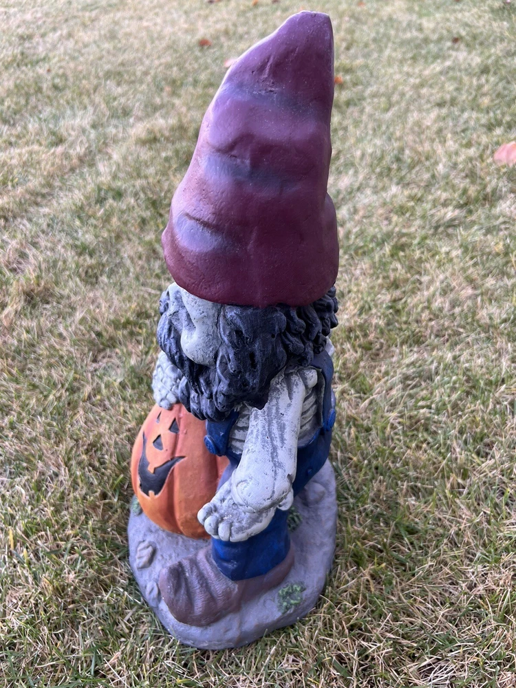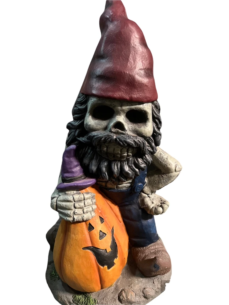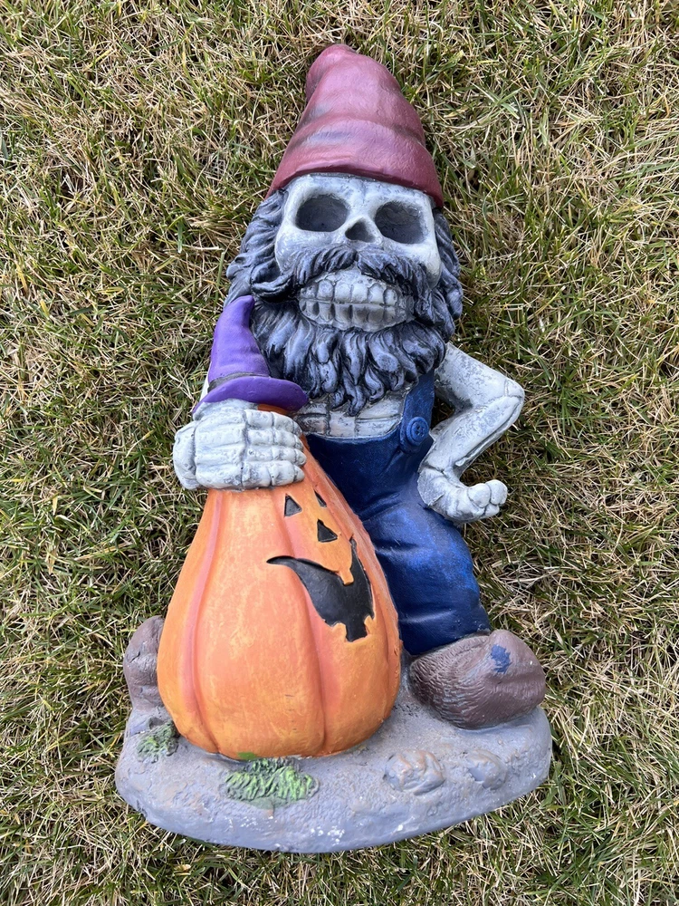 Add a spooky touch to your lawn this Halloween with this 18" tall skeleton gnome with a pumpkin decoration. The unique design features a composite and ceramic material with a gnome subject holding a pumpkin. This yard decoration is perfect for Halloween and will look great in any lawn, garden, or outdoor living area. The item length is unspecified, but its item height is 18" with a width of 10". The design house brand guarantees a quality product that will last. This item is made in China and does not have any California Prop 65 warning. The pattern can be referred to from the item photo. Get ready to spook your neighbors and create a unique Halloween atmosphere with this amazing decoration!