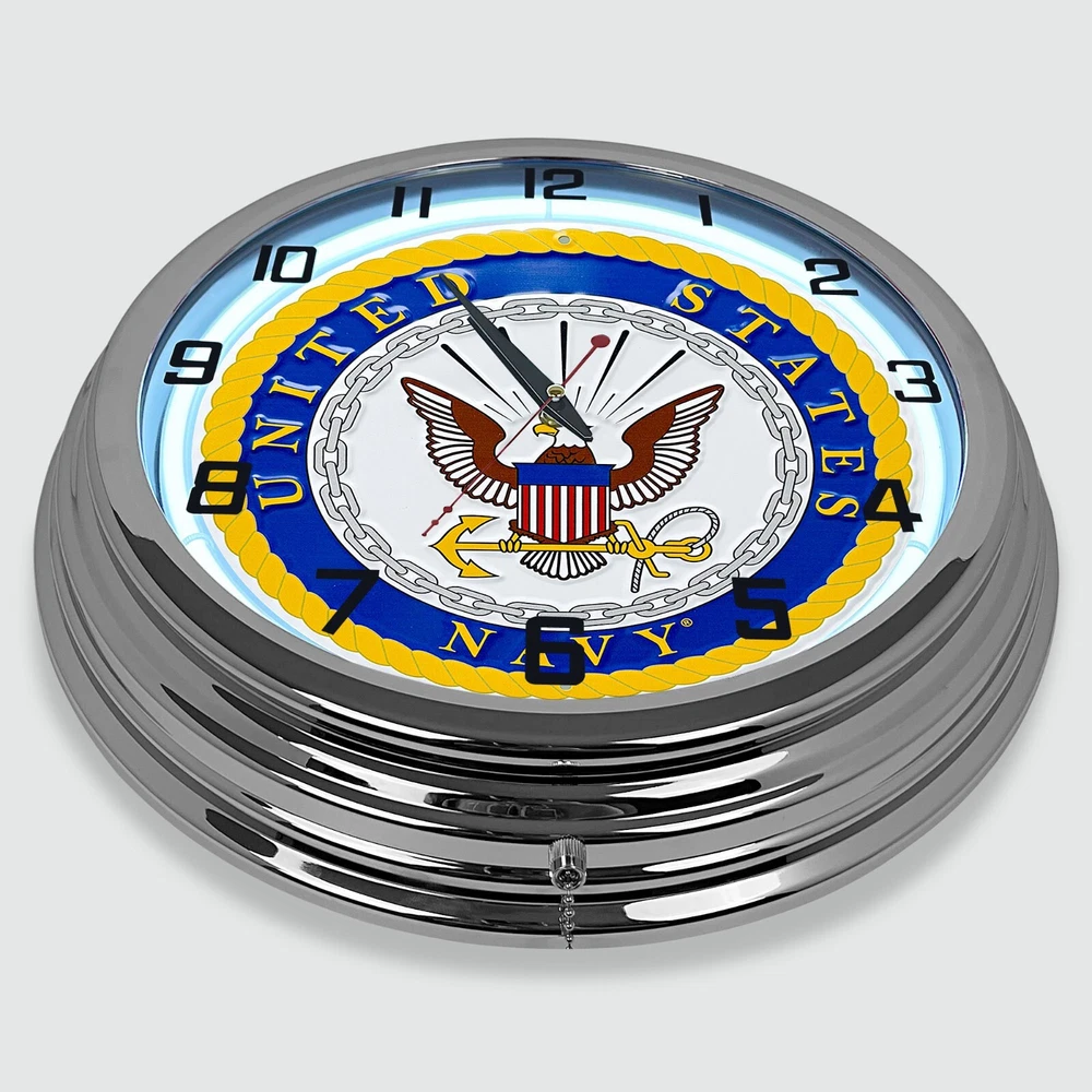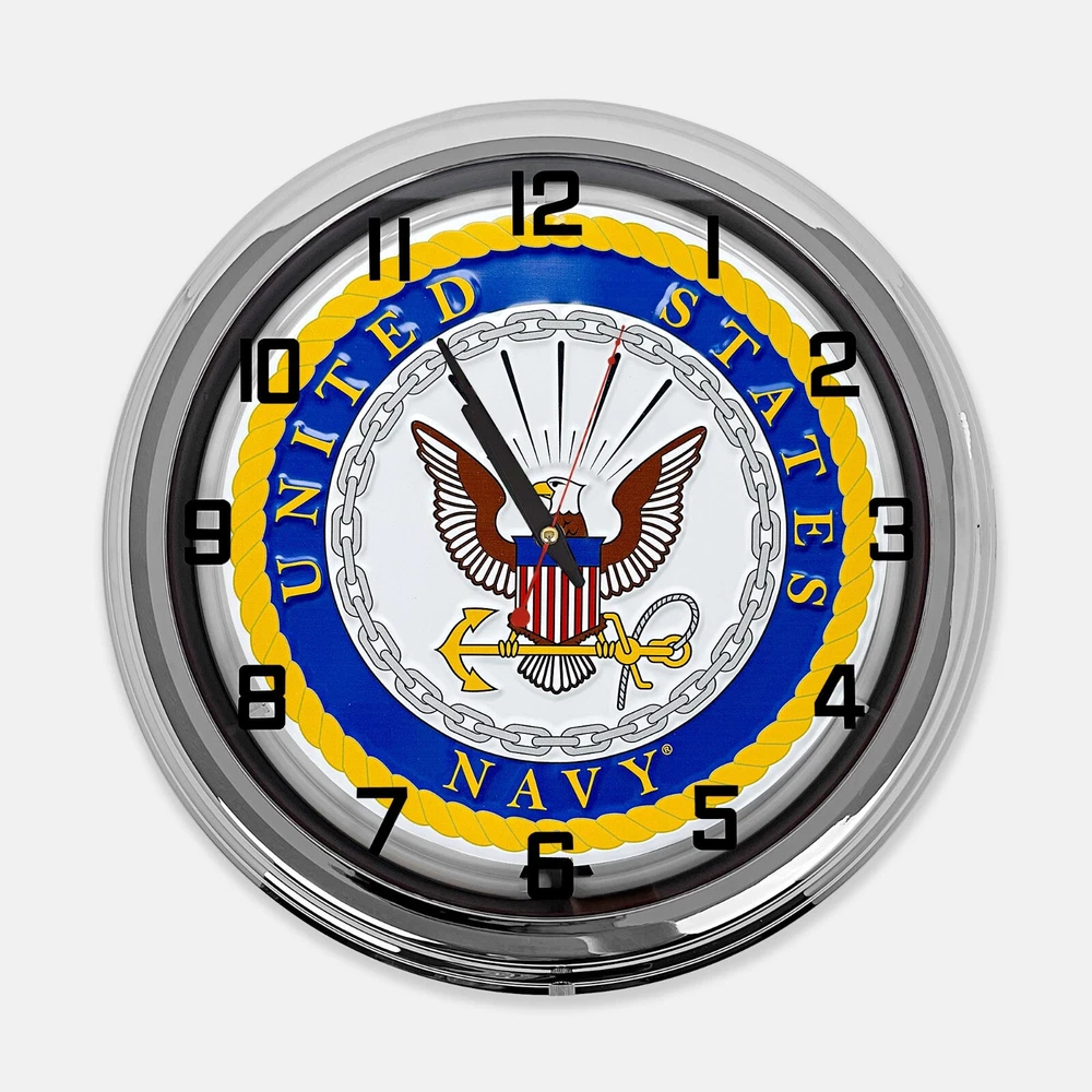 *Product is officially licensed. *Licensing information is printed on front or back of sign. *Image of licensed holographic logo or serialized QR code is in pictures. 18" United States Navy Metal Sign Designed White Neon Clock - SIGNBOX-QLN720317 2.5" Inch Thick Triple Outer Bevel White Neon Handmade Ships from a Small Business in Ohio Materials: Metal, Steel Width: 17.25 inches Height: 17.25 inches Depth: 2.50 inches