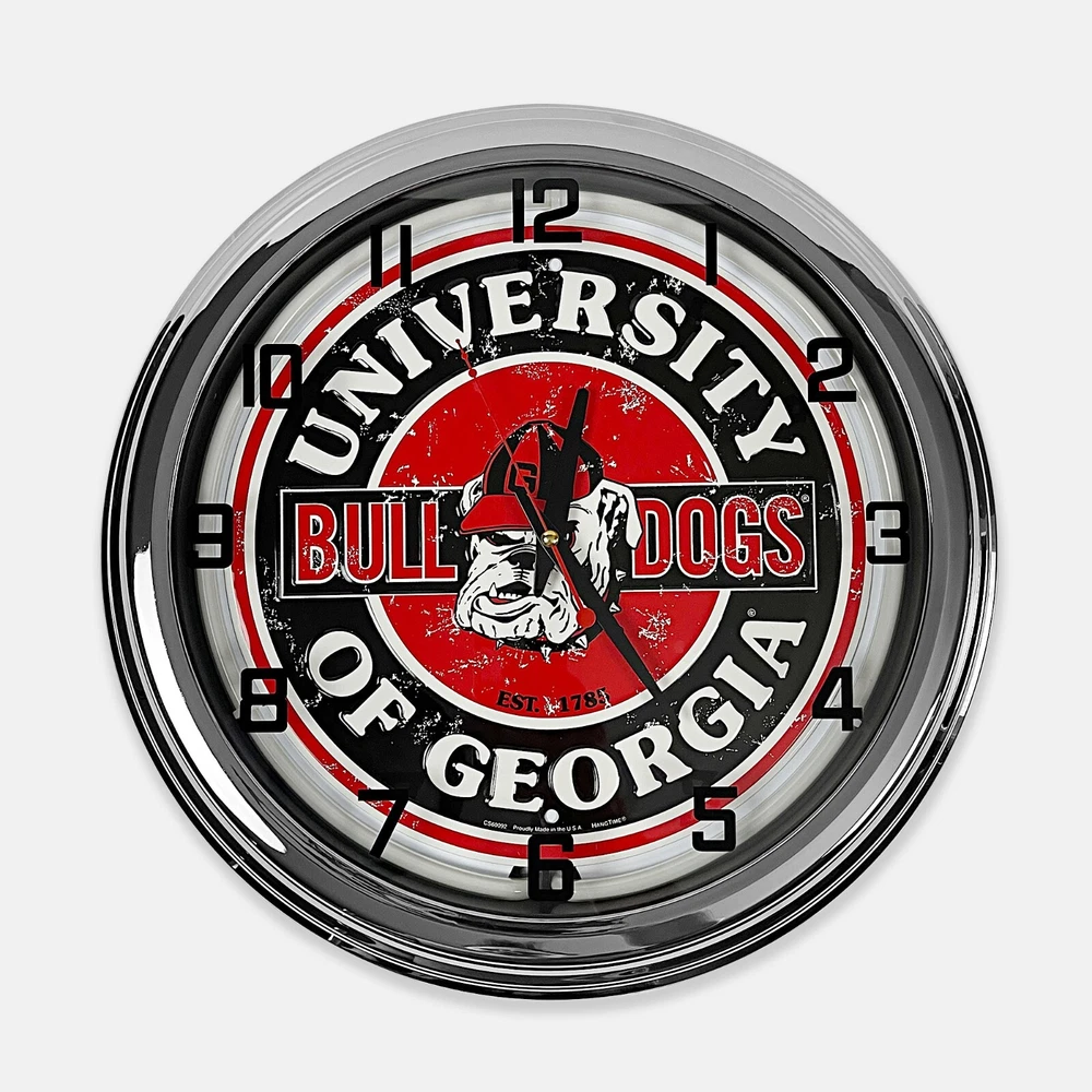 *Product is officially licensed. *Licensing information is printed on front or back of sign. *Image of licensed holographic logo or serialized QR code is in pictures. 18" University of Georgia Bulldogs Metal Sign Designed White Neon Clock - SIGNBOX-QLN720350 2.5" Inch Thick Triple Outer Bevel White Neon Handmade Ships from a Small Business in Ohio Materials: Metal, Steel Width: 17.25 inches Height: 17.25 inches Depth: 2.50 inches