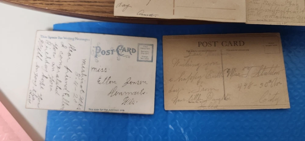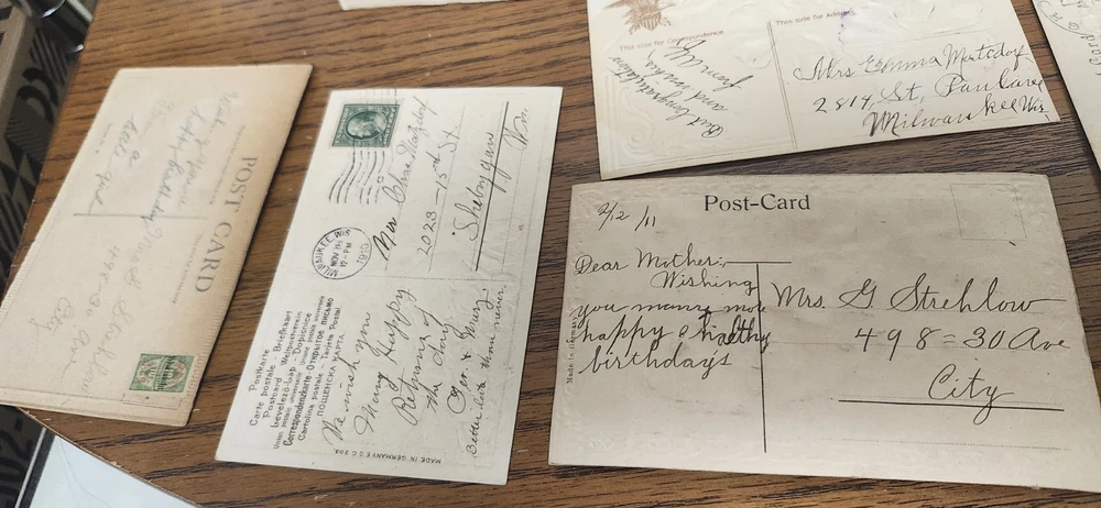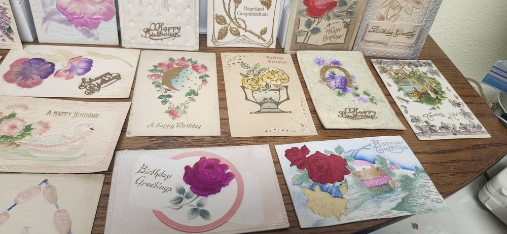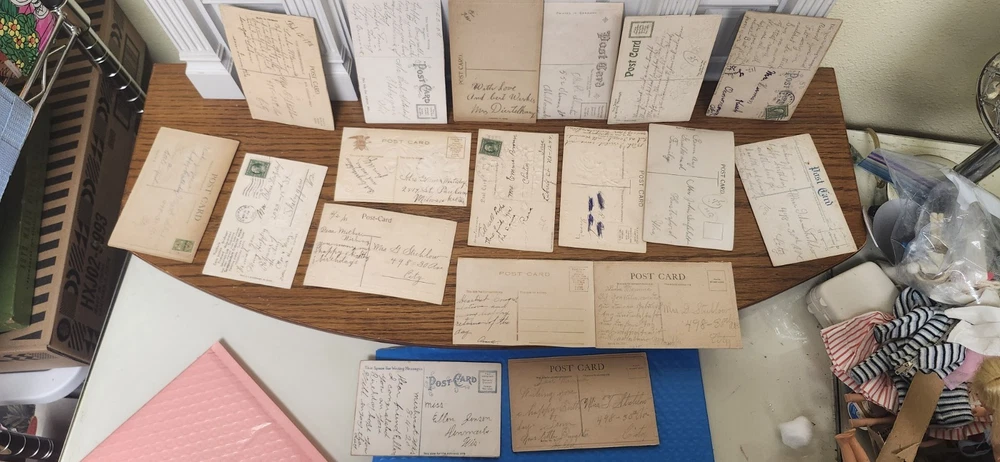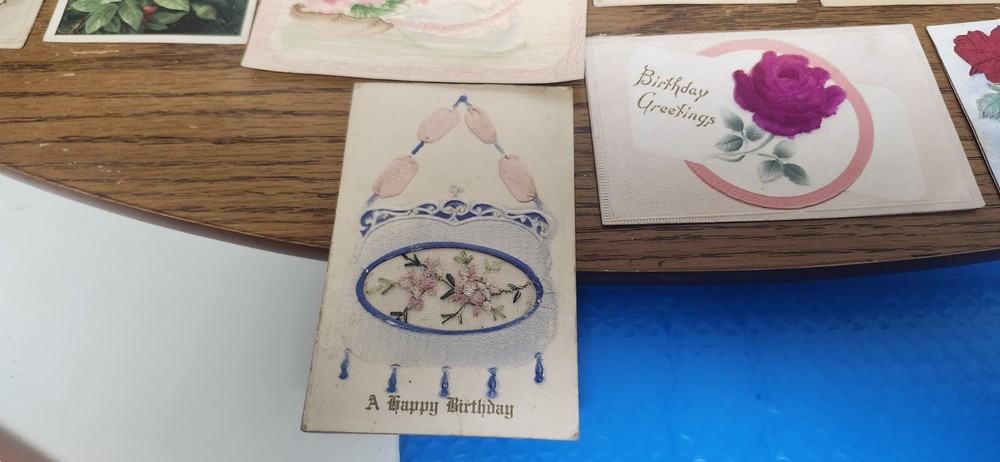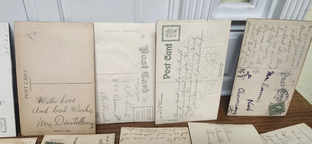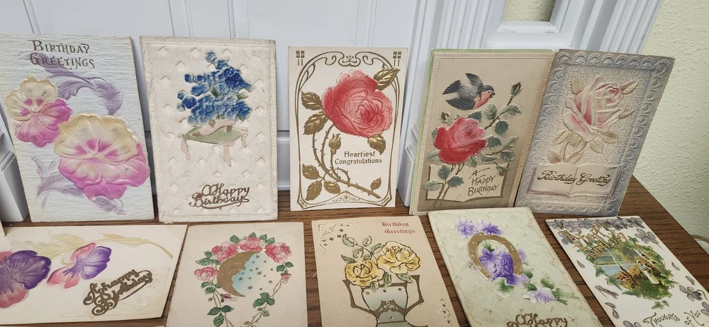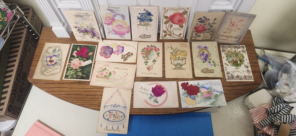 This product is a set of 18 vintage postcards from the early 1900s, perfect for celebrating a birthday. Each postcard is an original piece from the specified time period, adding a unique touch to any collection or correspondence. These postcards offer a glimpse into the past and can serve as a charming and nostalgic way to send birthday wishes to a loved one. Please examine photos they are part of description. One is stamped with a vintage green stamp